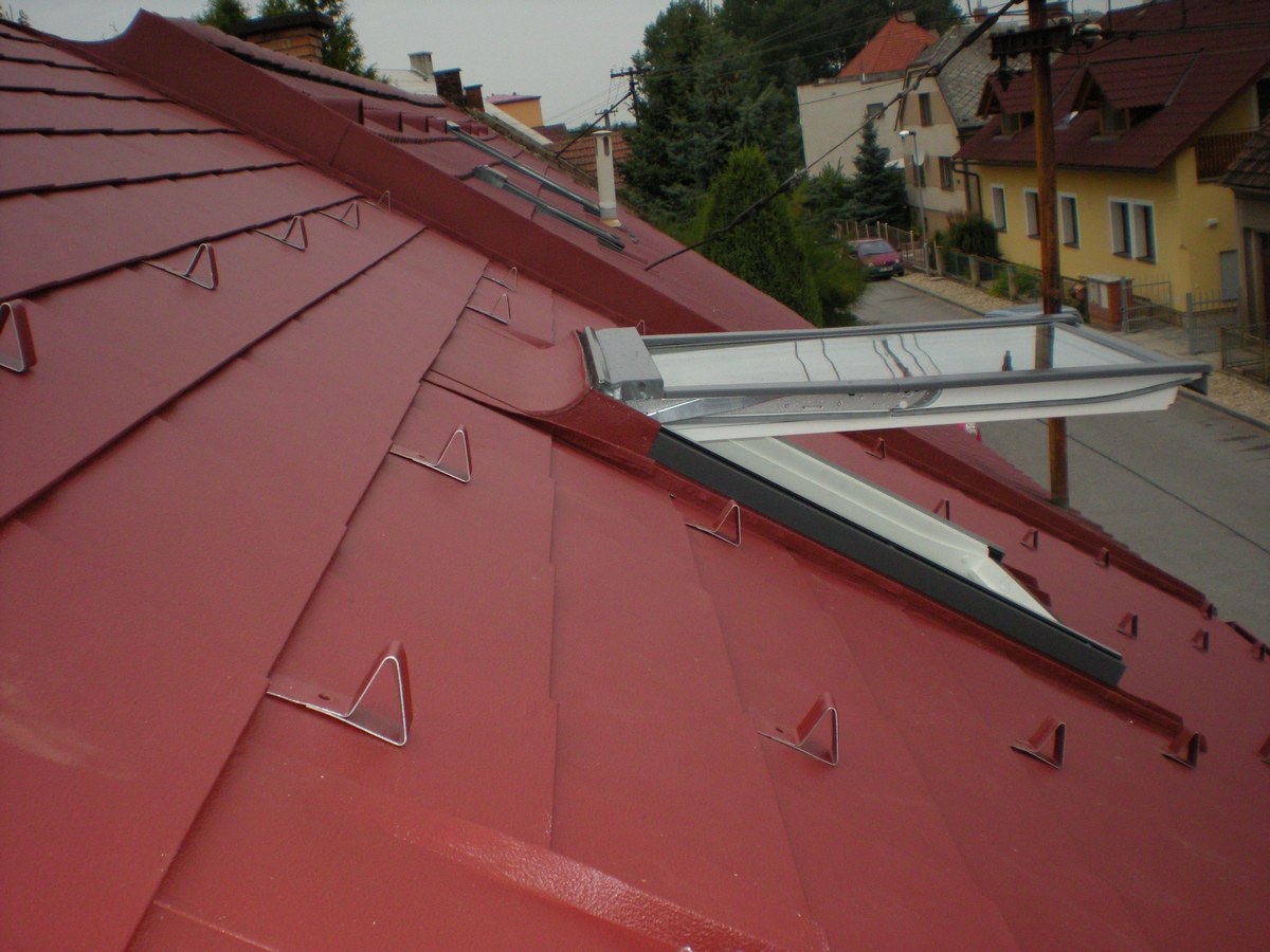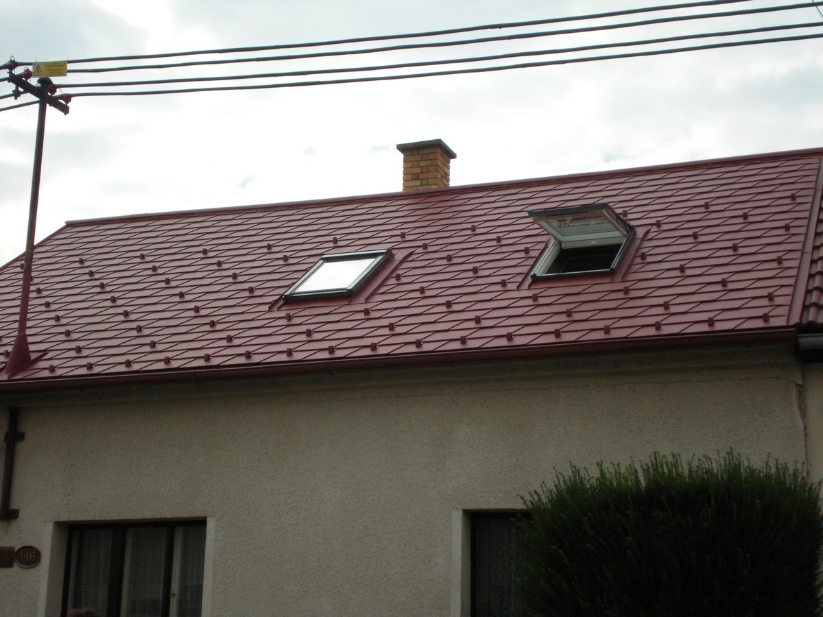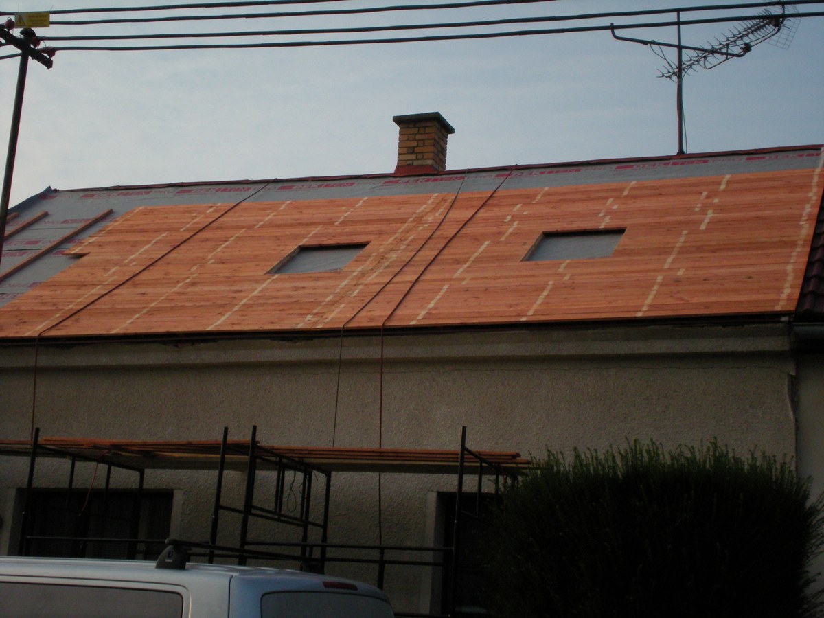 Demontáž střechy, difůzní folie, odvětraná střecha, 2 okna Velux včetně BDX, montáž krytiny falcovaný šindel Prefa, tmavě červená P.10