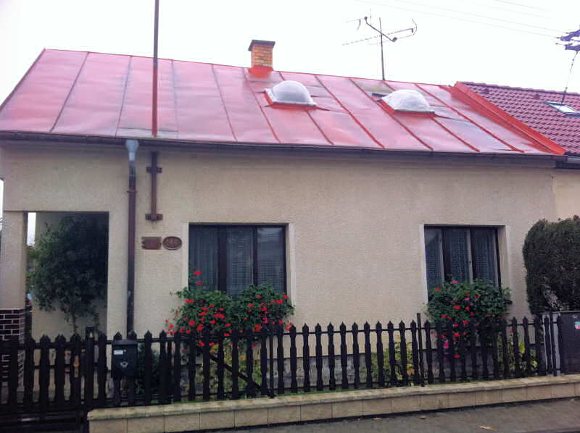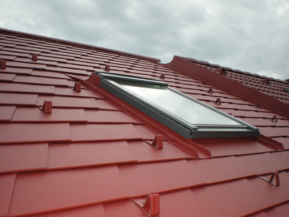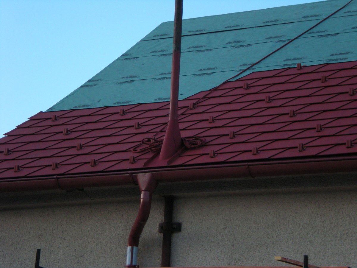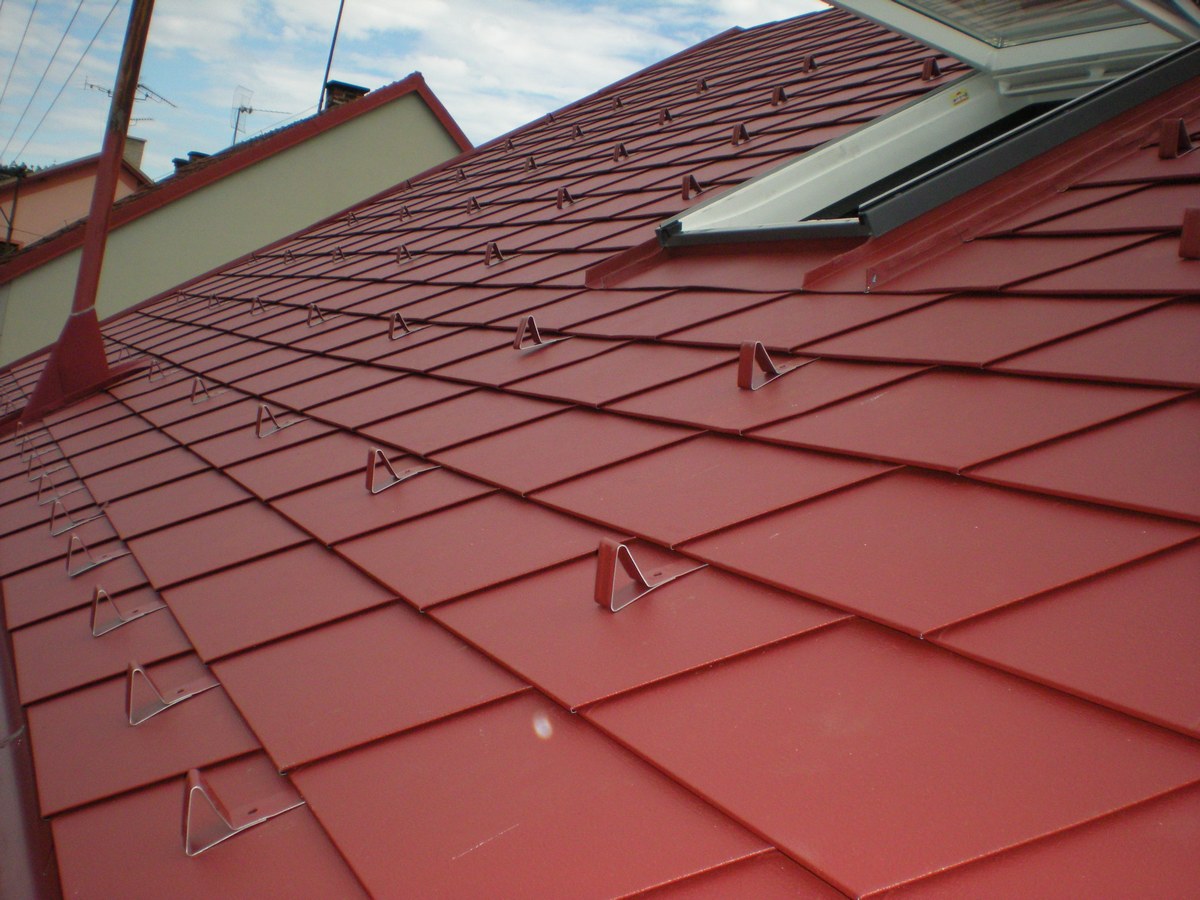 Demontáž střechy, difůzní folie, odvětraná střecha, 2 okna Velux včetně BDX, montáž krytiny falcovaný šindel Prefa, tmavě červená P.10
