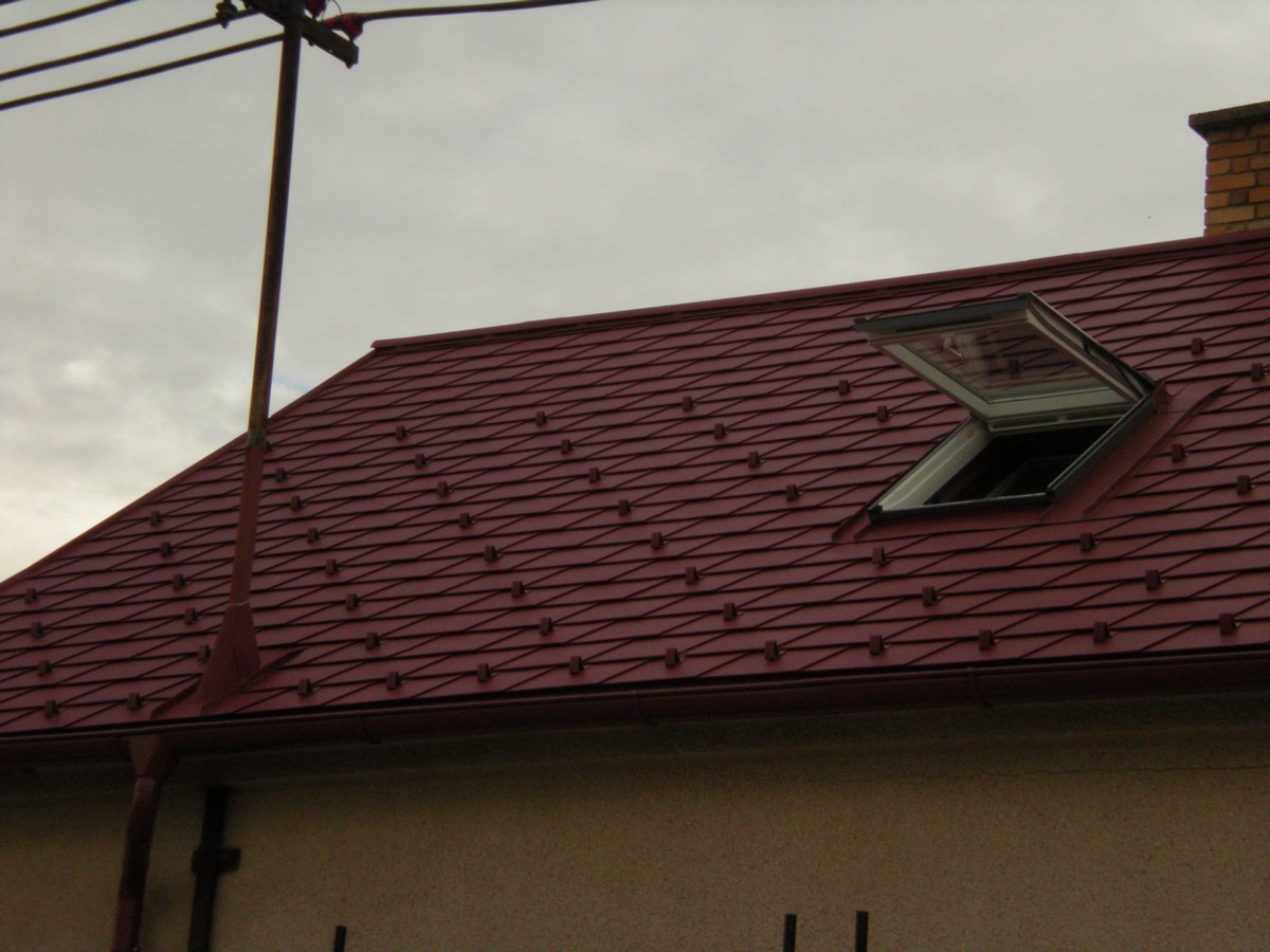 Demontáž střechy, difůzní folie, odvětraná střecha, 2 okna Velux včetně BDX, montáž krytiny falcovaný šindel Prefa, tmavě červená P.10