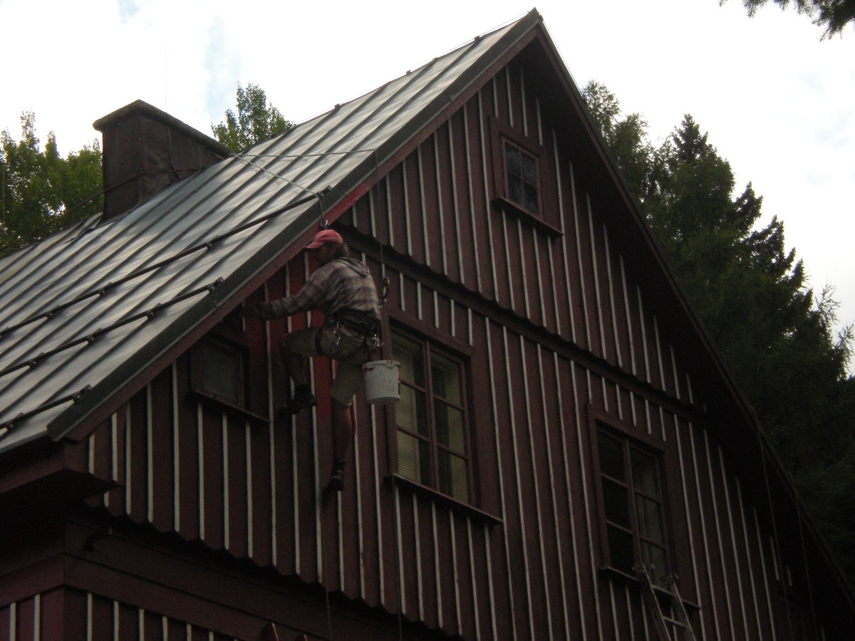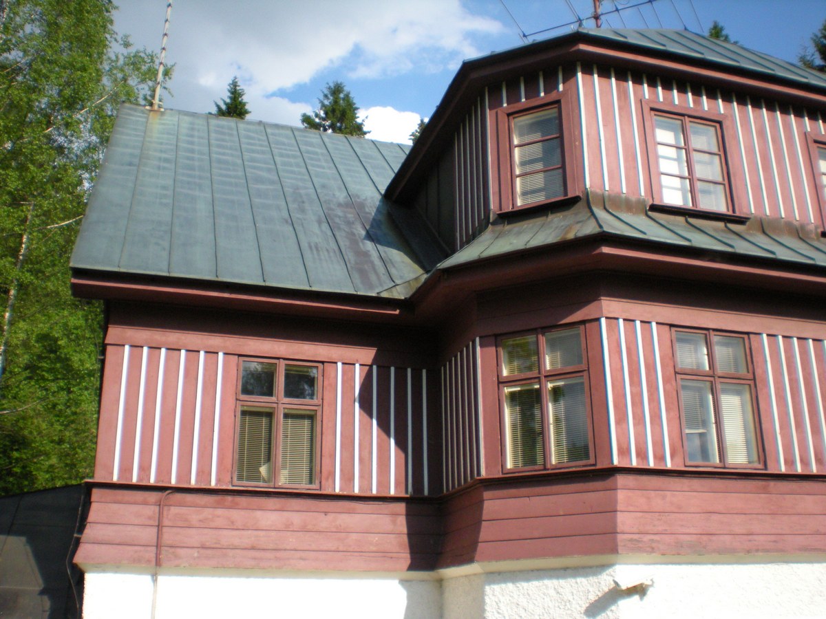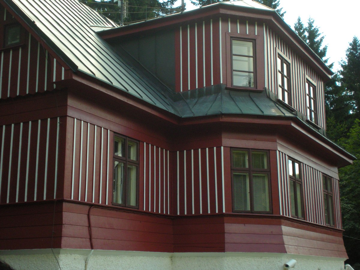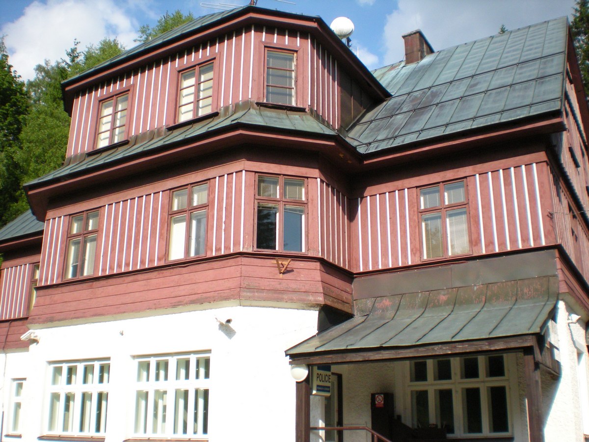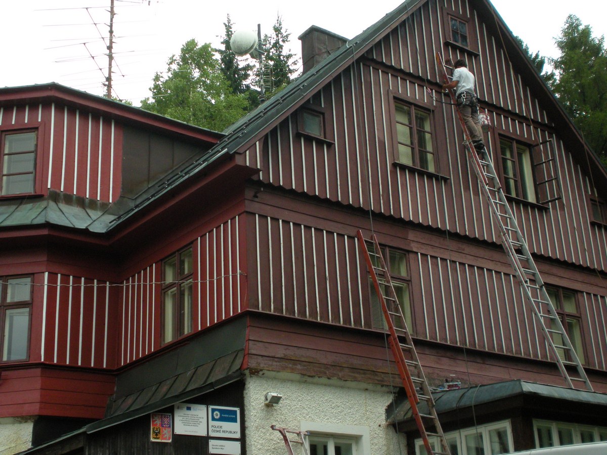 Kompletní obroušení dřevěné fasády, penetrace a trojitý nátěr barvou Tikkurila na objektu Policie ČR, Špindlerův Mlýn