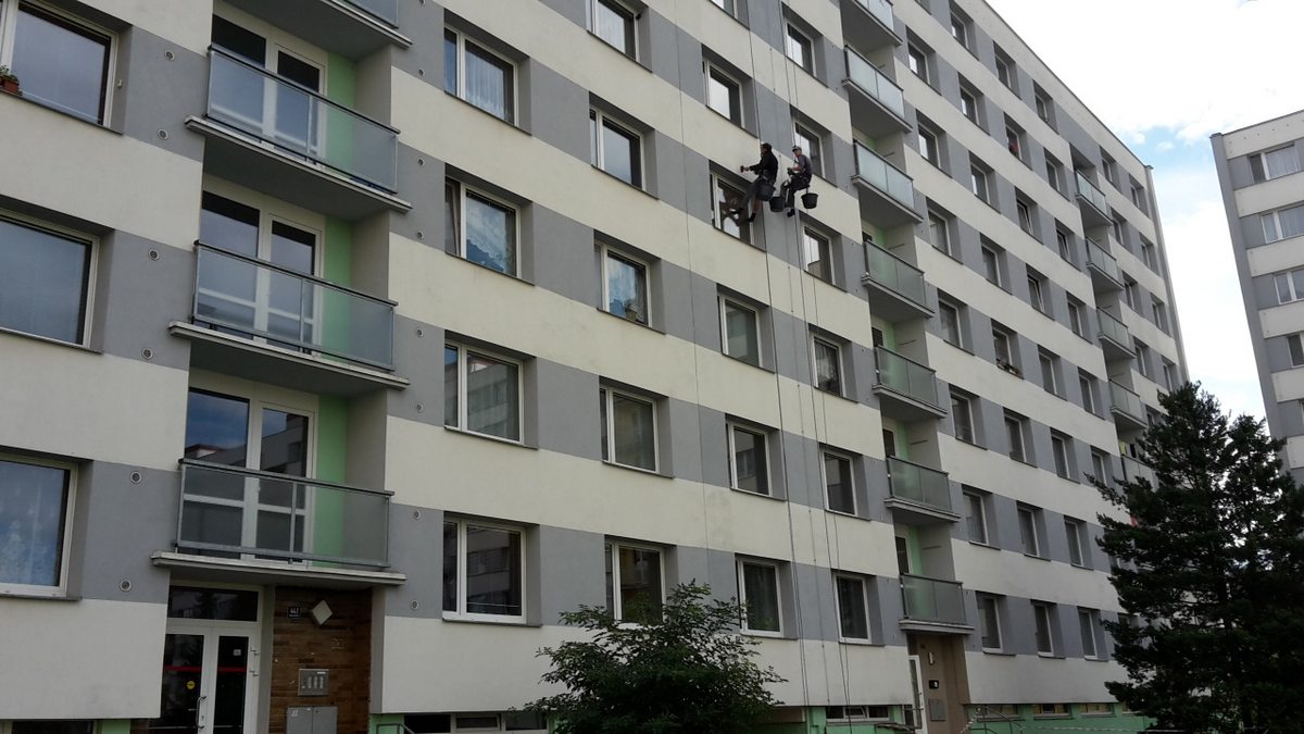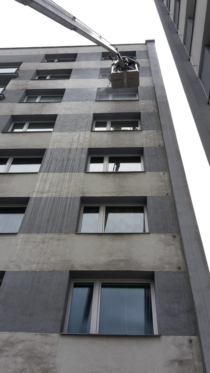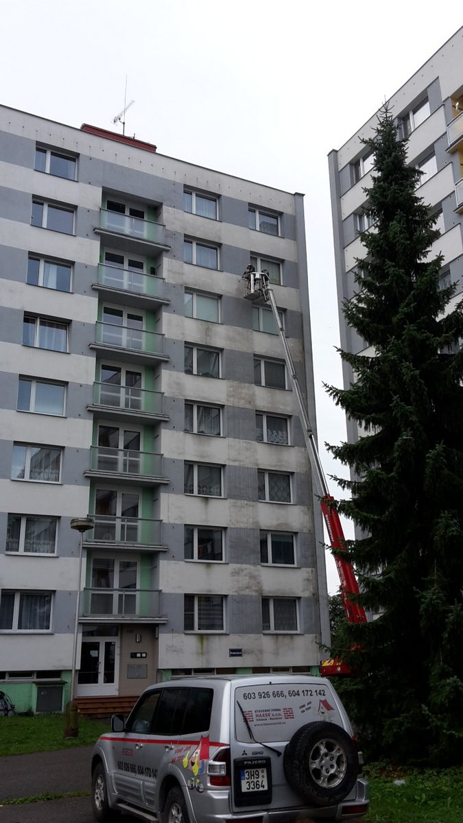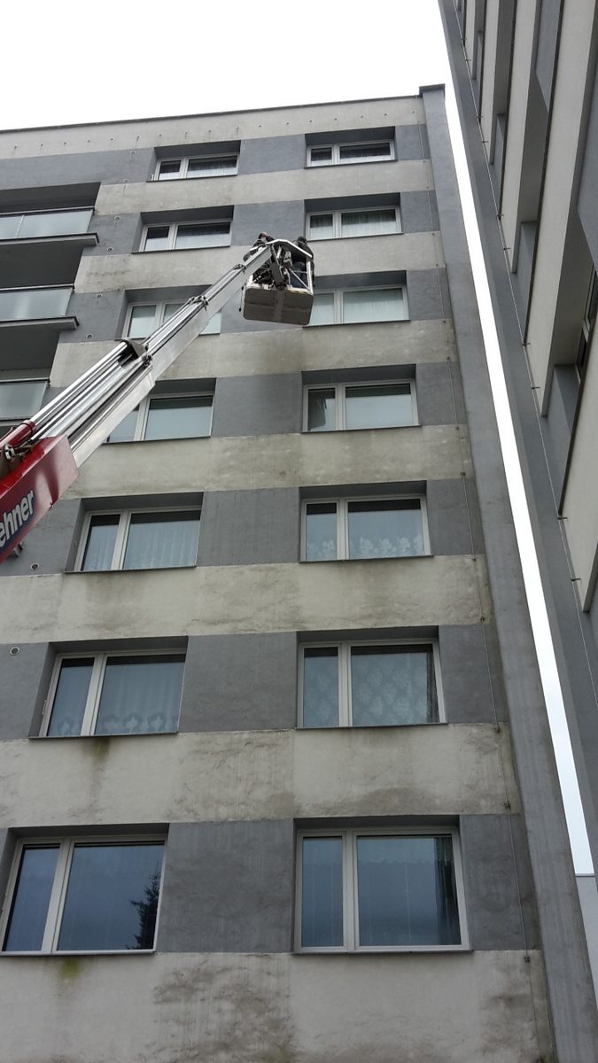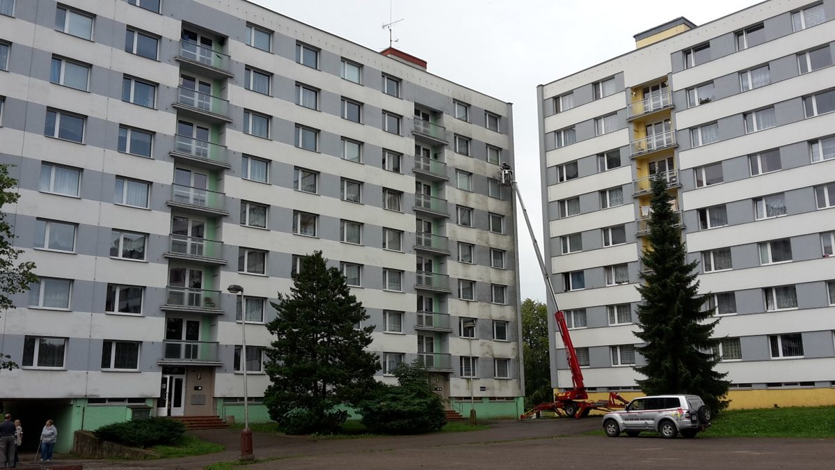 Mytí fasády, mytí fasády panelového domu, čištění fasády od mechu, plísní a nečistot pomocí vysokozdvižné plošiny,
