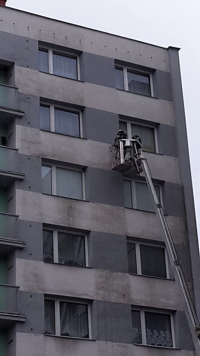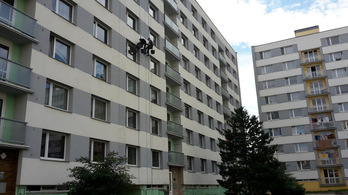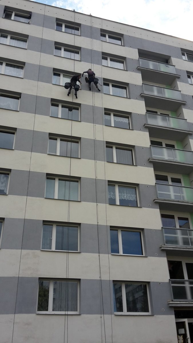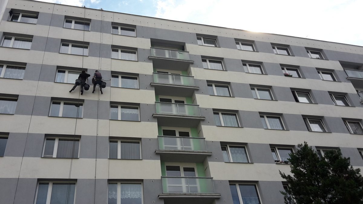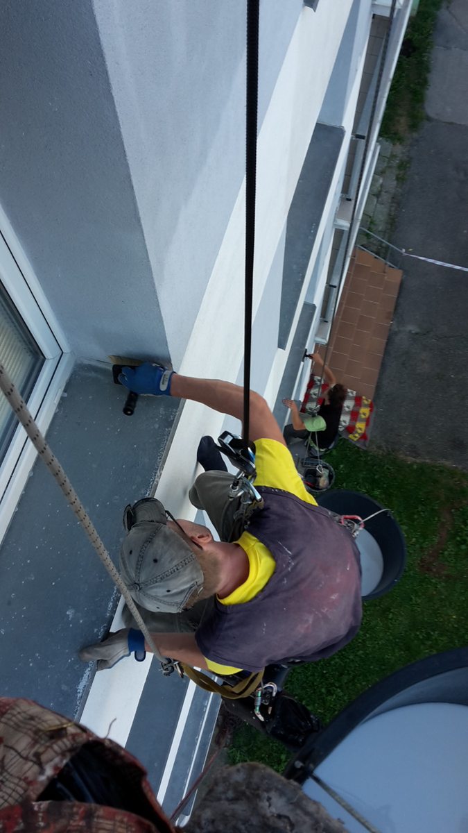 následně byl proveden nátěr fasády speciální přípravkem proti tvorbě plísní pomocí horolezecké techniky.