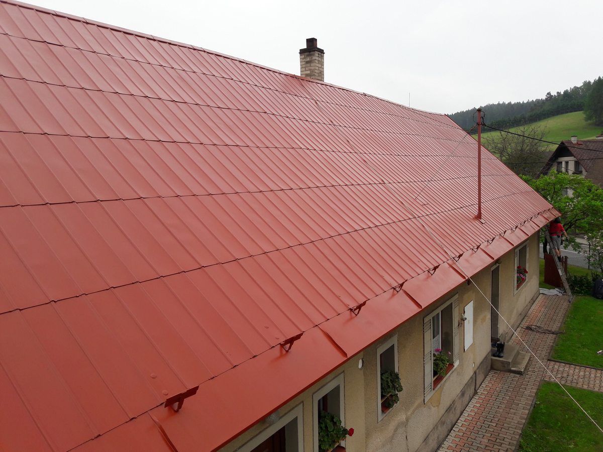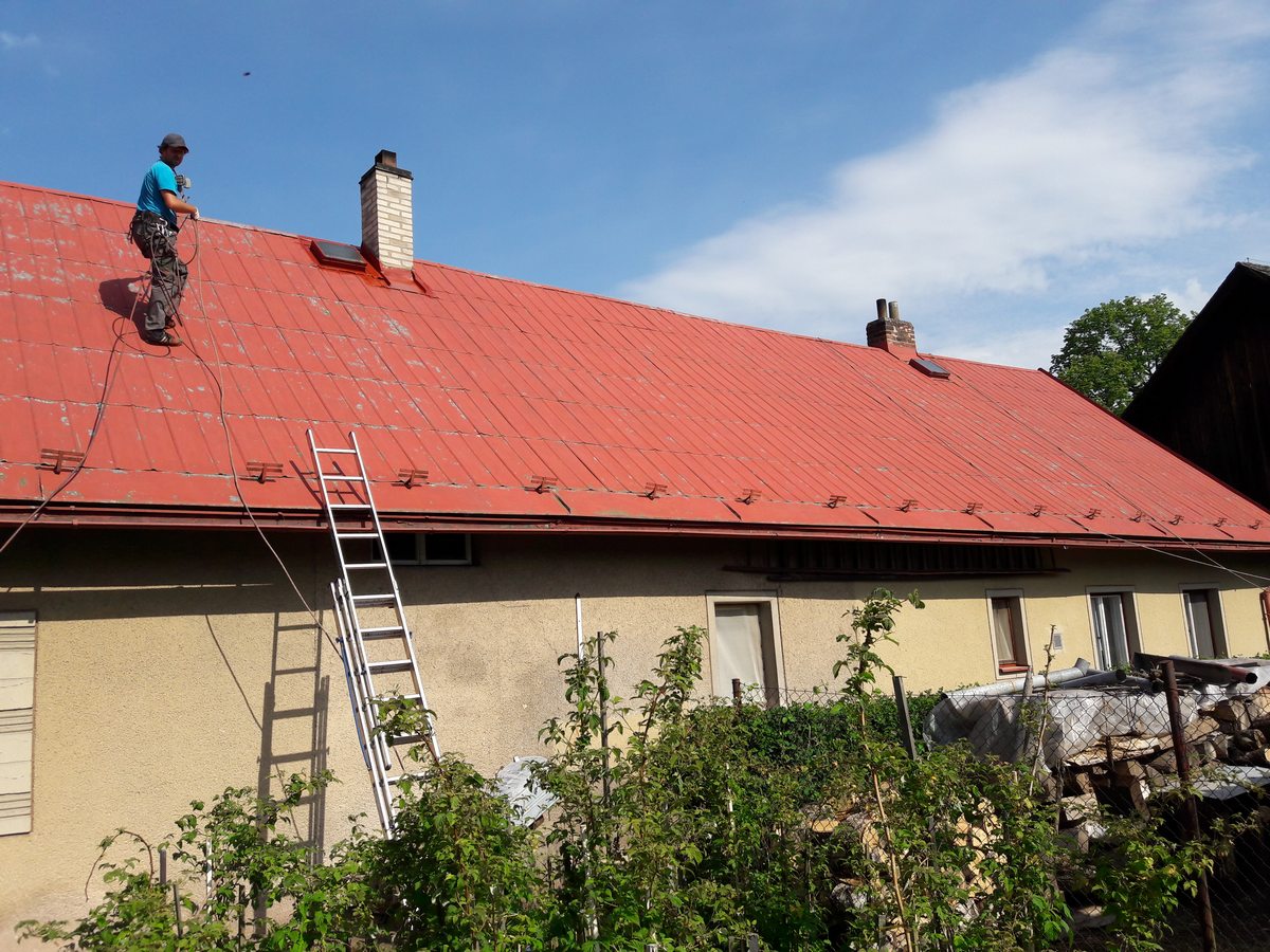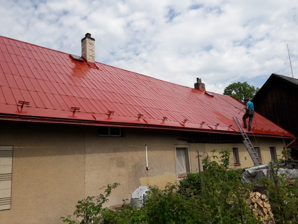 Nátěr alukrytové střechy, včetně výměny žlabů a svodů.