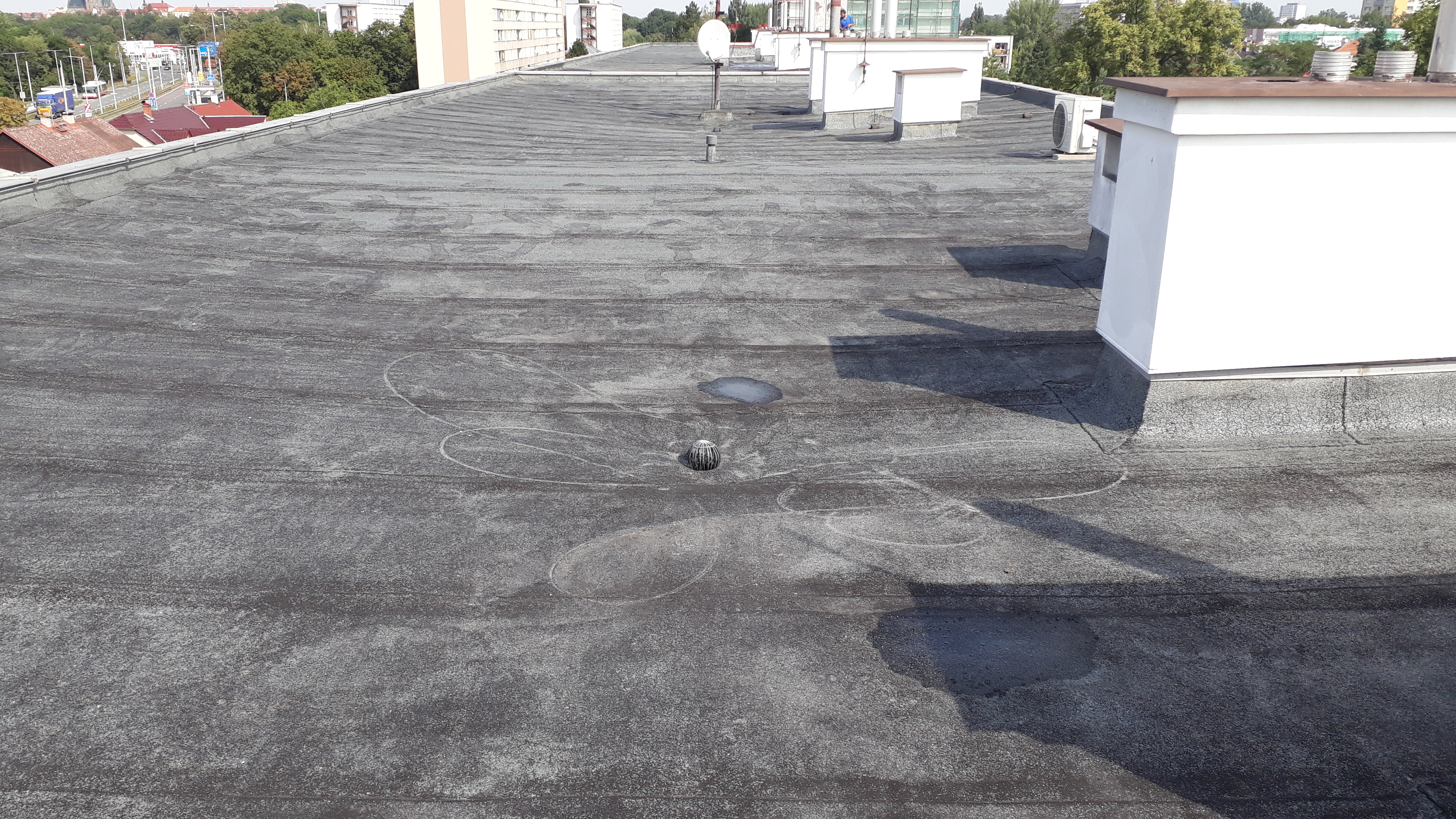 Nátěr asfaltové ploché střechy, očištění přístrojem Wap, trojitý nátěr, ošetření povrchu, nátěr atik,
