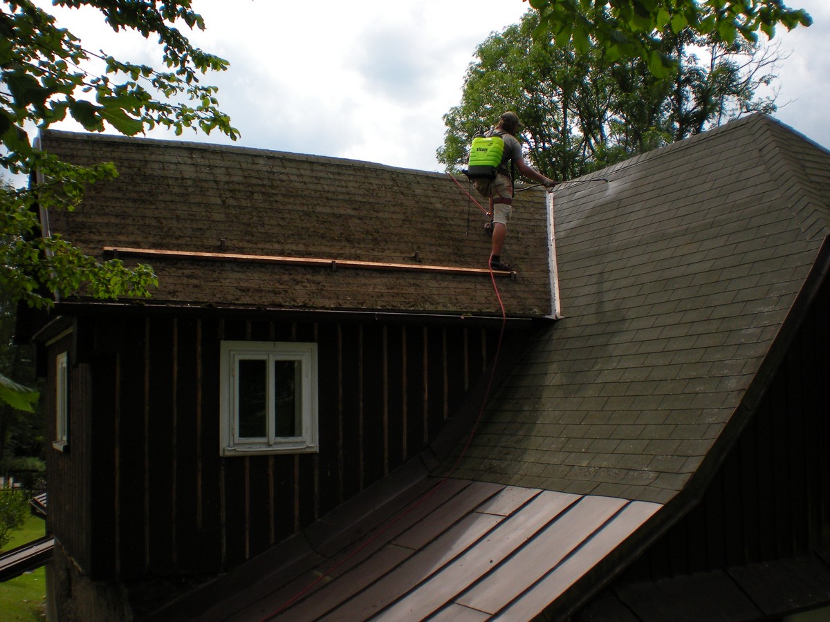 nátěr asfaltové střechy, očištění a dvojitý nástřik střechy, materiál jednovrsvý šindel