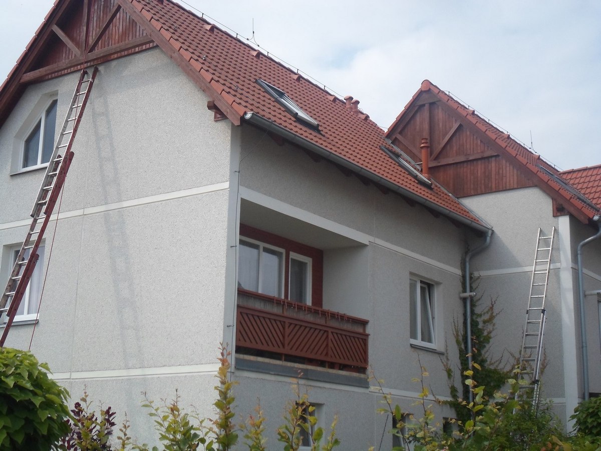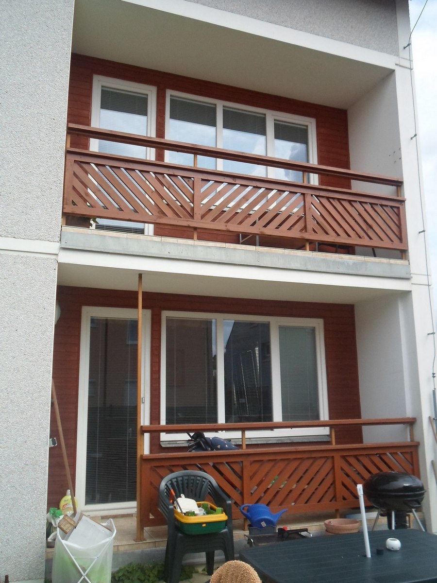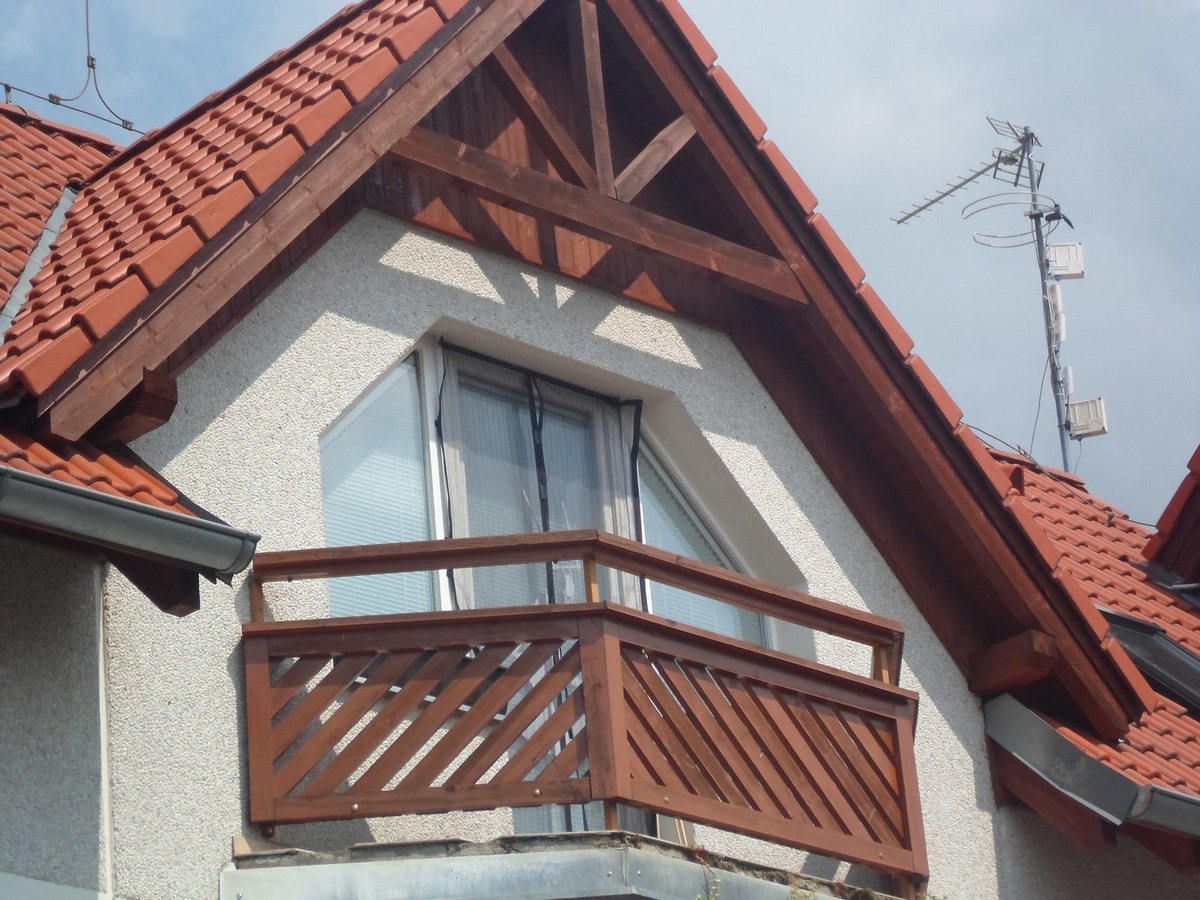 Nátěr dřevěného opláštění, podhledů zábradlí a vnitřního oplášnění balkonů, penetrace včetně dvou nátěrou lazura borovice, Nupaky u Prahy