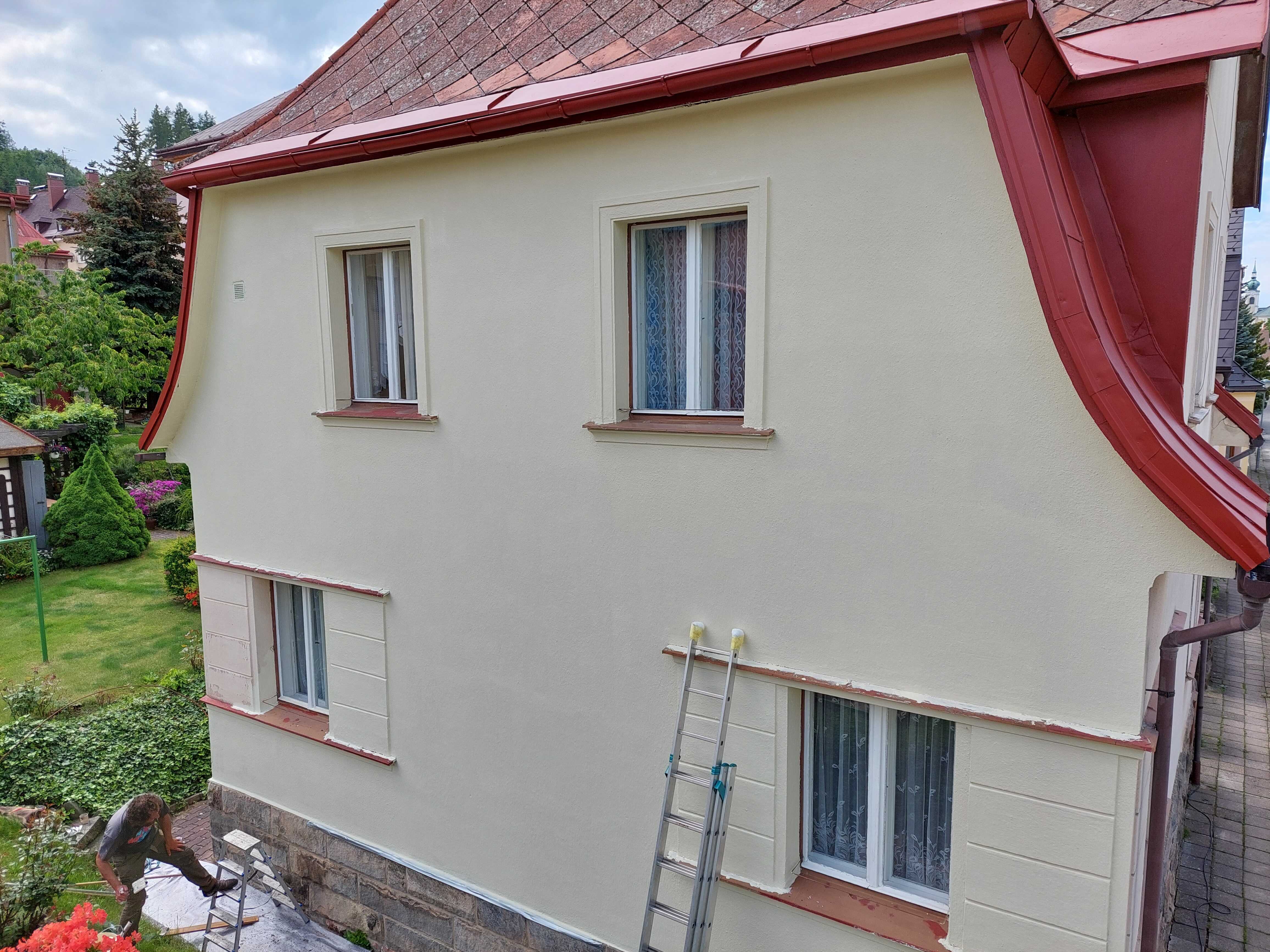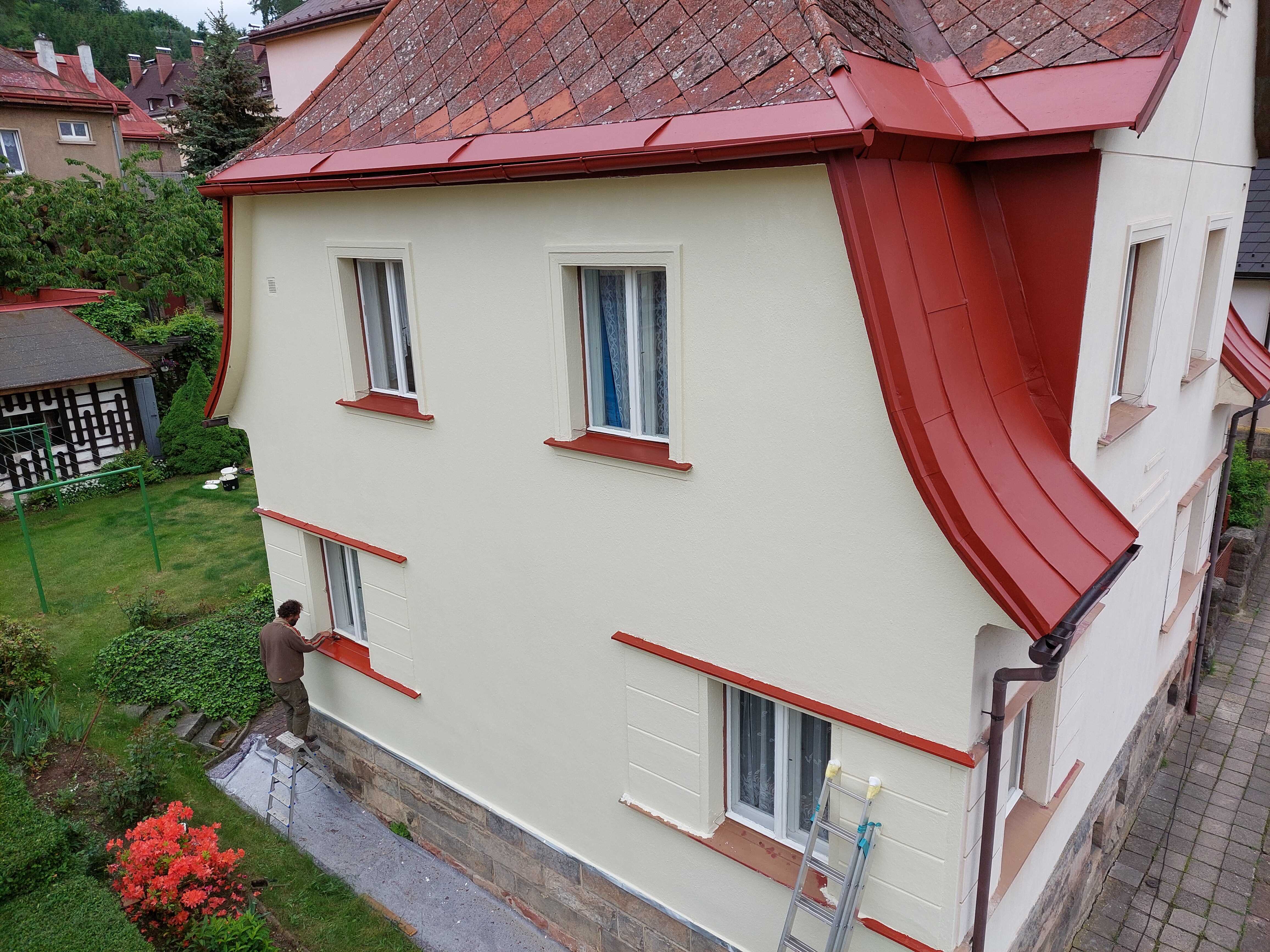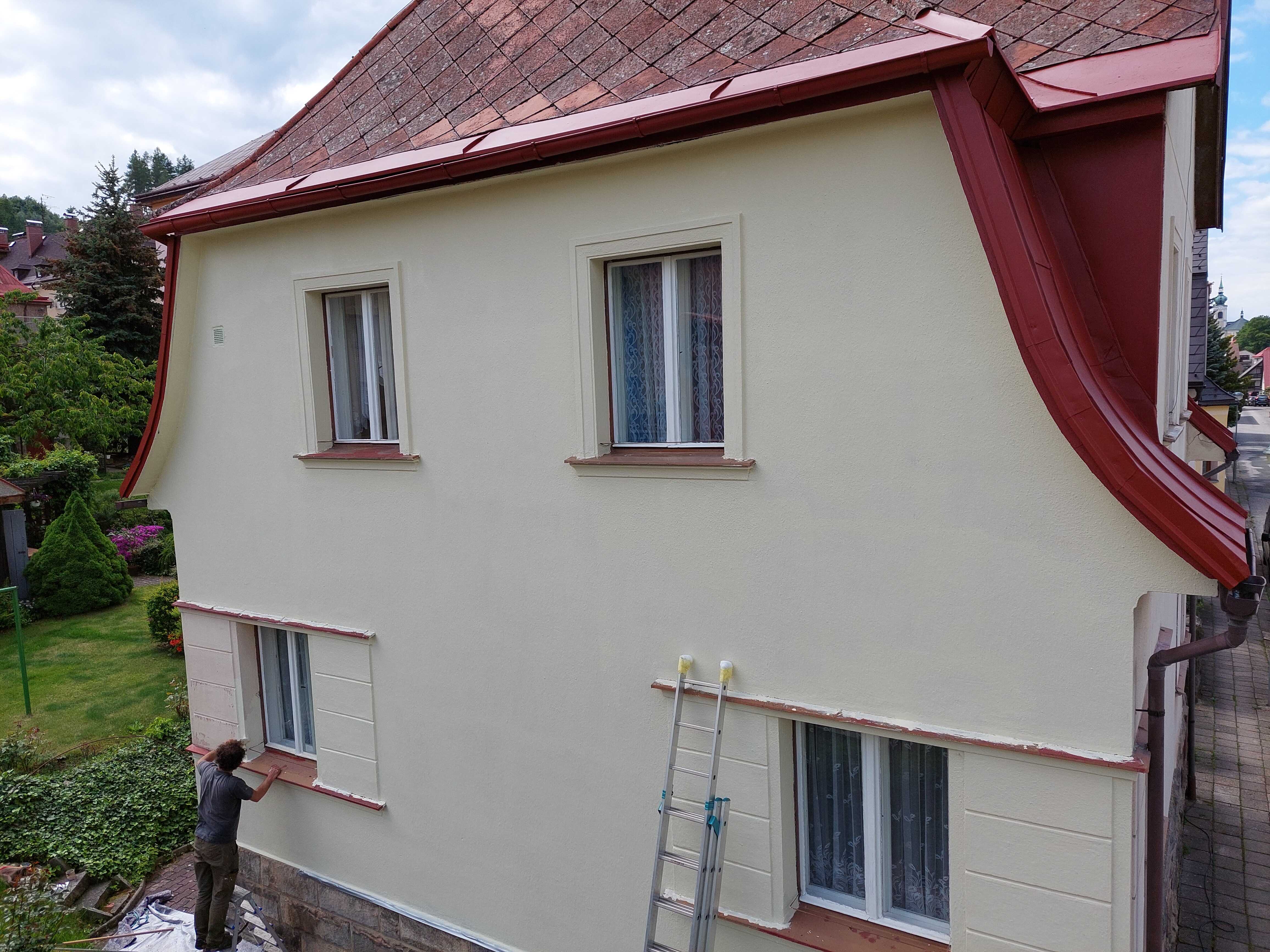 Nátěr fasády, provedení penetrace, a dvojitý ochranný nátěr silikonovou barvou.