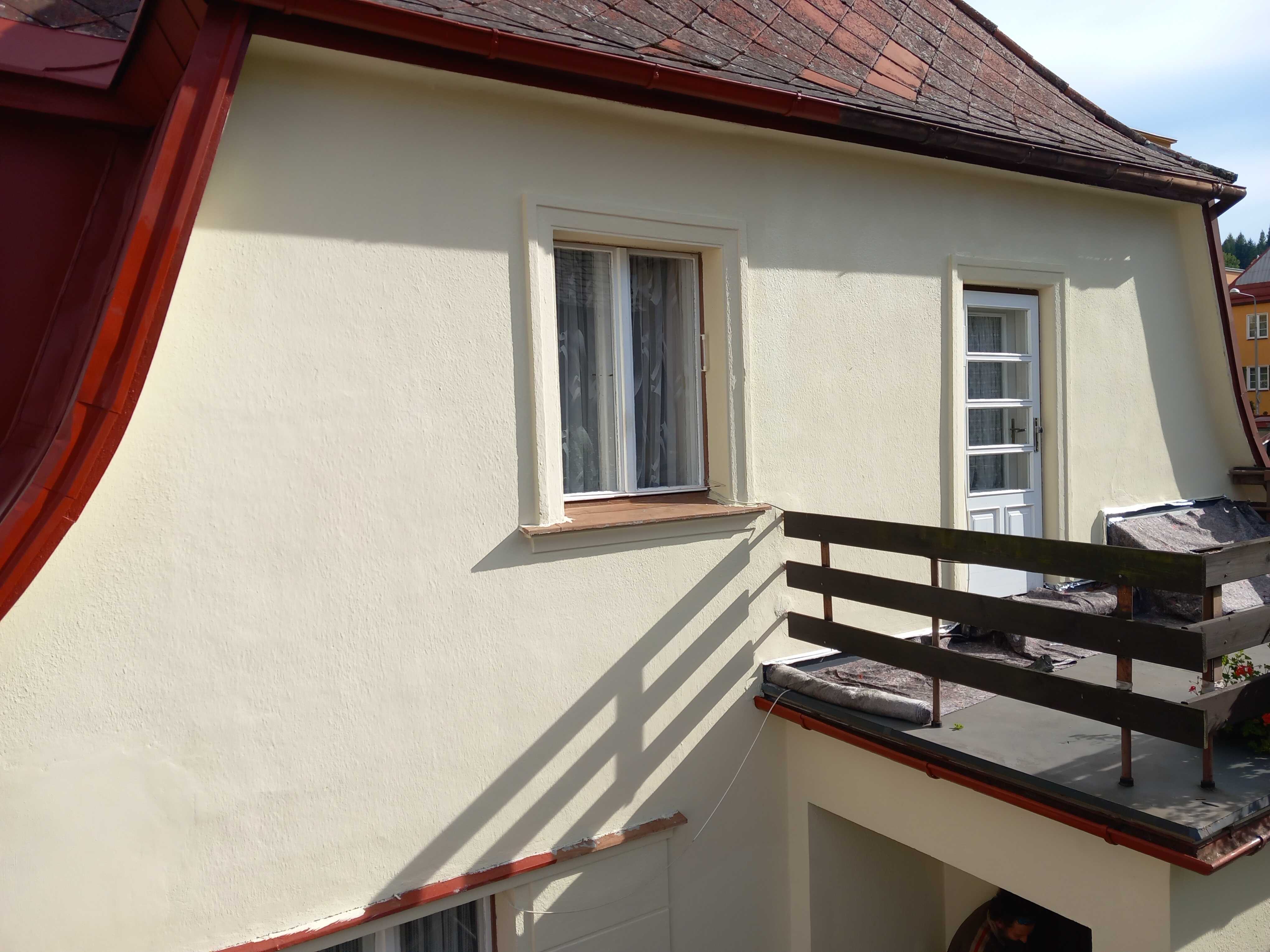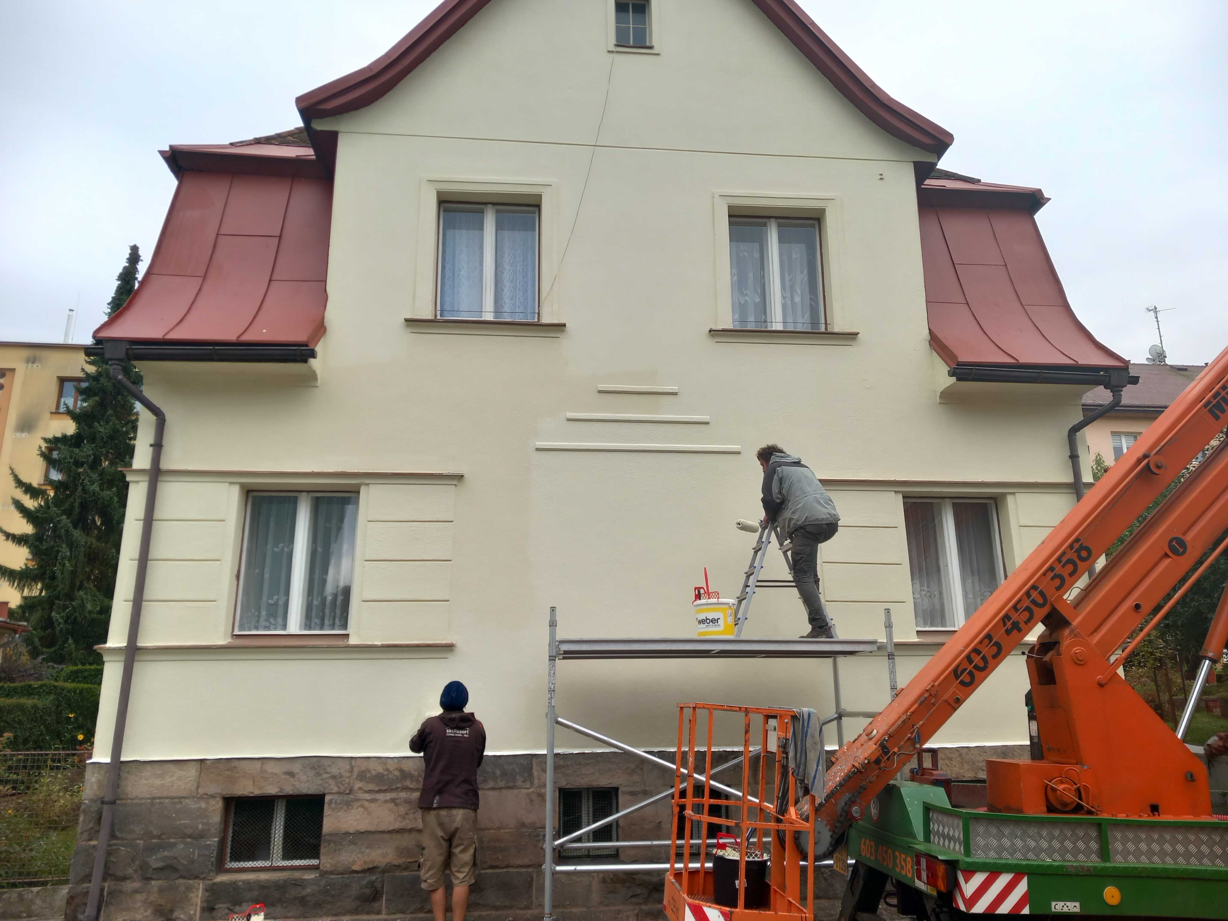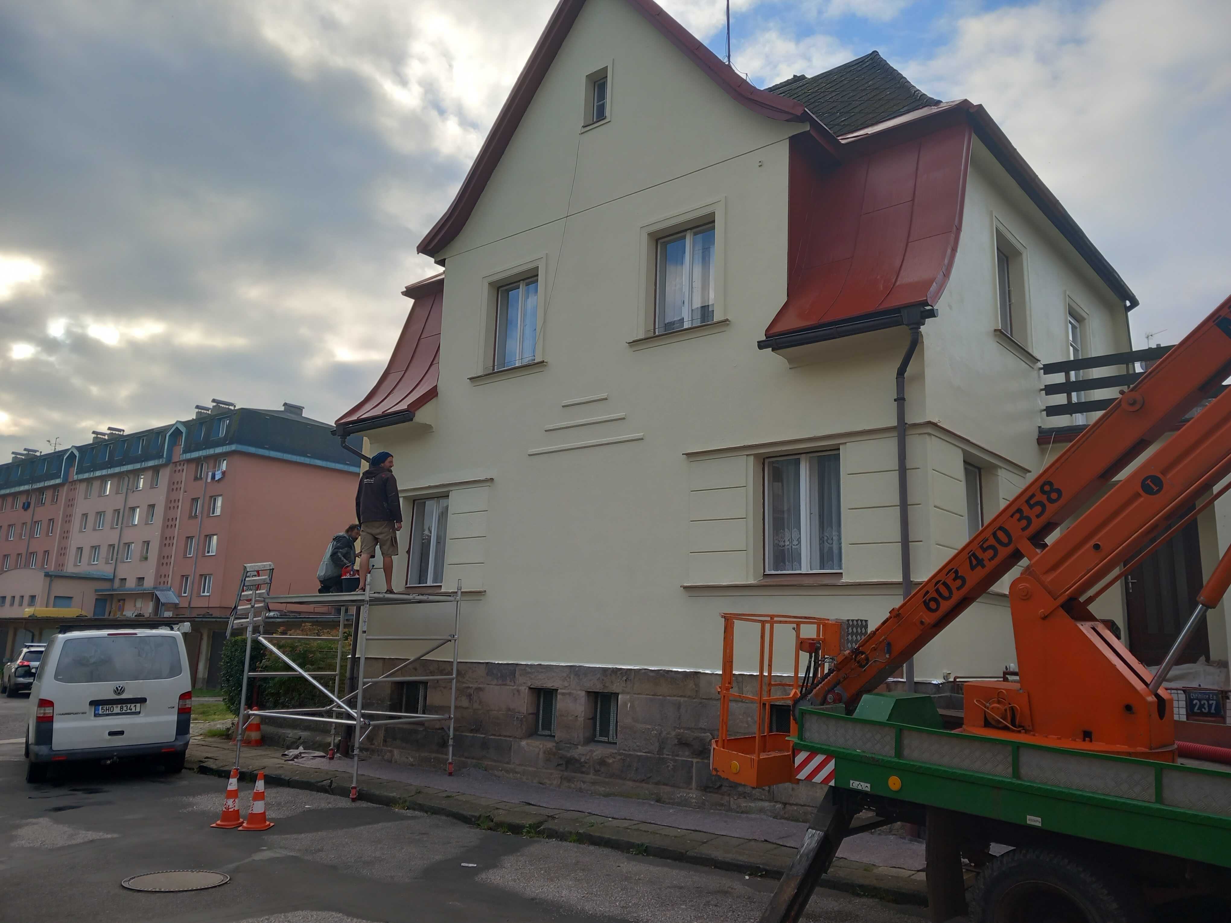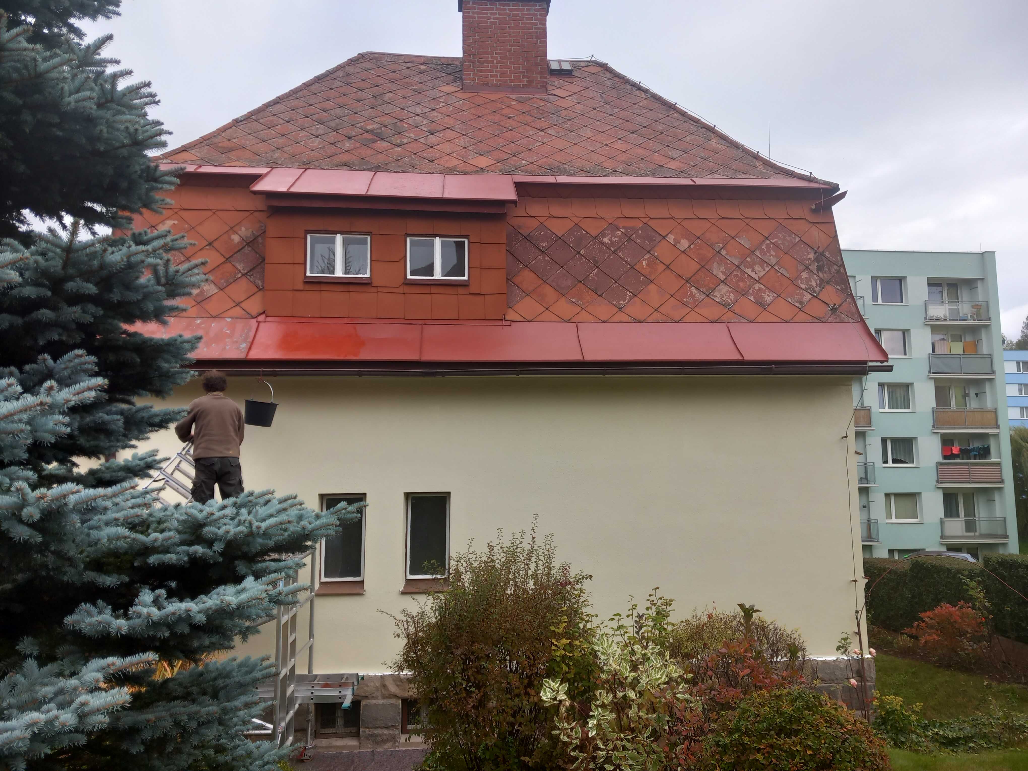 Nátěr fasády, provedení penetrace, a dvojitý ochranný nátěr silikonovou barvou.