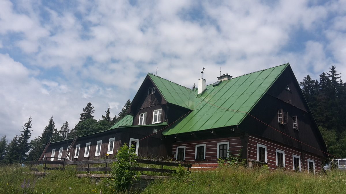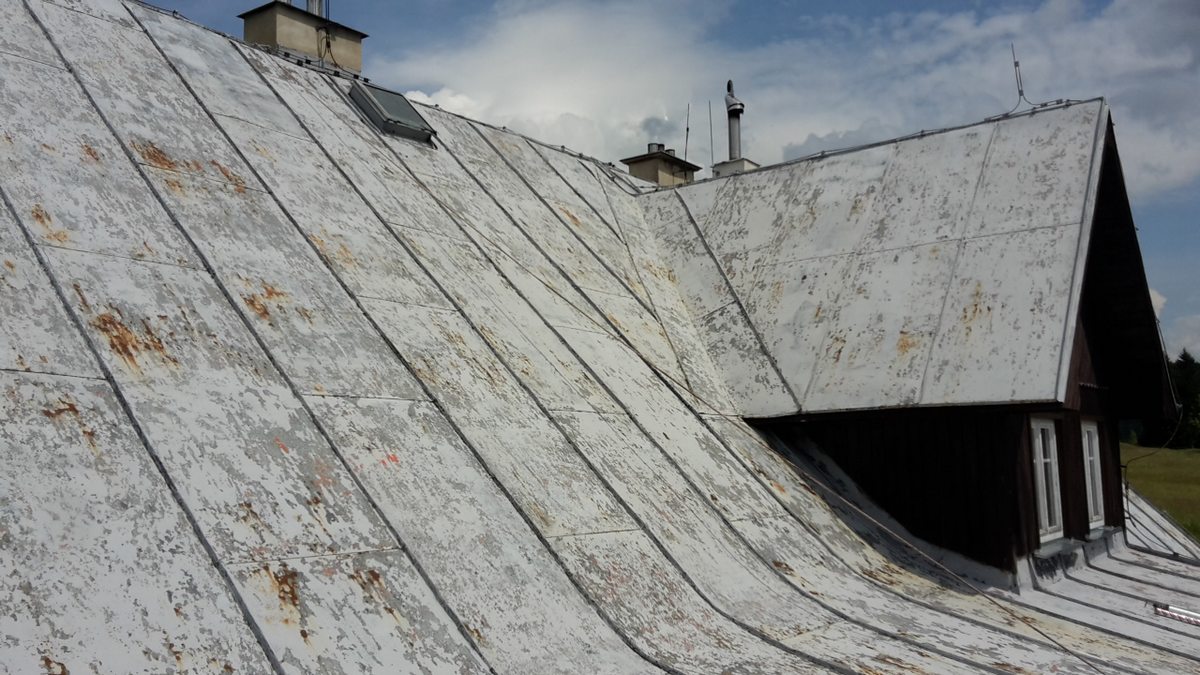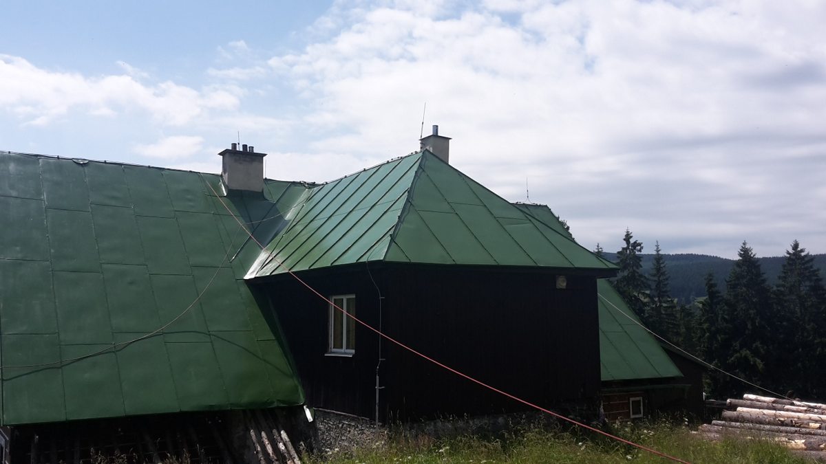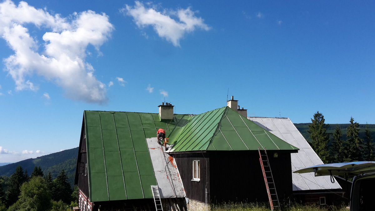 Nátěr střechy rekreační horské chaty Velká Úpa. očištění a dvojitý syntetický nátěr