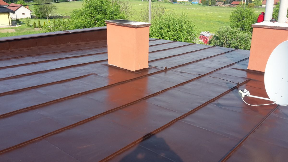 Nátěr ploché střechy, očištění střechy přístrojem Wap, kvalitní syntetický nátěr na bázi alkyd uretanové pryskyřice, velice flexibilní s vysokou roztažností