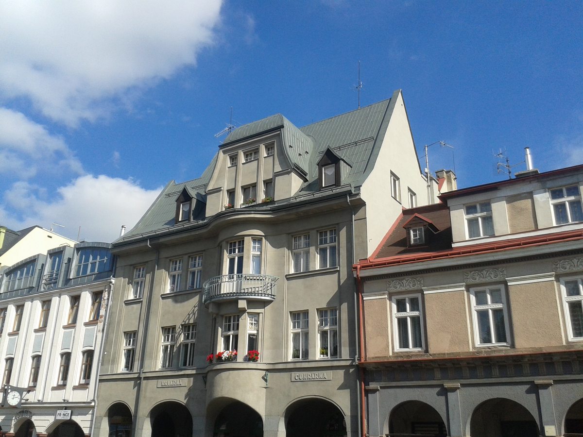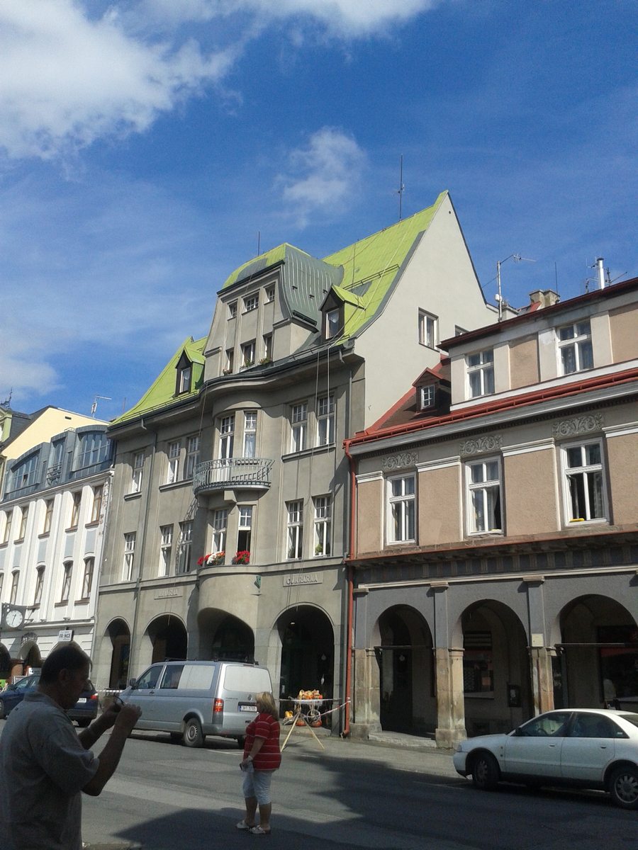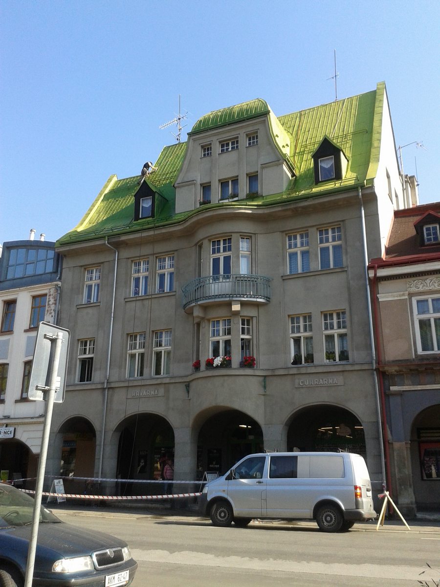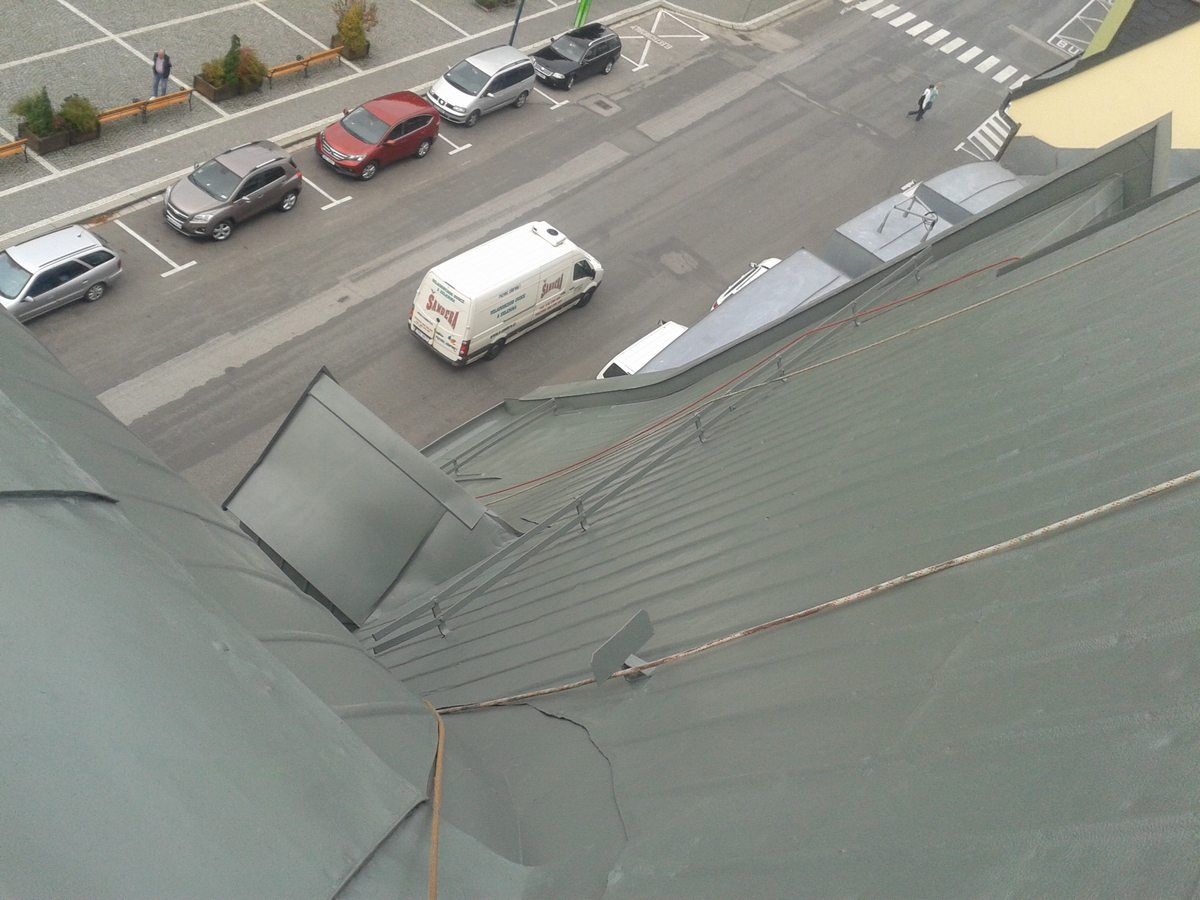 Provedli jsme nátěr střechy včetně očištění s pozinkových šablon na náměstí ve Vrchlabí, nátěr žlabů a svodů pomocí plošiny. odstín barvy šedá, dle požadavku památkového ústavu
