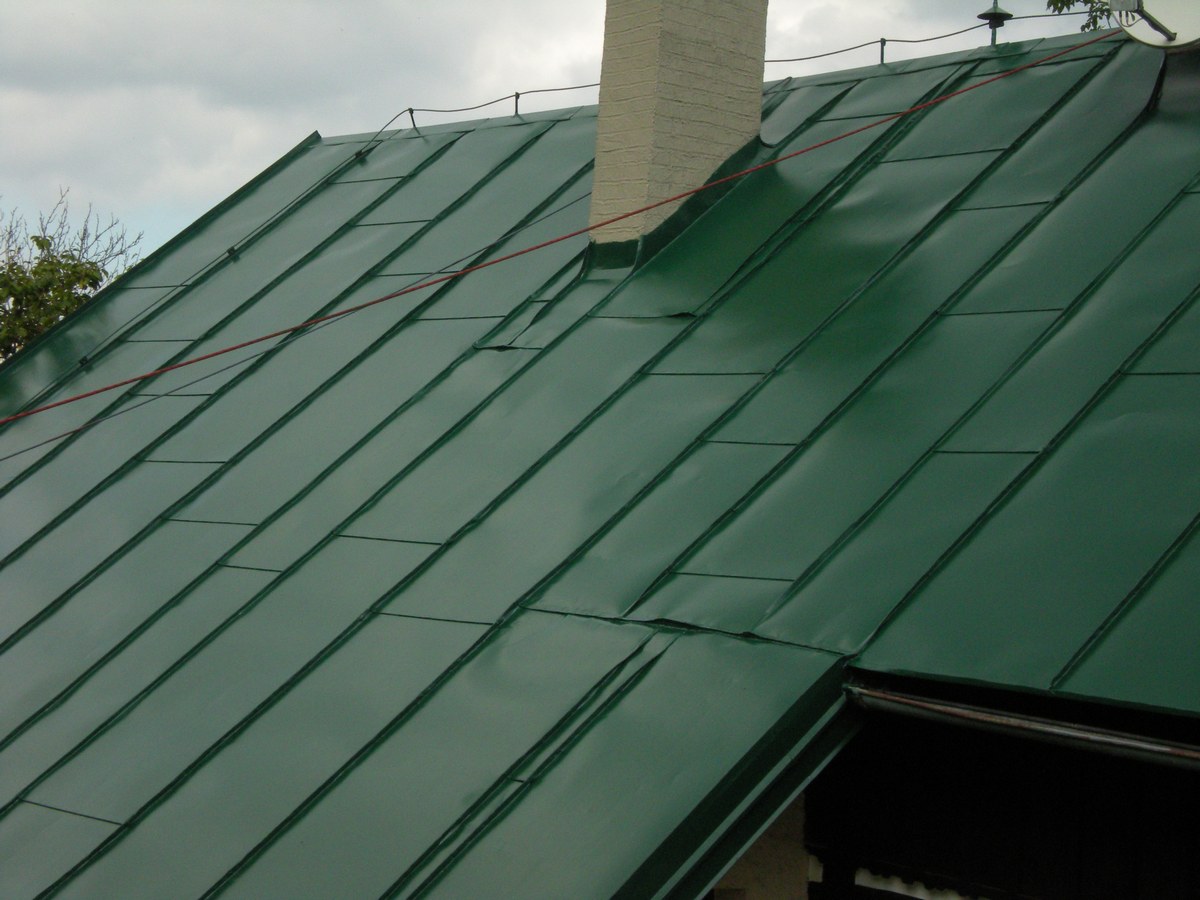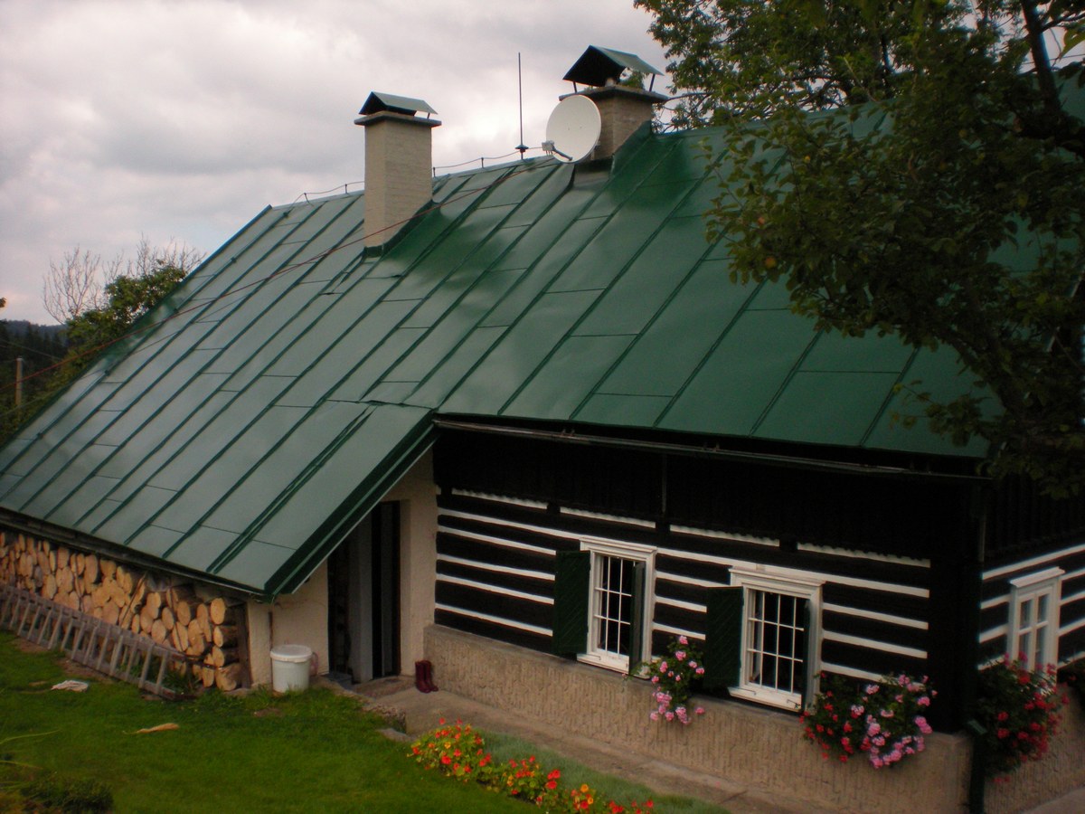 Nátěr střechy polyuretanovou barvou - mechová zelená, Jizerské hory,rekreační roubená chata