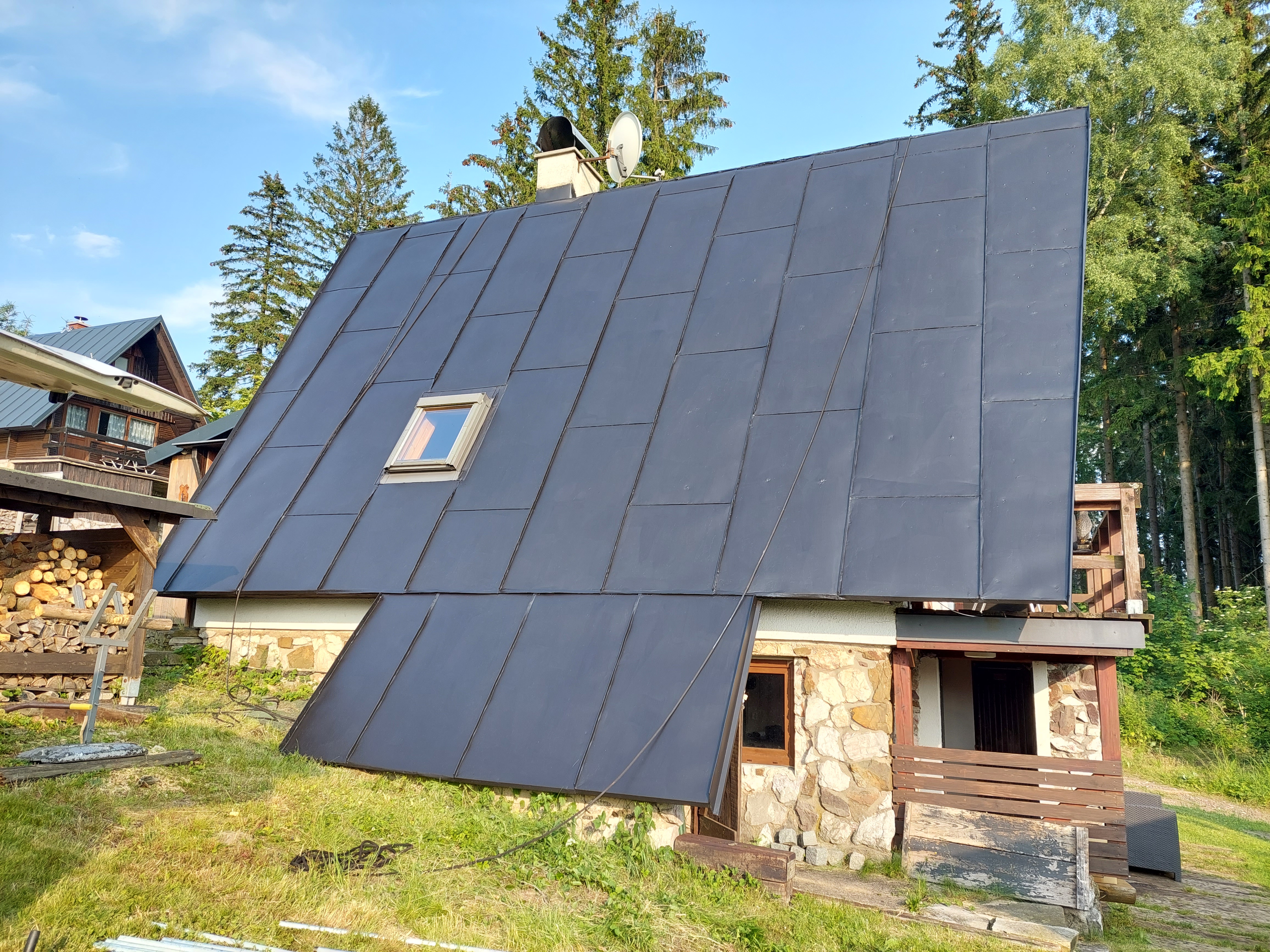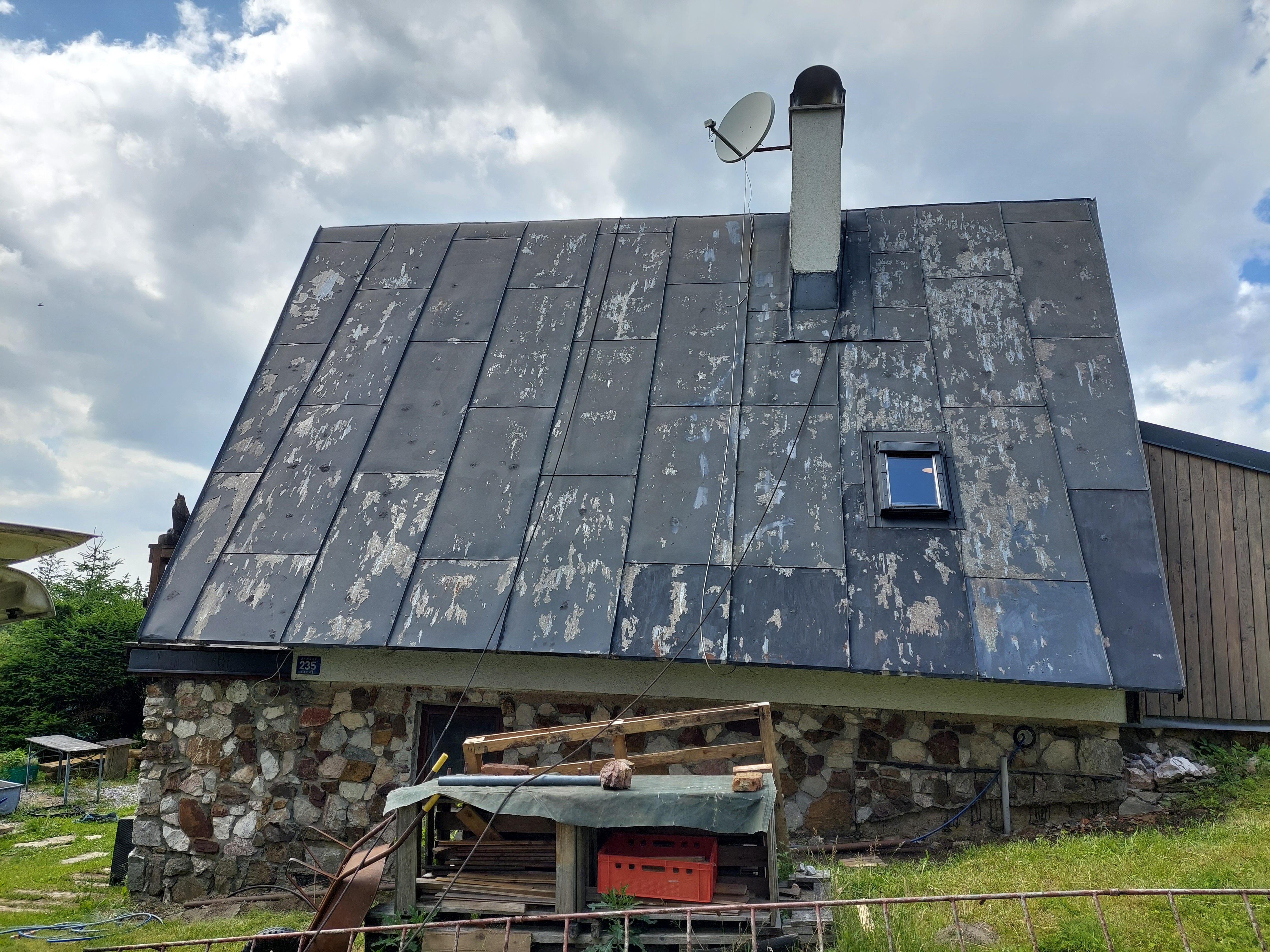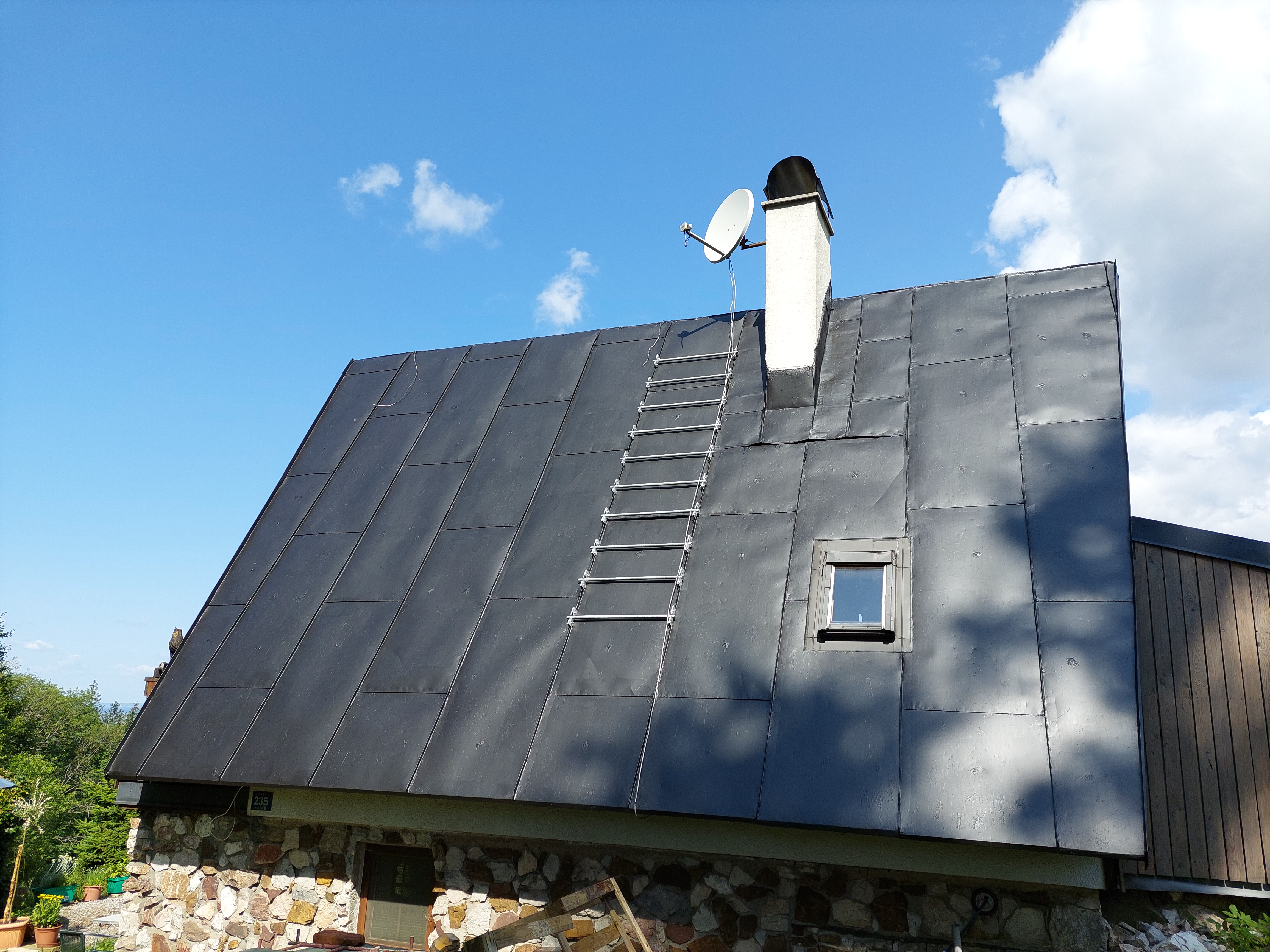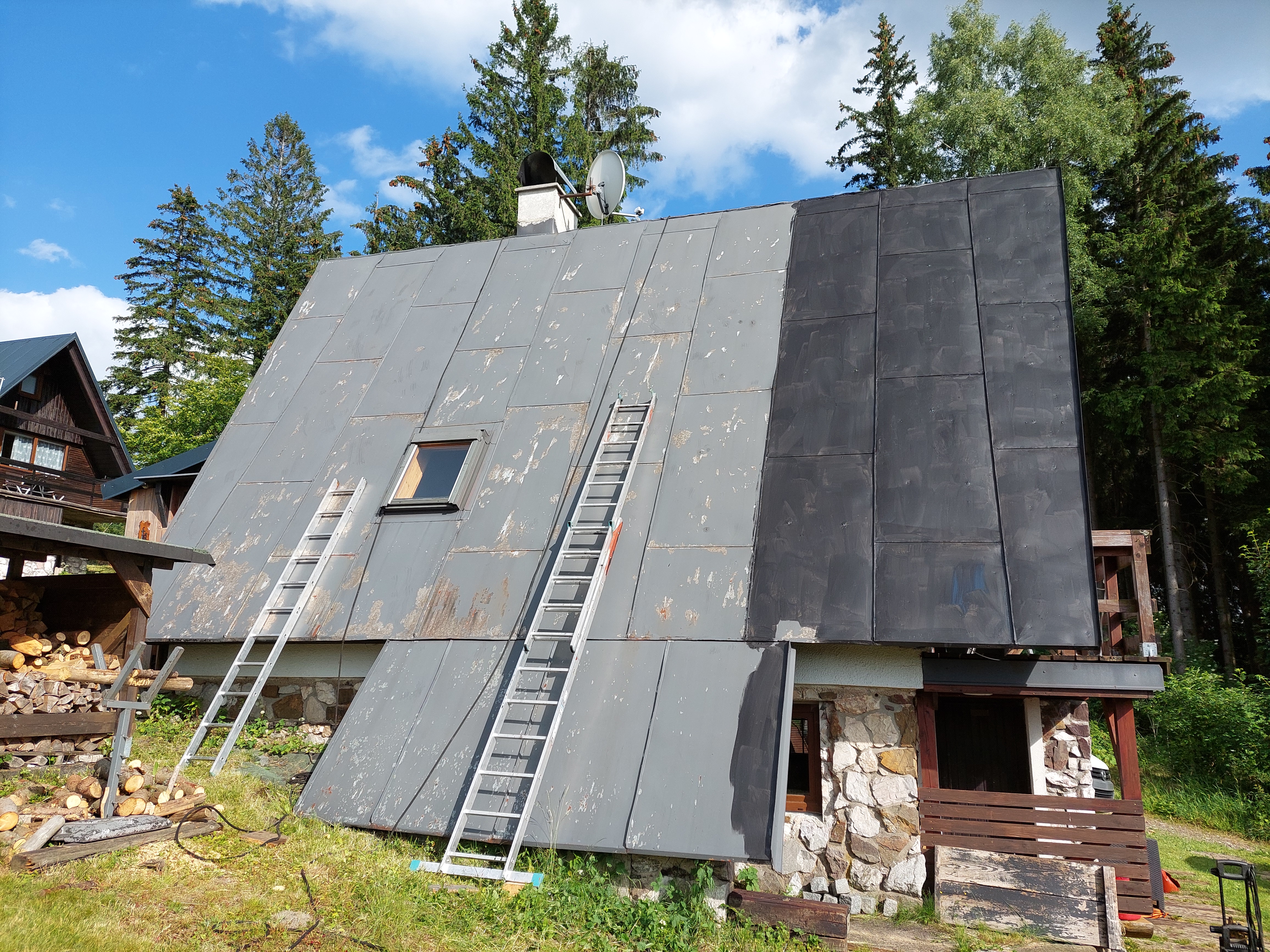 Nátěr plechové střechy, montáž trubkového žebříku ke komínu.