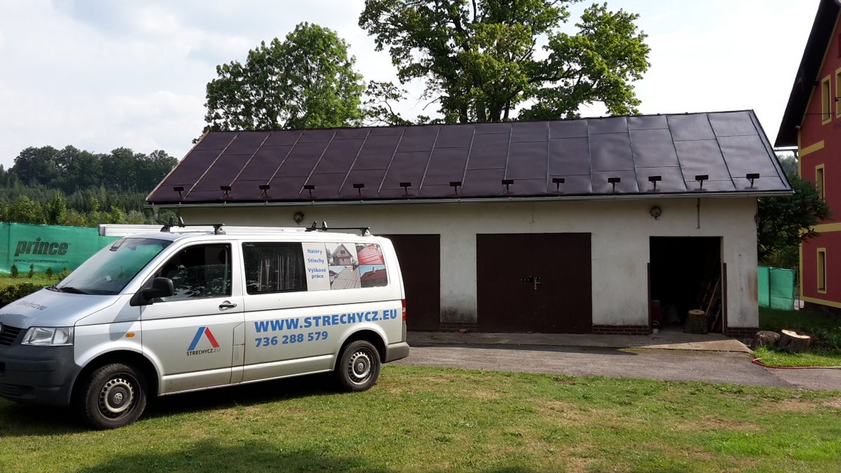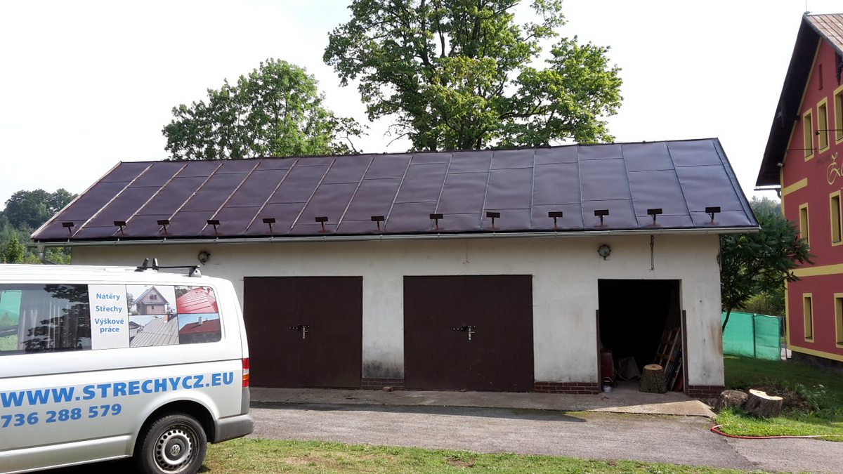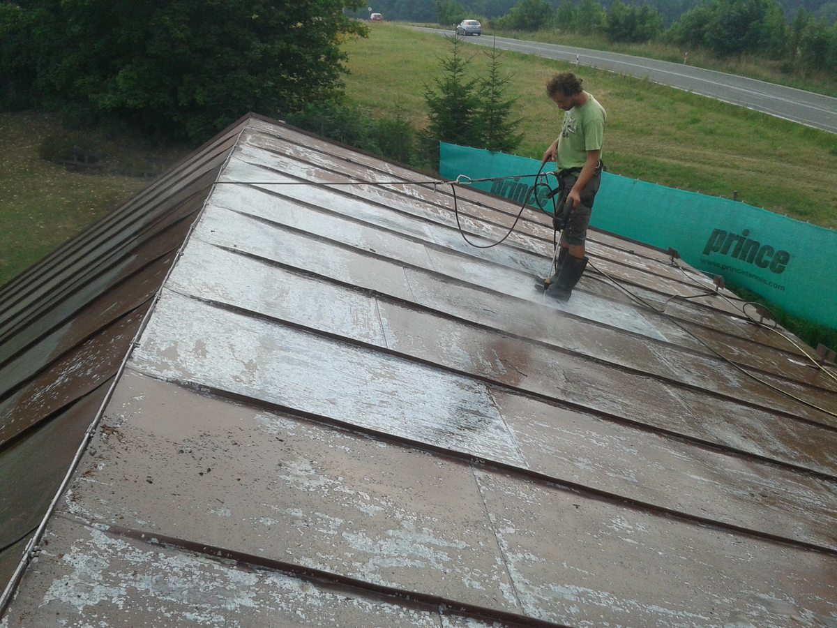 Nátěr střechy pensionu, očištění a odmaštění, dvojitý nátěr střechy
