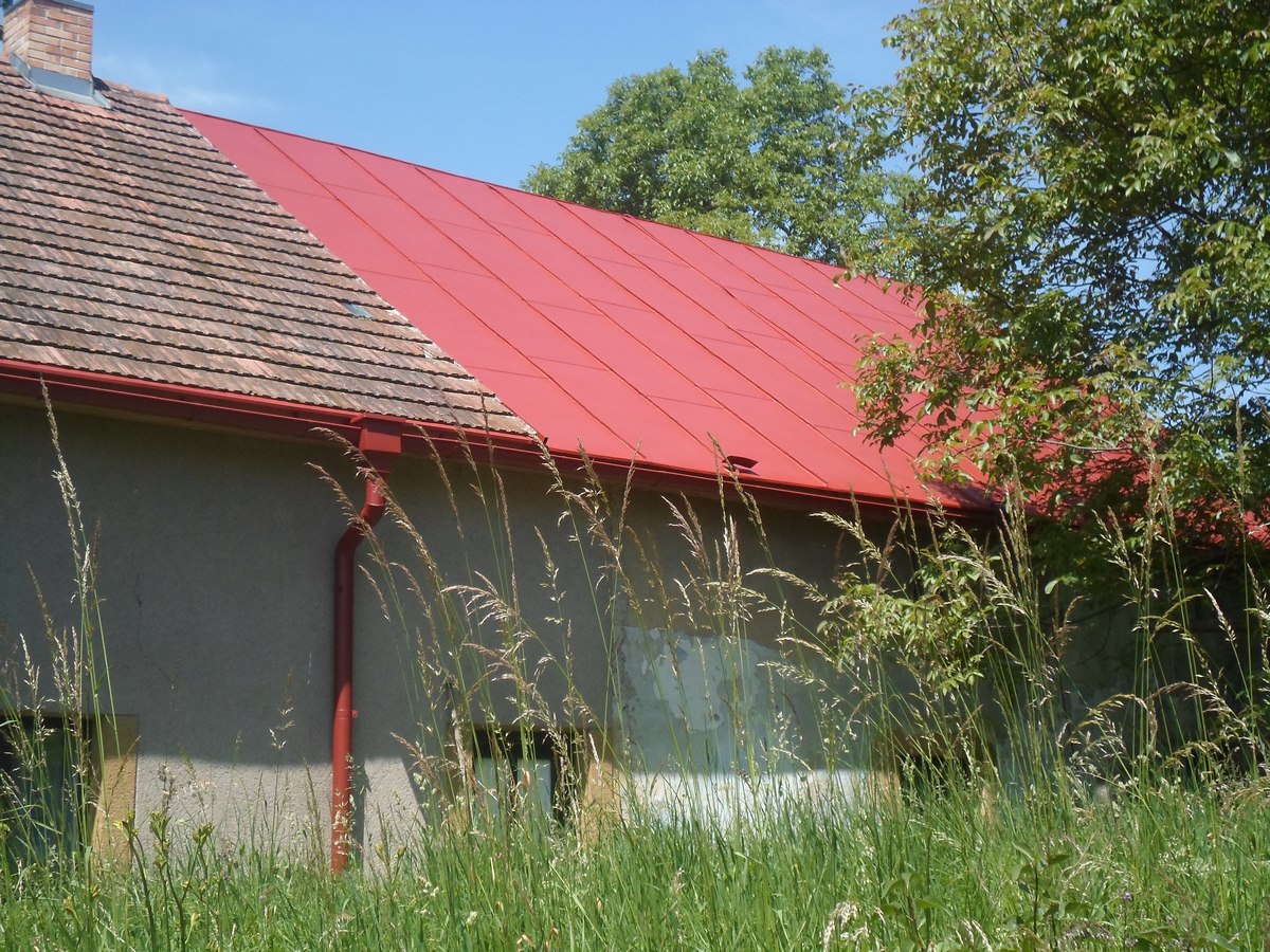 Nátěr střechy rodinného domu, očištění střechy dvojitý nátěr, vyčištění žlabu a nátěr žlabů a svodů, celkem 400m2.