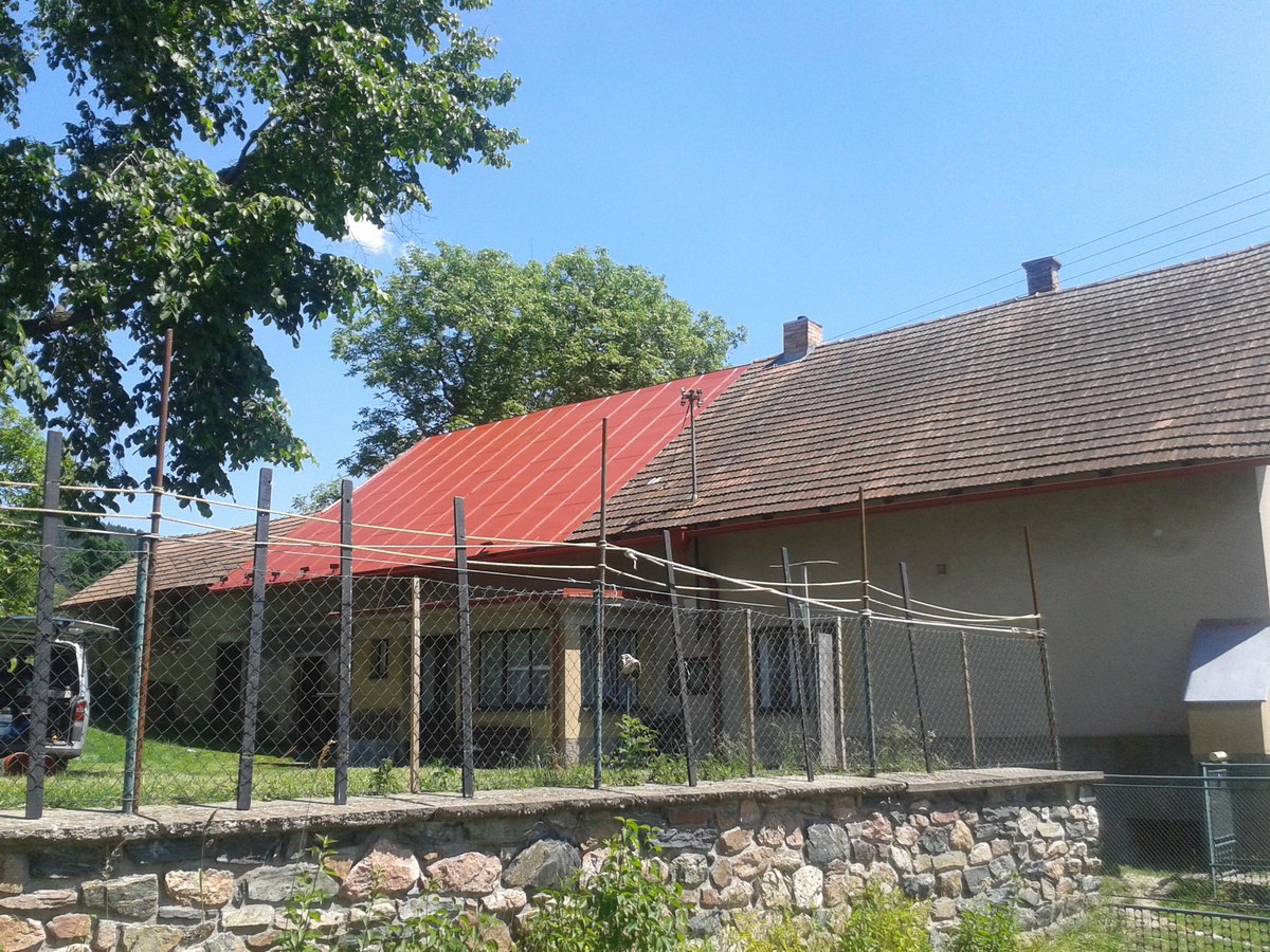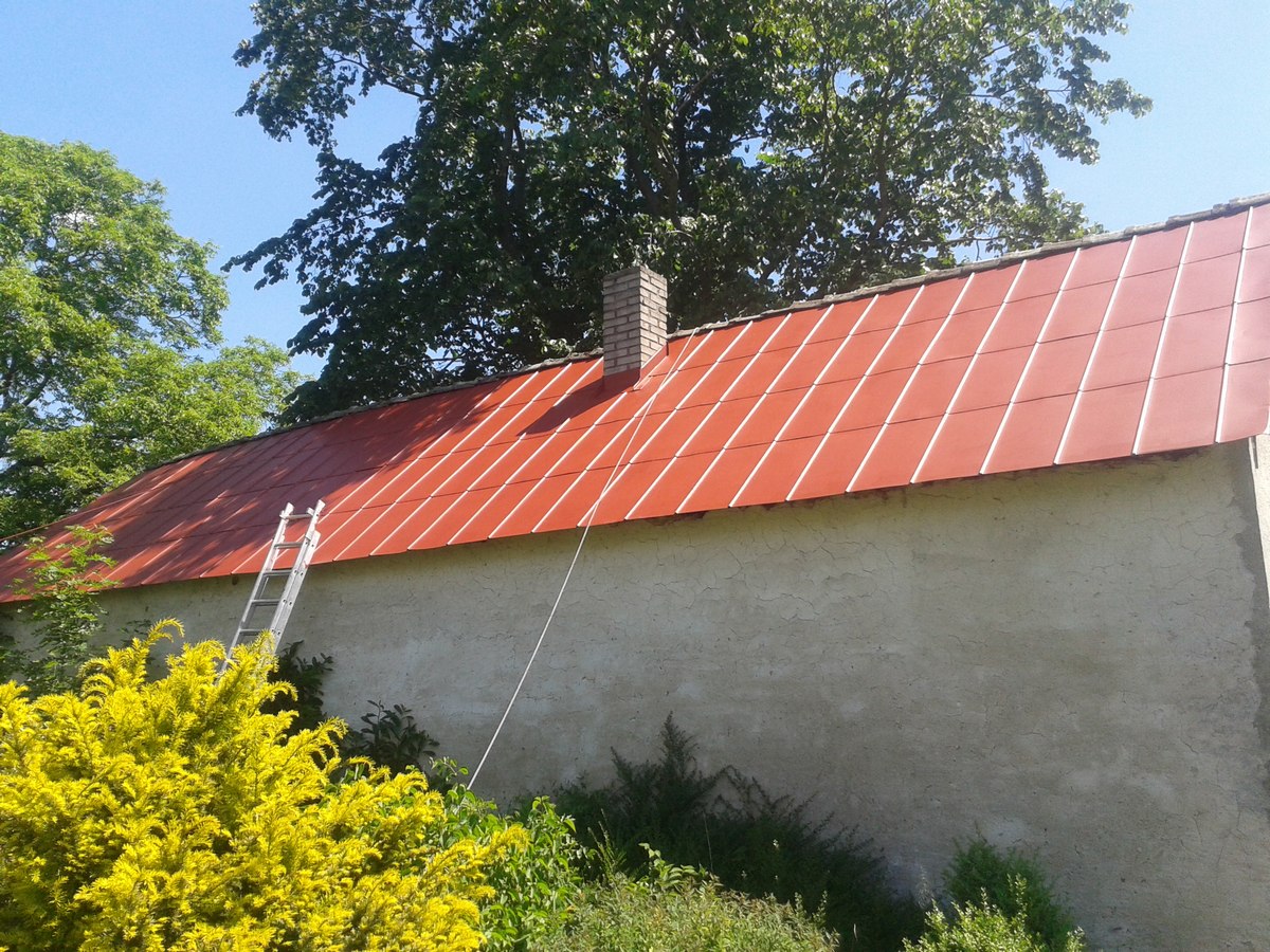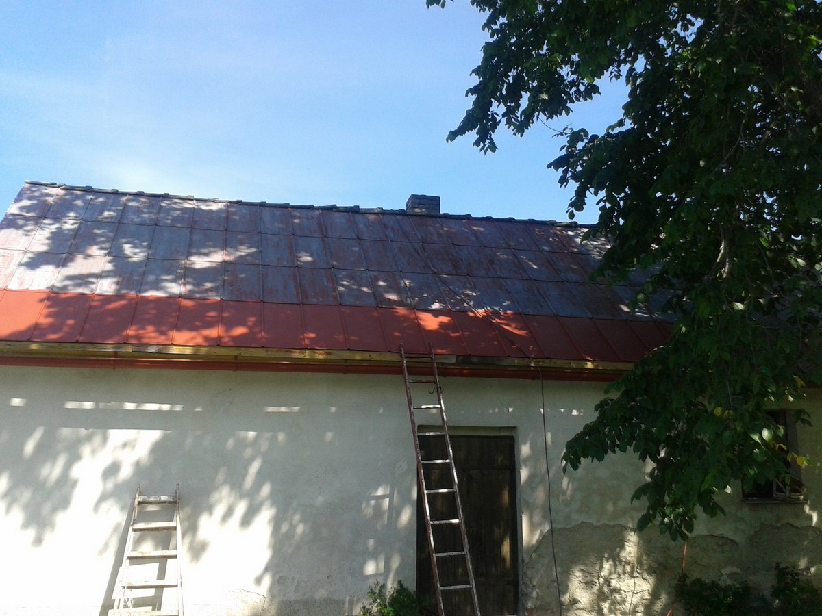Nátěr střechy rodinného domu, očištění střechy dvojitý nátěr, vyčištění žlabu a nátěr žlabů a svodů, celkem 400m2.