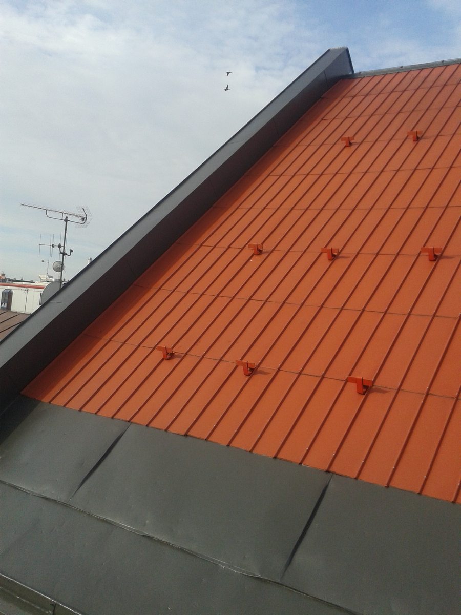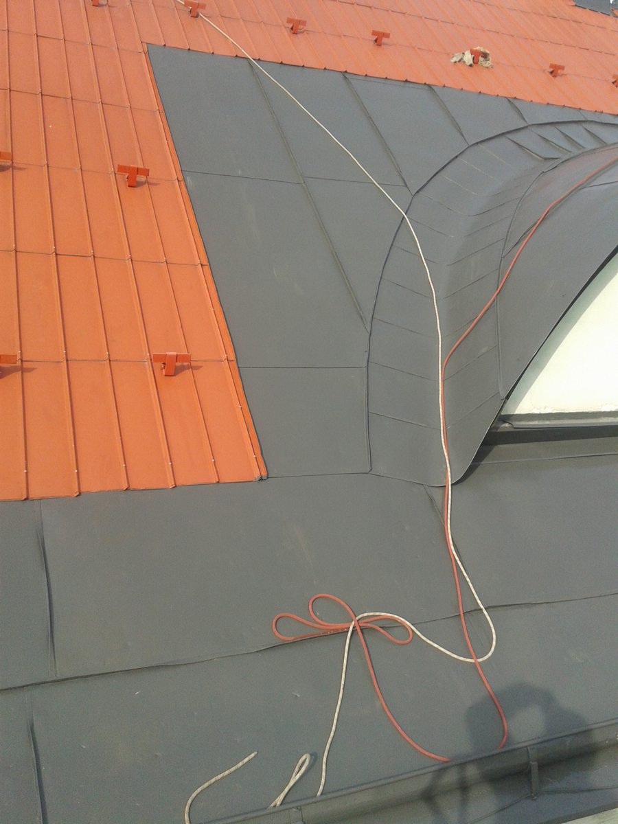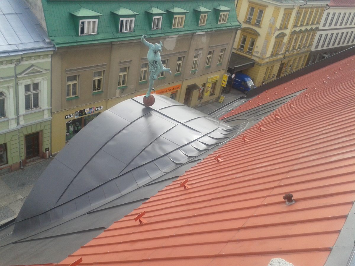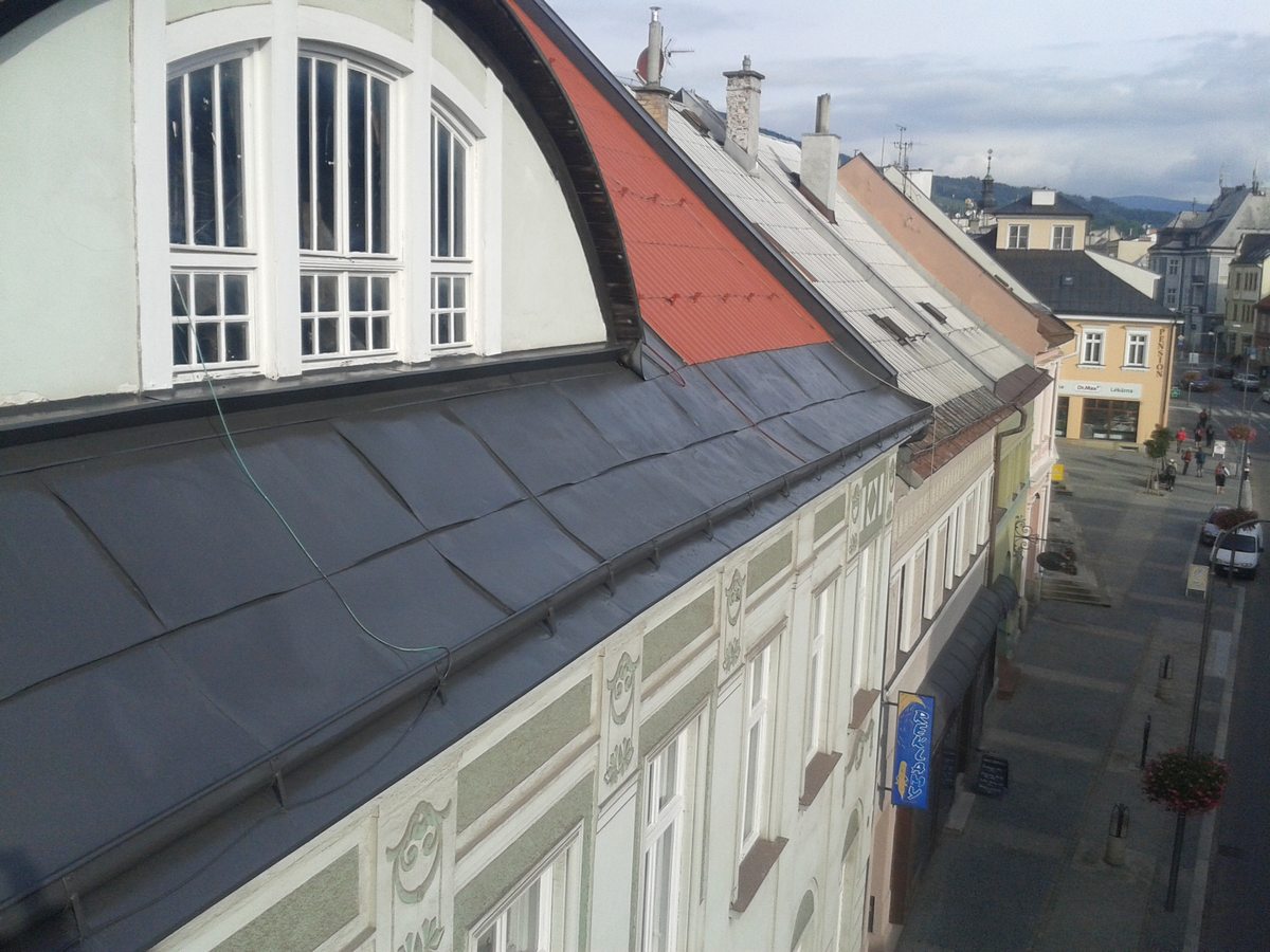 Nátěr střechy, oplechování, nátěr žlabů a svodů, včetně očištění střechy, svody byli natřeny s plošiny,