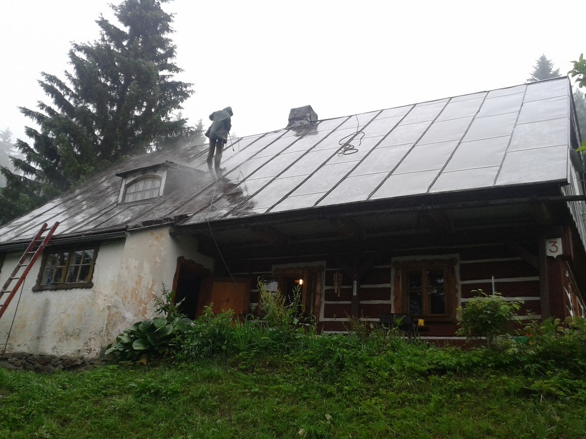 Nátěr střechy byl proveden na rekreační chatě, byl použit základní epoxidový nátěr, vrchní polyuretanový nátěr, lokalita Krkonoše