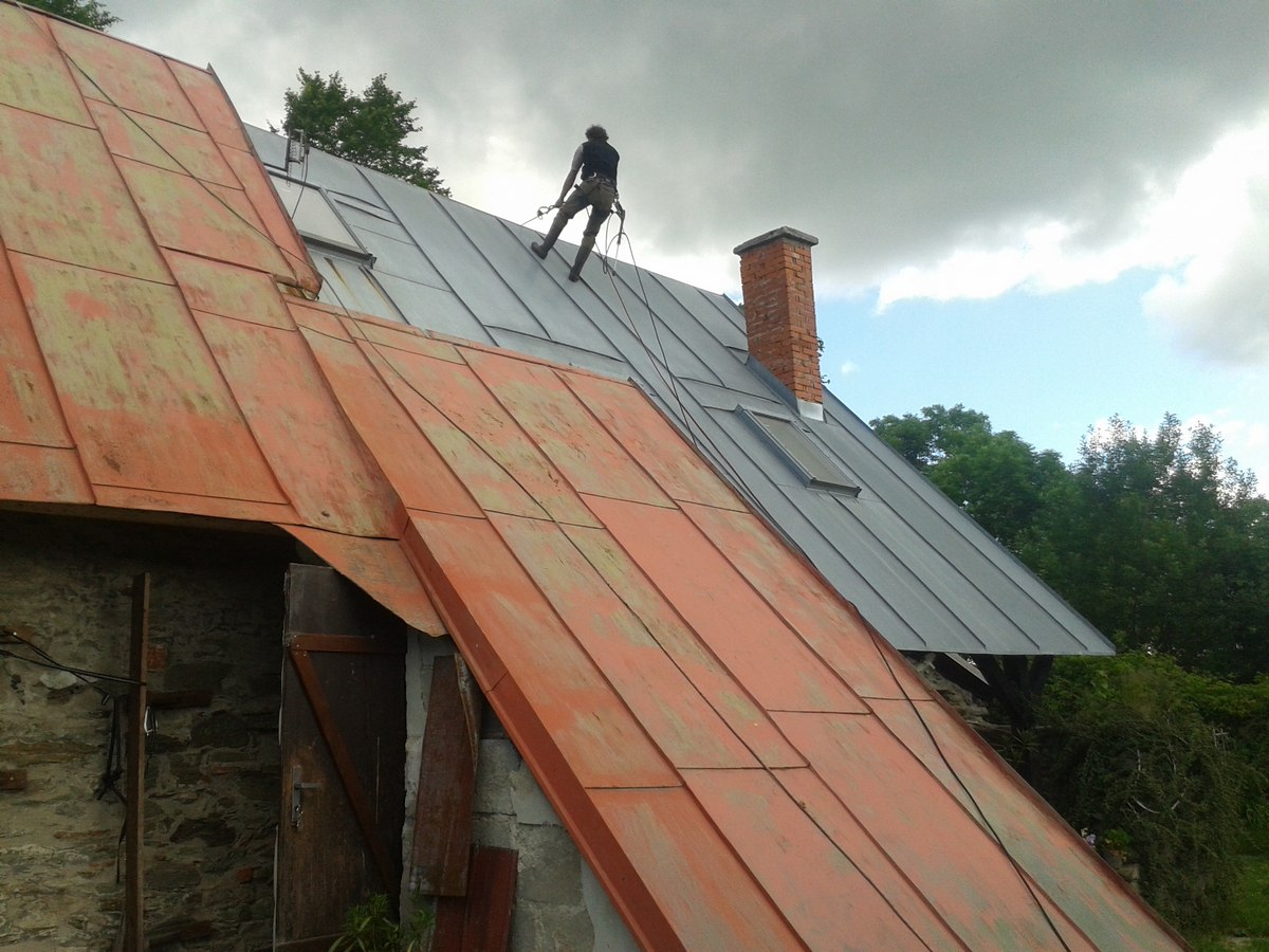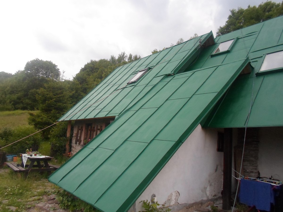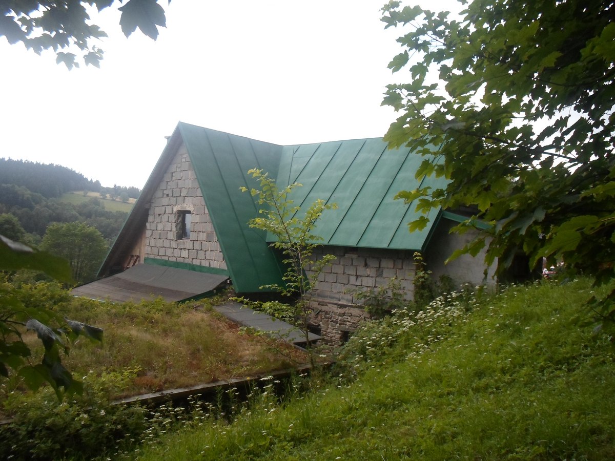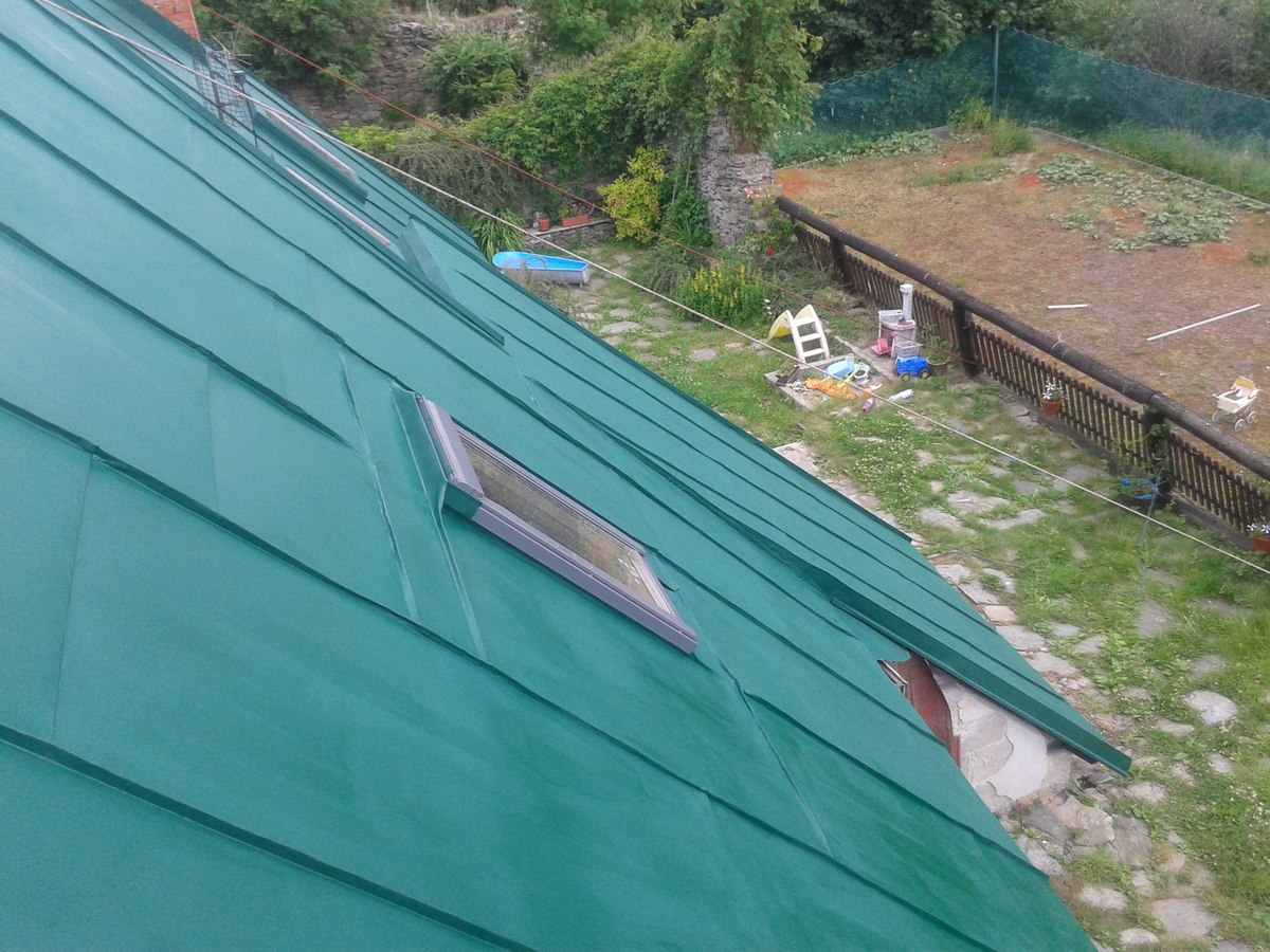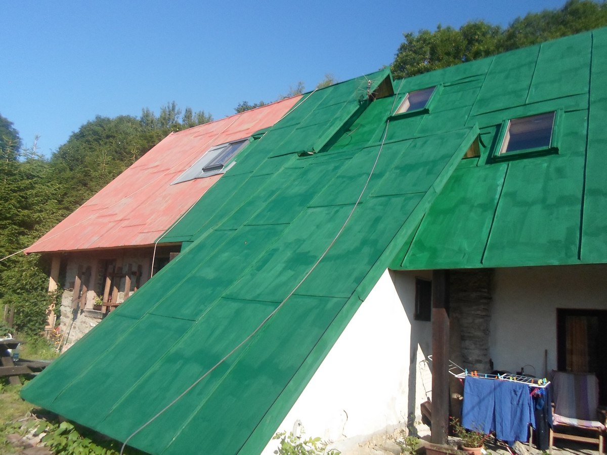 očištění a dvojitý nátěr střechy na soukromém rodinném pensionu, Krkonoše Žacléř, dvojitý nátěr průmyslovou syntetickou barvou odstín mechově zelená