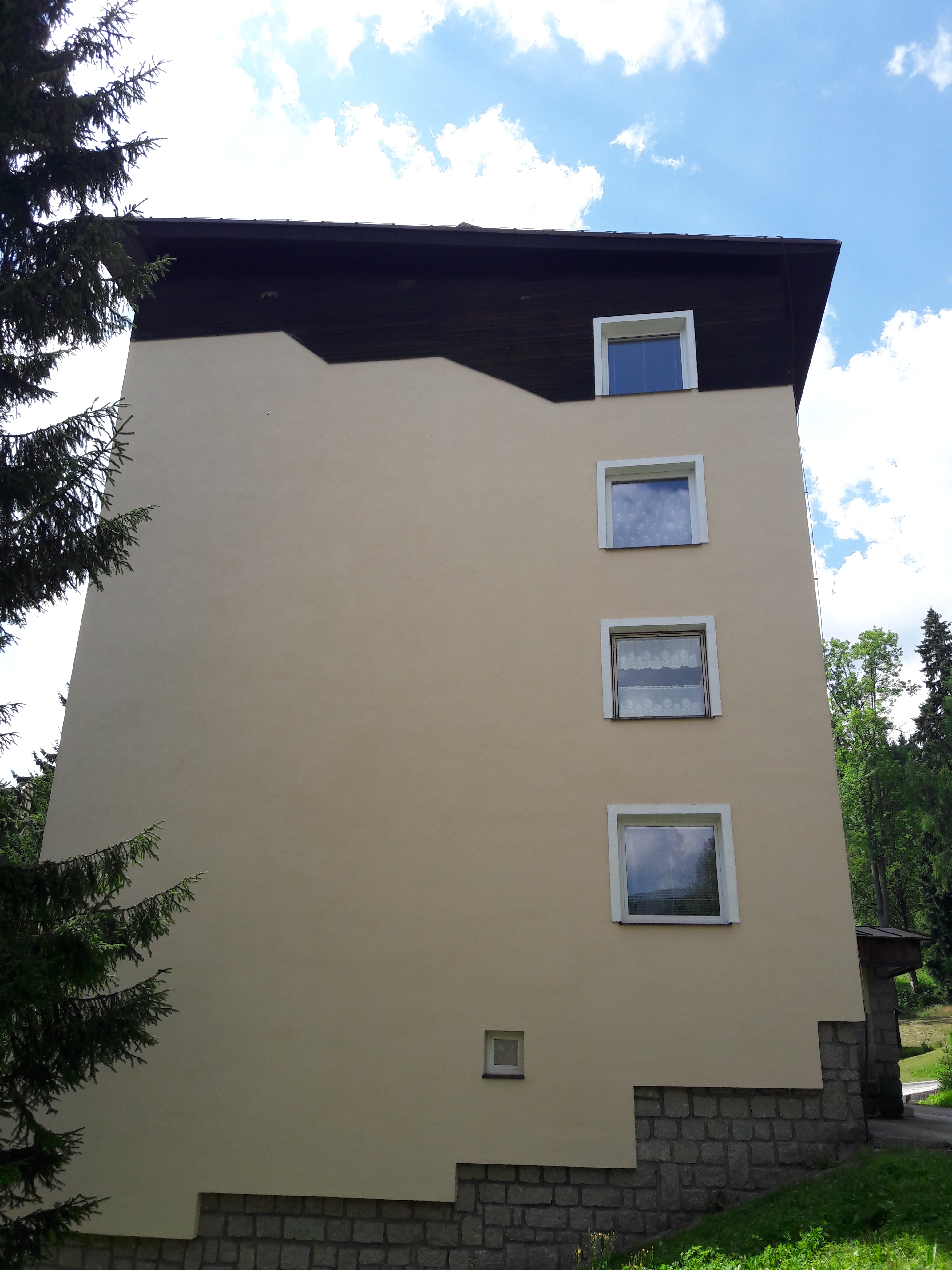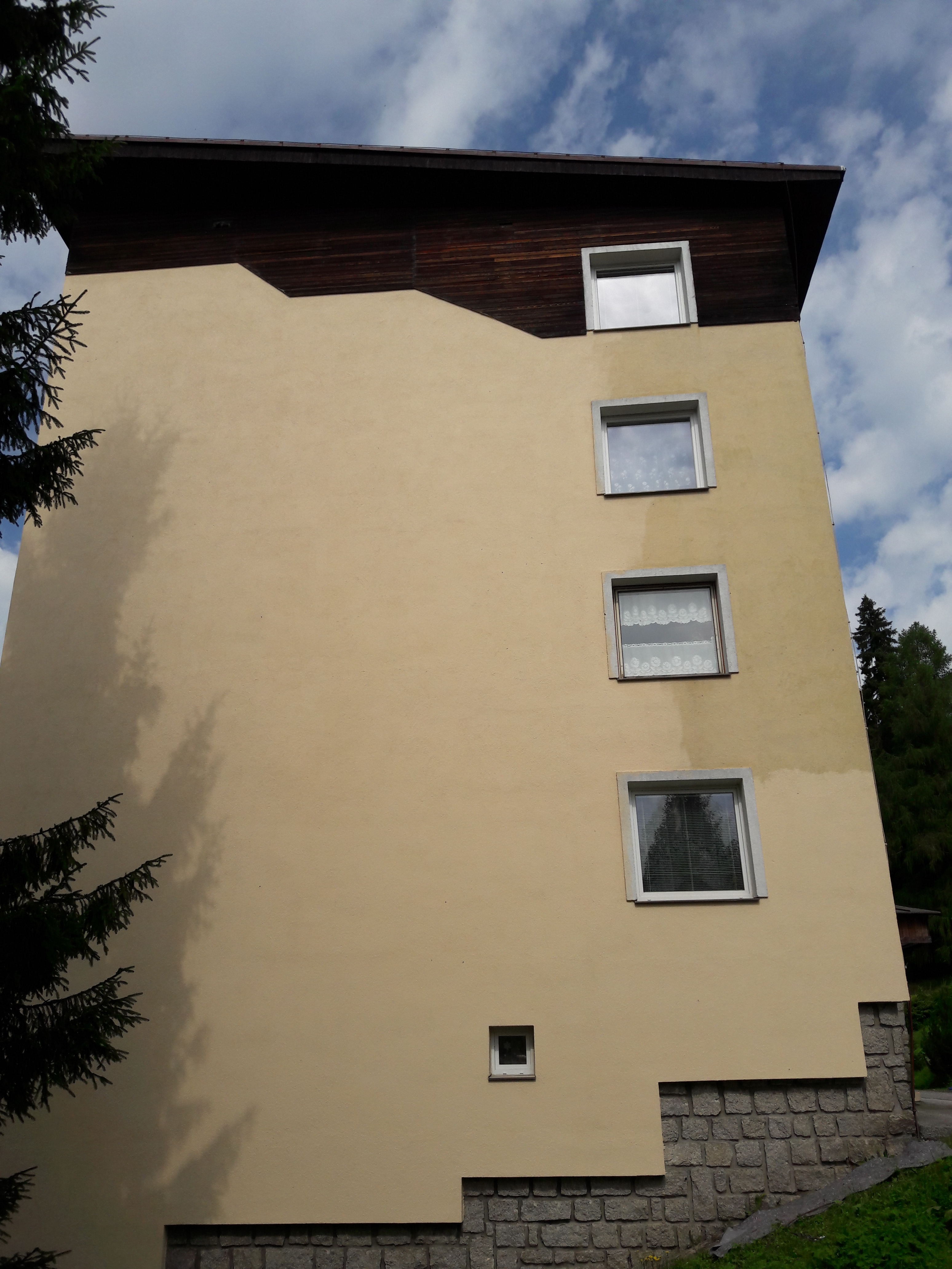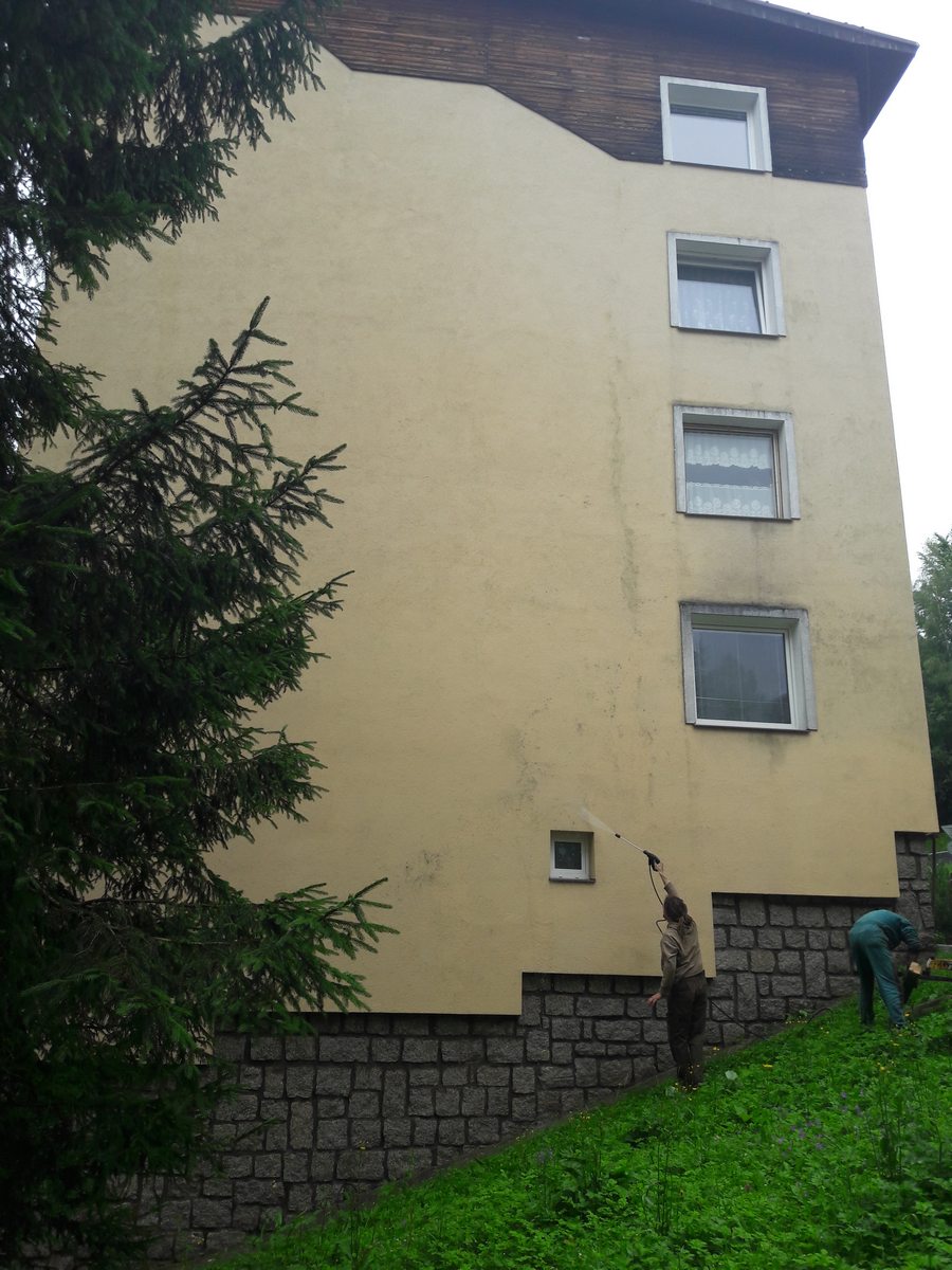 Očištění fasády, penetrace fasády, dvojitý nátěr silikonovou barvou panelového domu, špindlerův mlýn, dále byl proveden dvojitý nátěr dřevěné fasády.