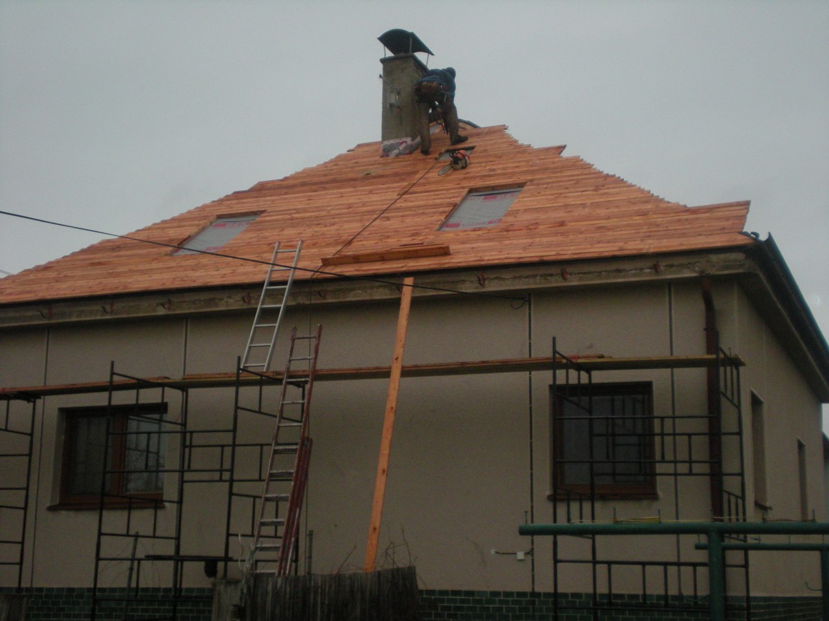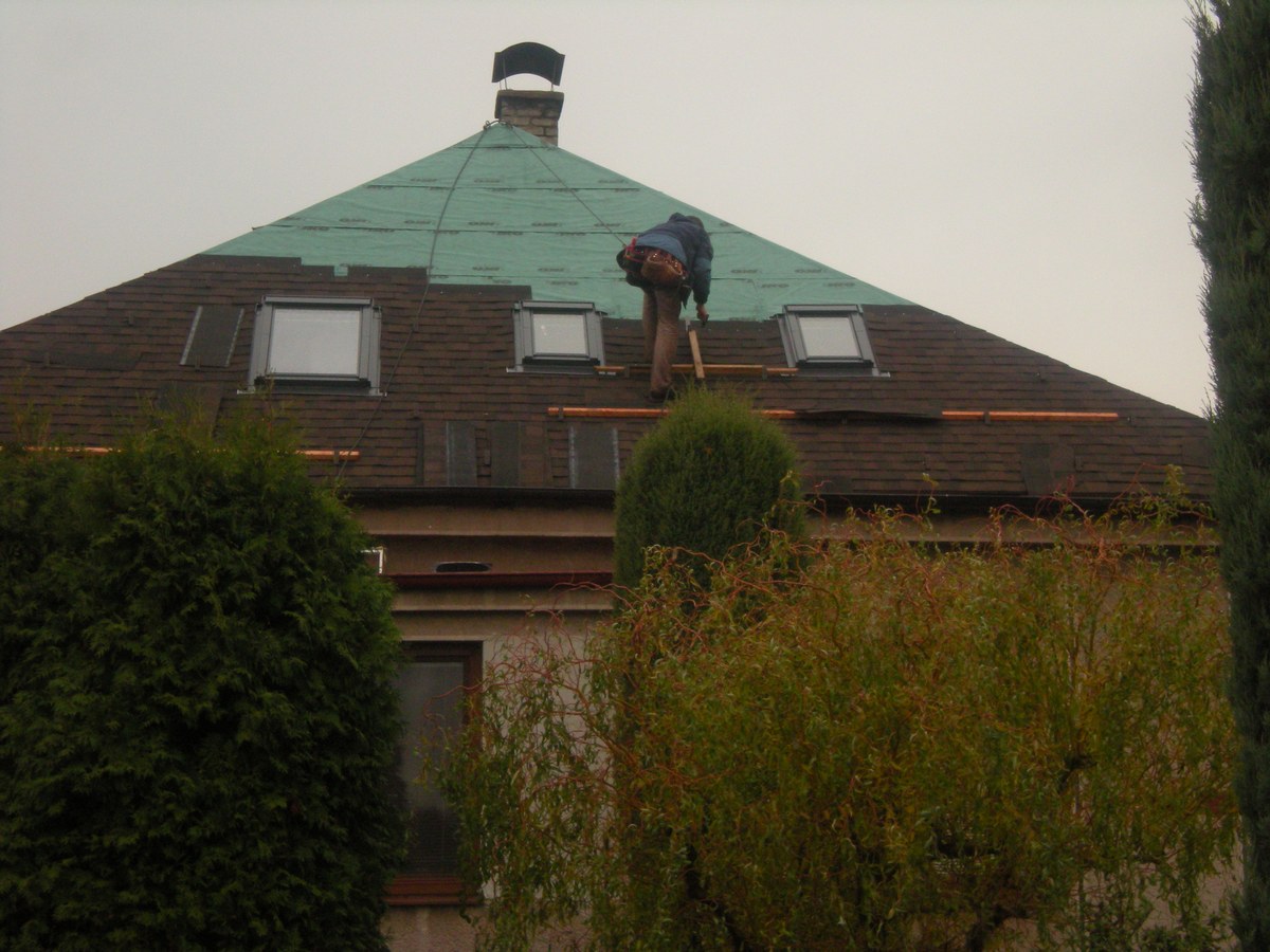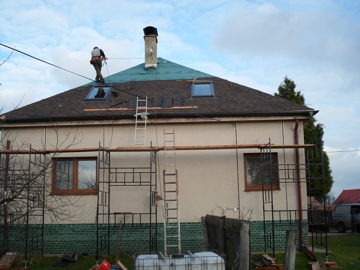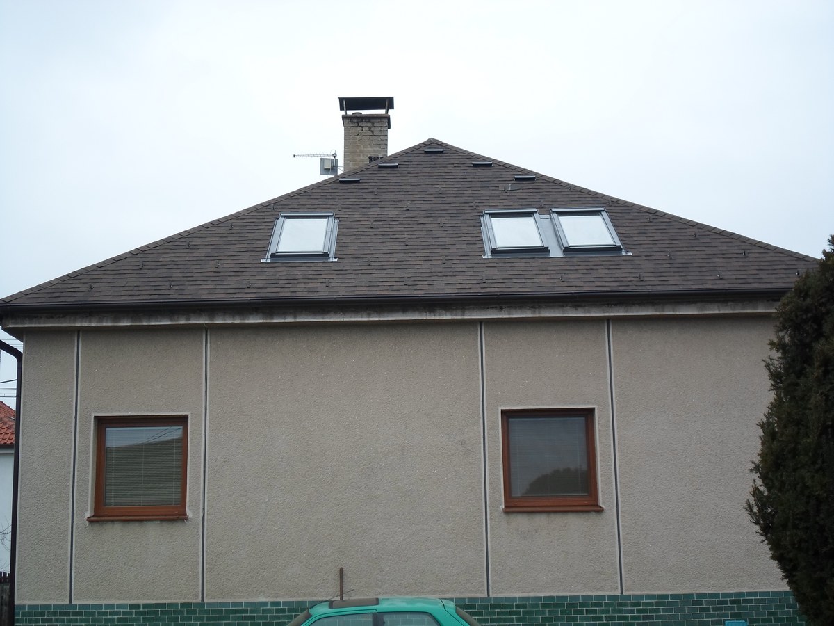 Odstranění a likvidace eternitu, odvětraná střecha - dvojité bednění, montáž 9ks oken velux, montáž žlabů a svodů, prostupu antény, stoupací plošiny, oplechování komínu, montáž dvouvrstvé šindele IKO Cambridge