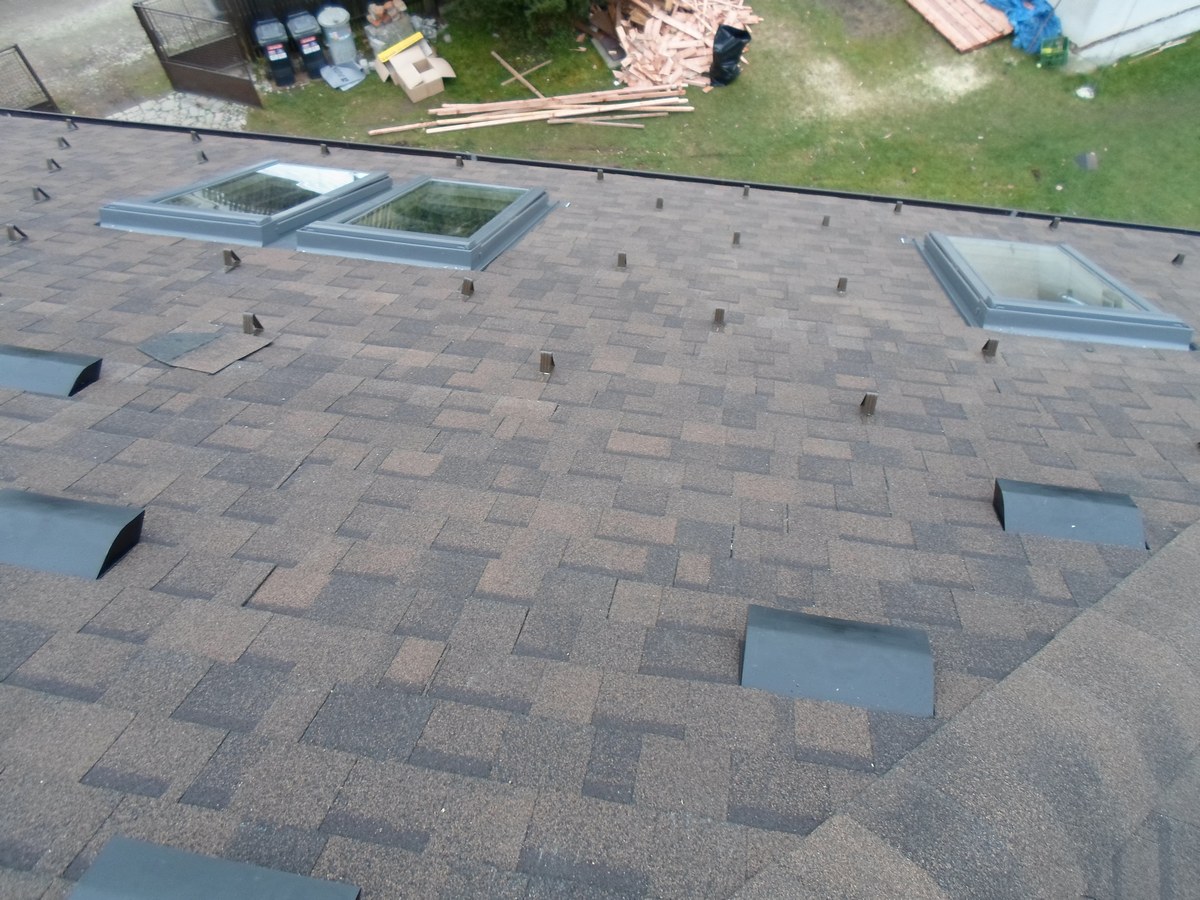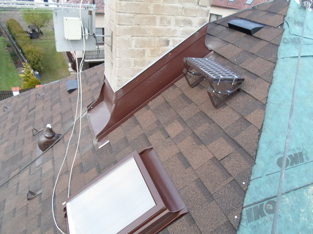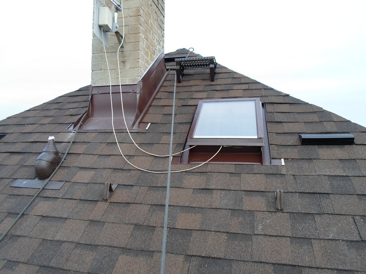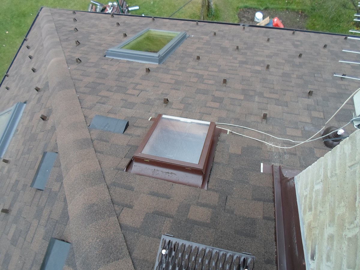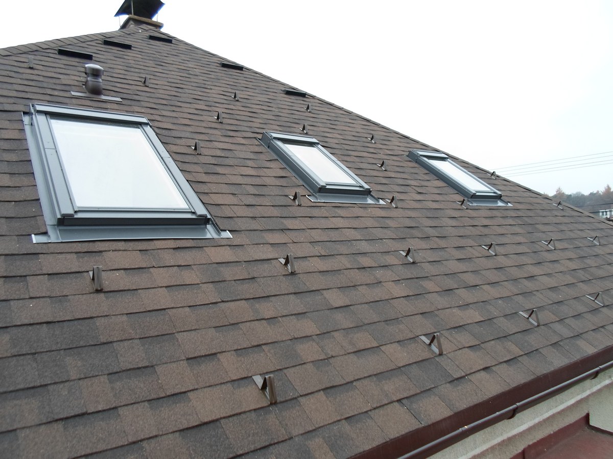 Odstranění a likvidace eternitu, odvětraná střecha - dvojité bednění, montáž 9ks oken velux, montáž žlabů a svodů, prostupu antény, stoupací plošiny, oplechování komínu, montáž dvouvrstvé šindele IKO Cambridge