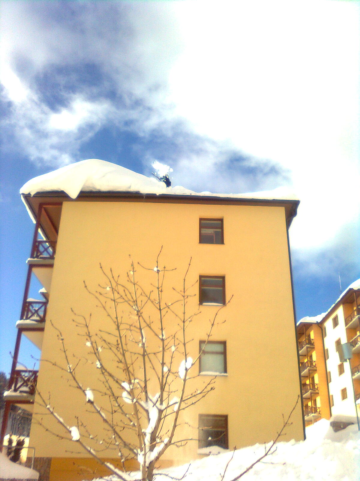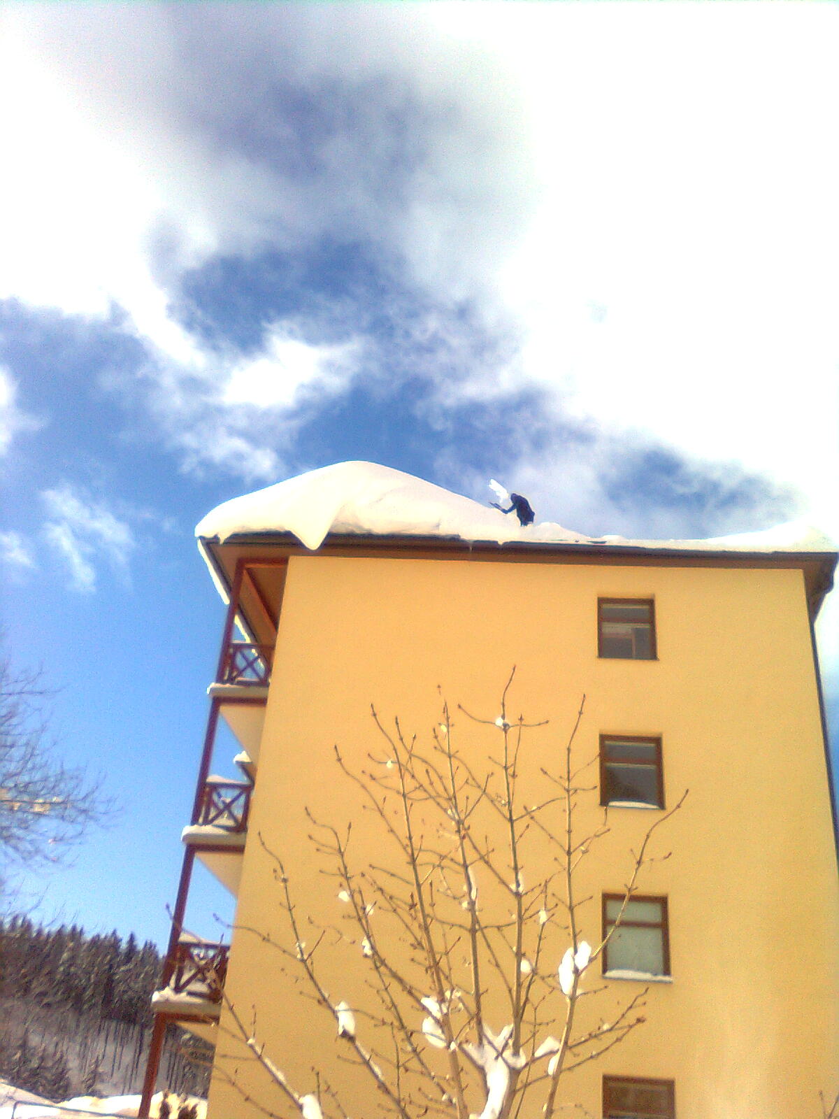 Odstranění sněhu ze střechy, bytový dům Janské Lázně