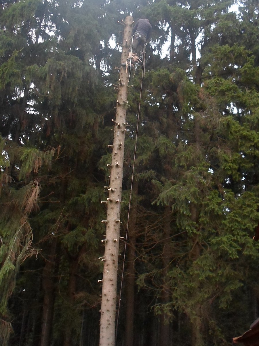 Postupné kácení smrku ohrožující dřevěnou chatu