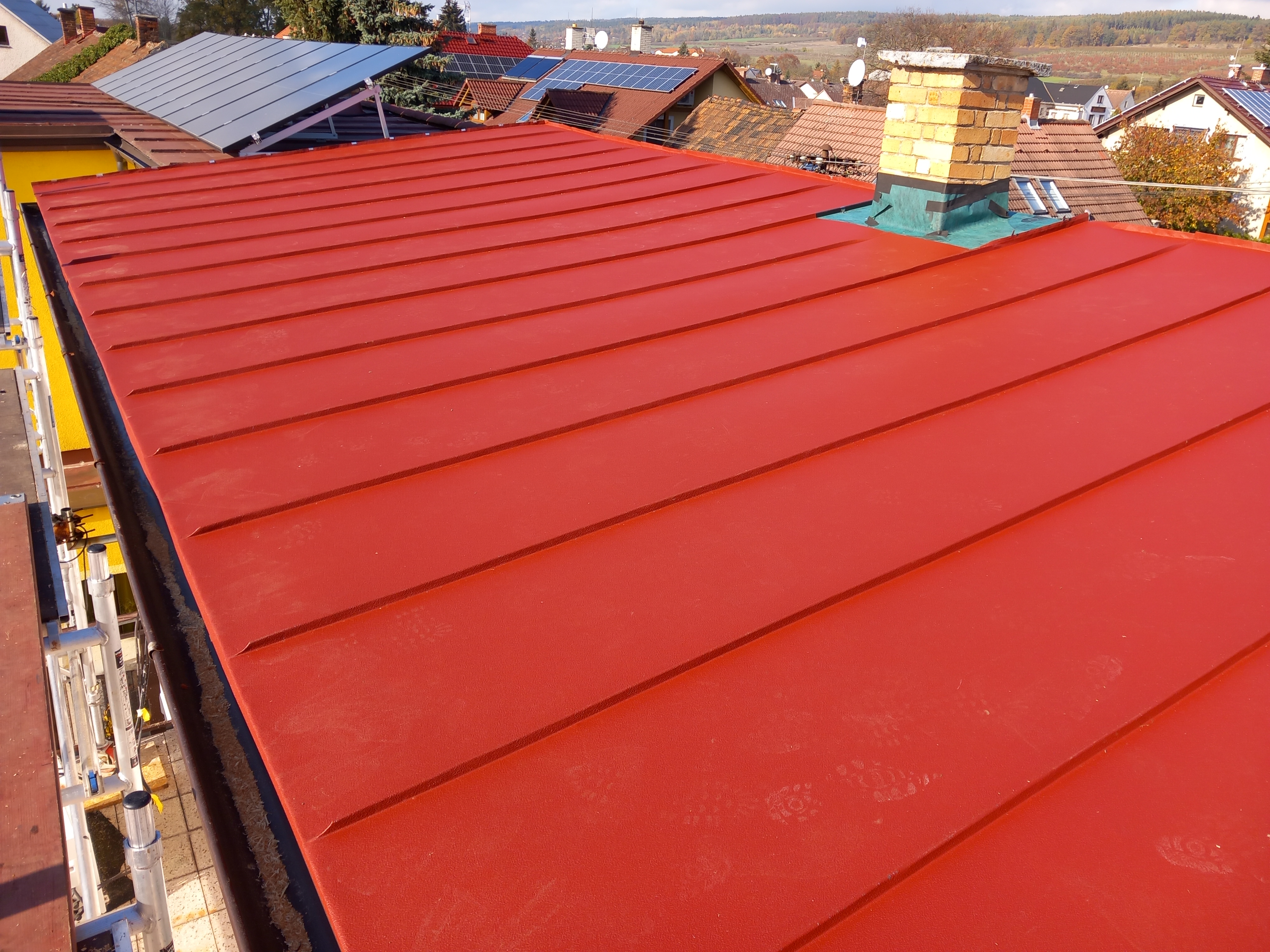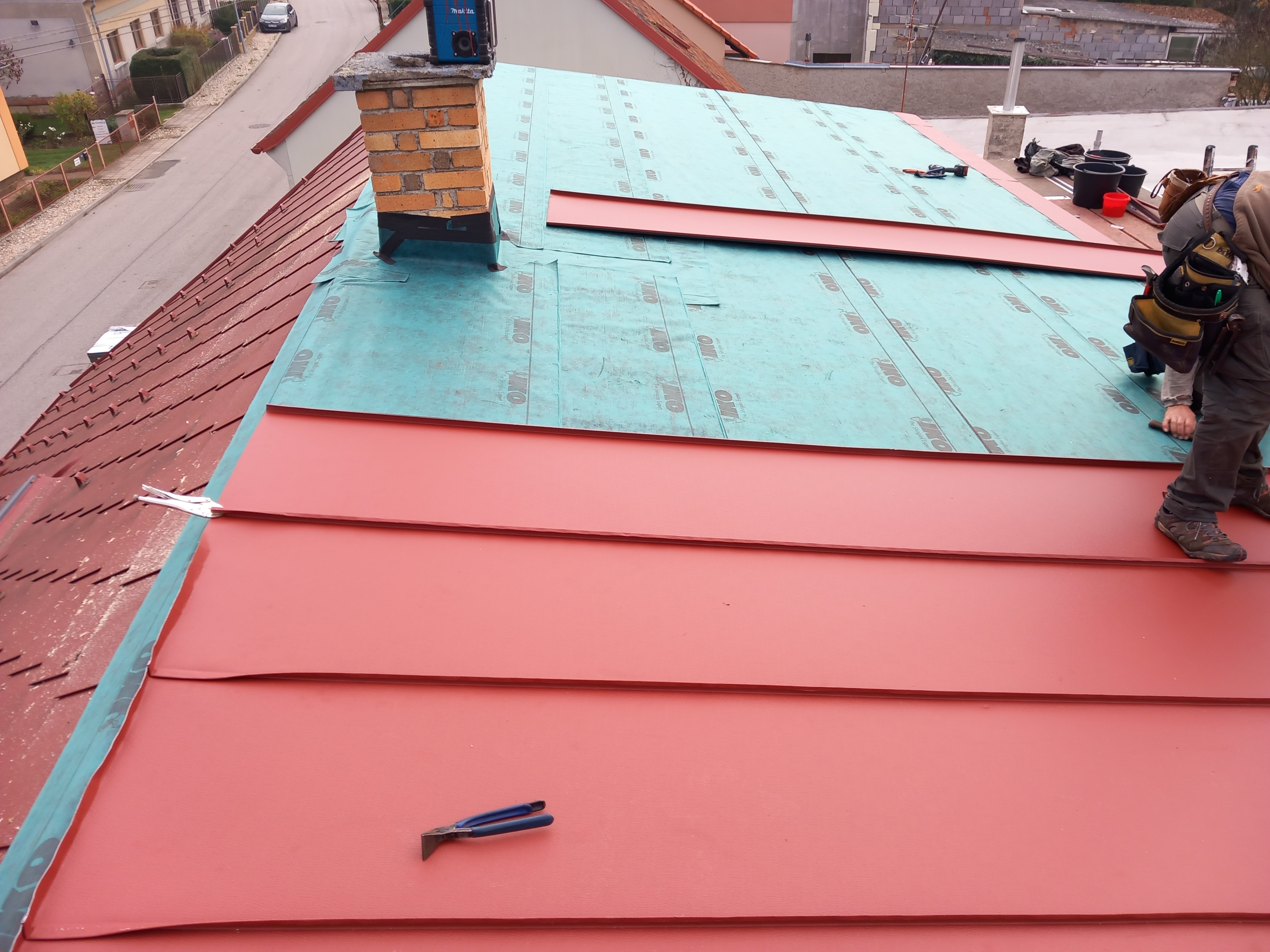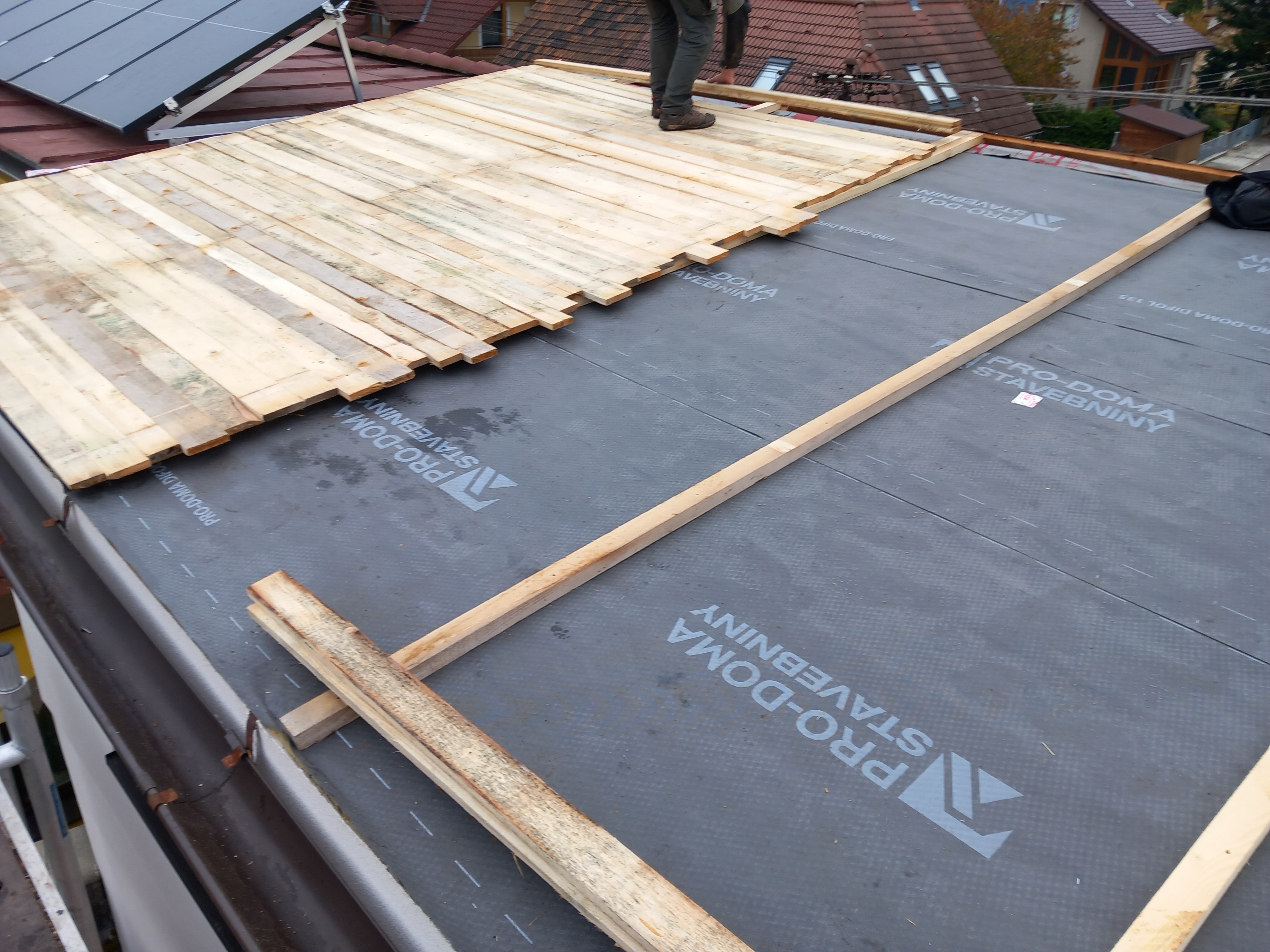 Rekonstrukce střechy krytinou Prefalz, po demontáži dožilé krytiny jsme zjistily, že třetina střechy má vyhnilá prkna, po dohodě s investorem jsme navrhli, výměnu poškozených prken a střechu odvětrat dvojitým bedněním a následně položit krytinu. odstín Prefalz tmavě červená.