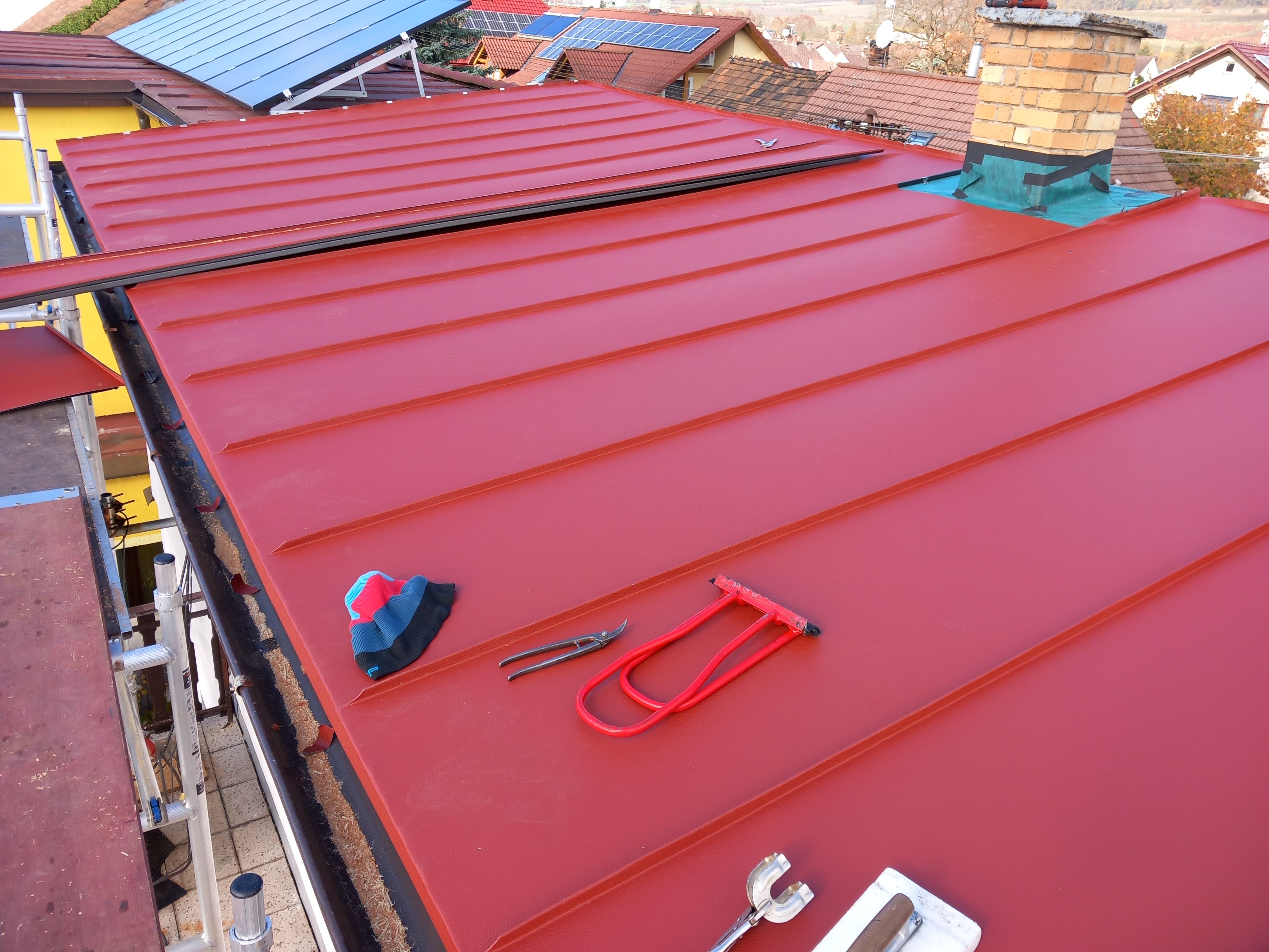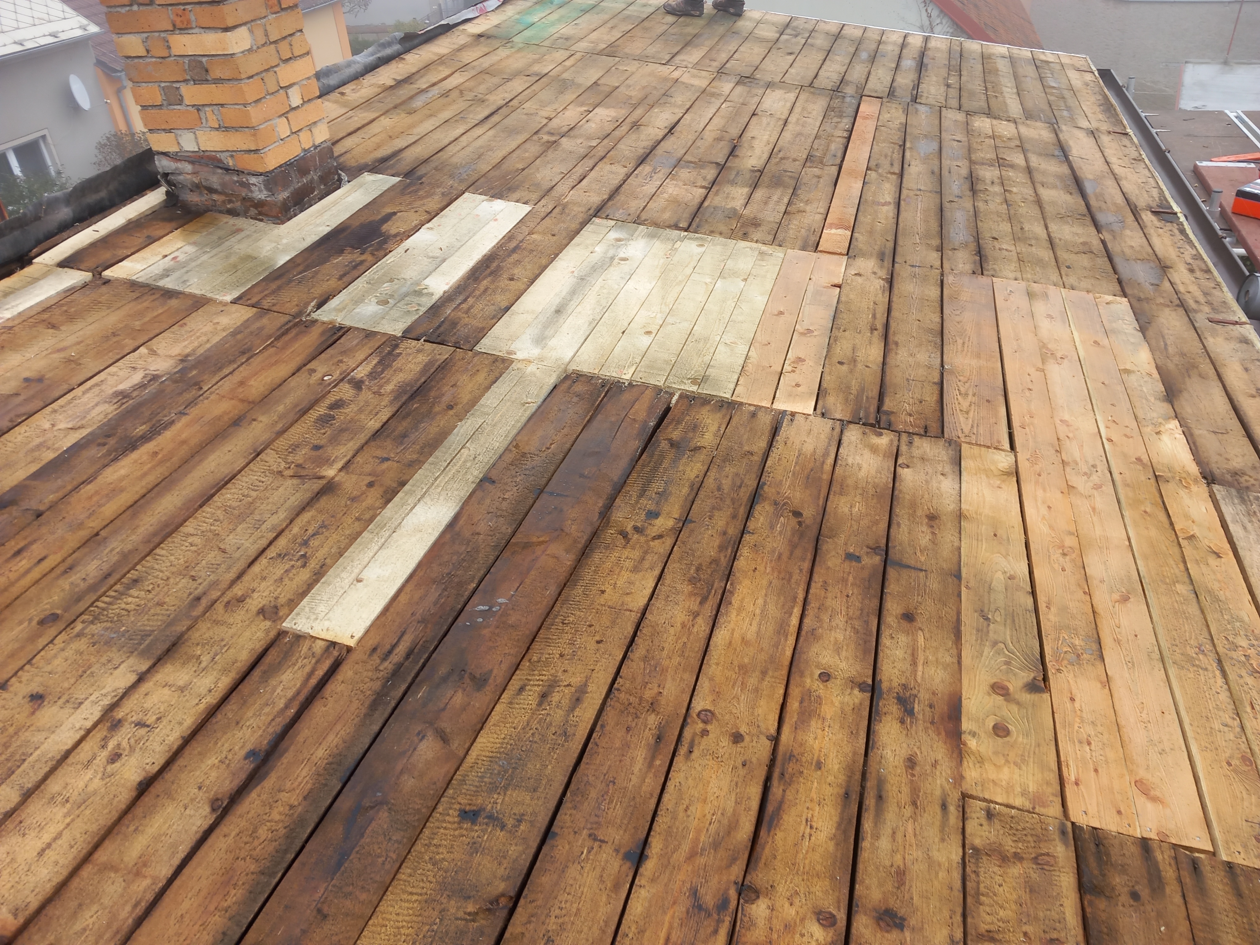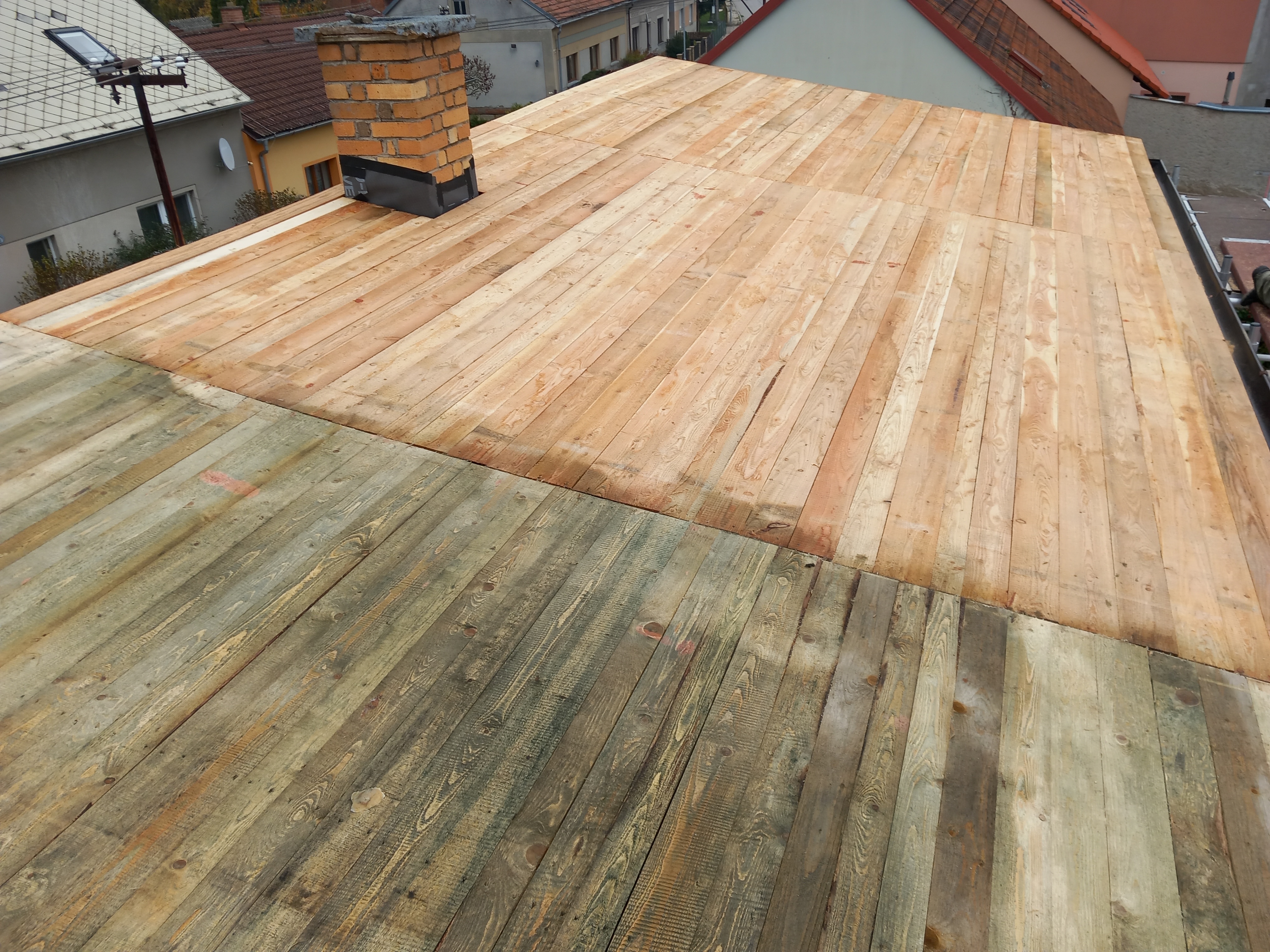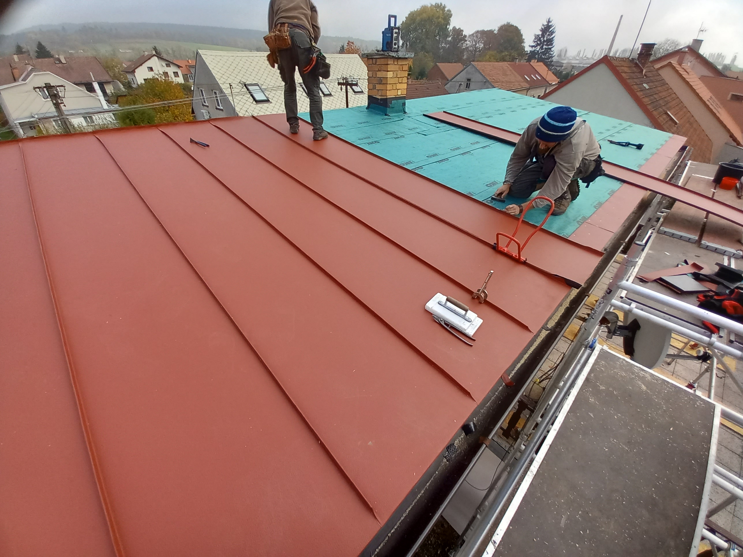 Rekonstrukce střechy krytinou Prefalz, po demontáži dožilé krytiny jsme zjistily, že třetina střechy má vyhnilá prkna, po dohodě s investorem jsme navrhli, výměnu poškozených prken a střechu odvětrat dvojitým bedněním a následně položit krytinu. odstín Prefalz tmavě červená.