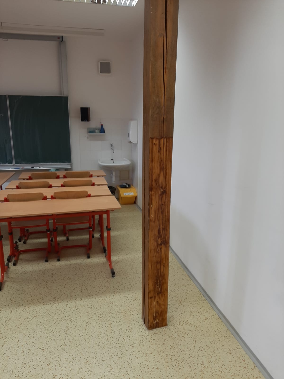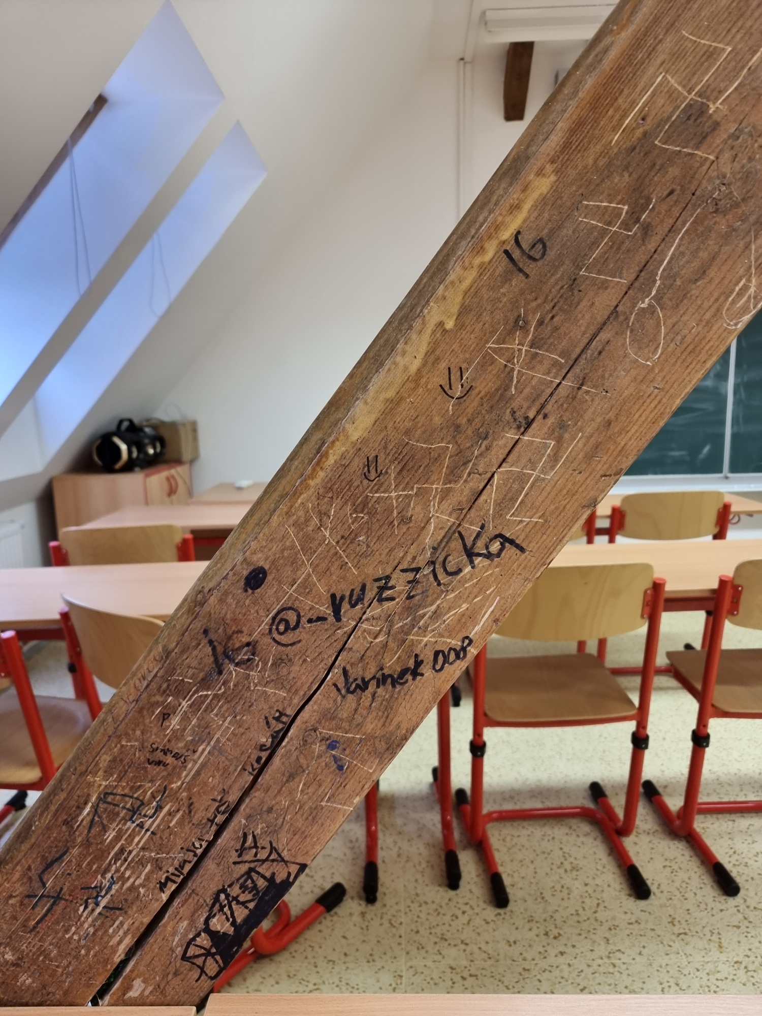 oprava poškozeného trámu ve školní třídě, obroušení trámu a nanešení nové vrstvy protipožárního nátěru.