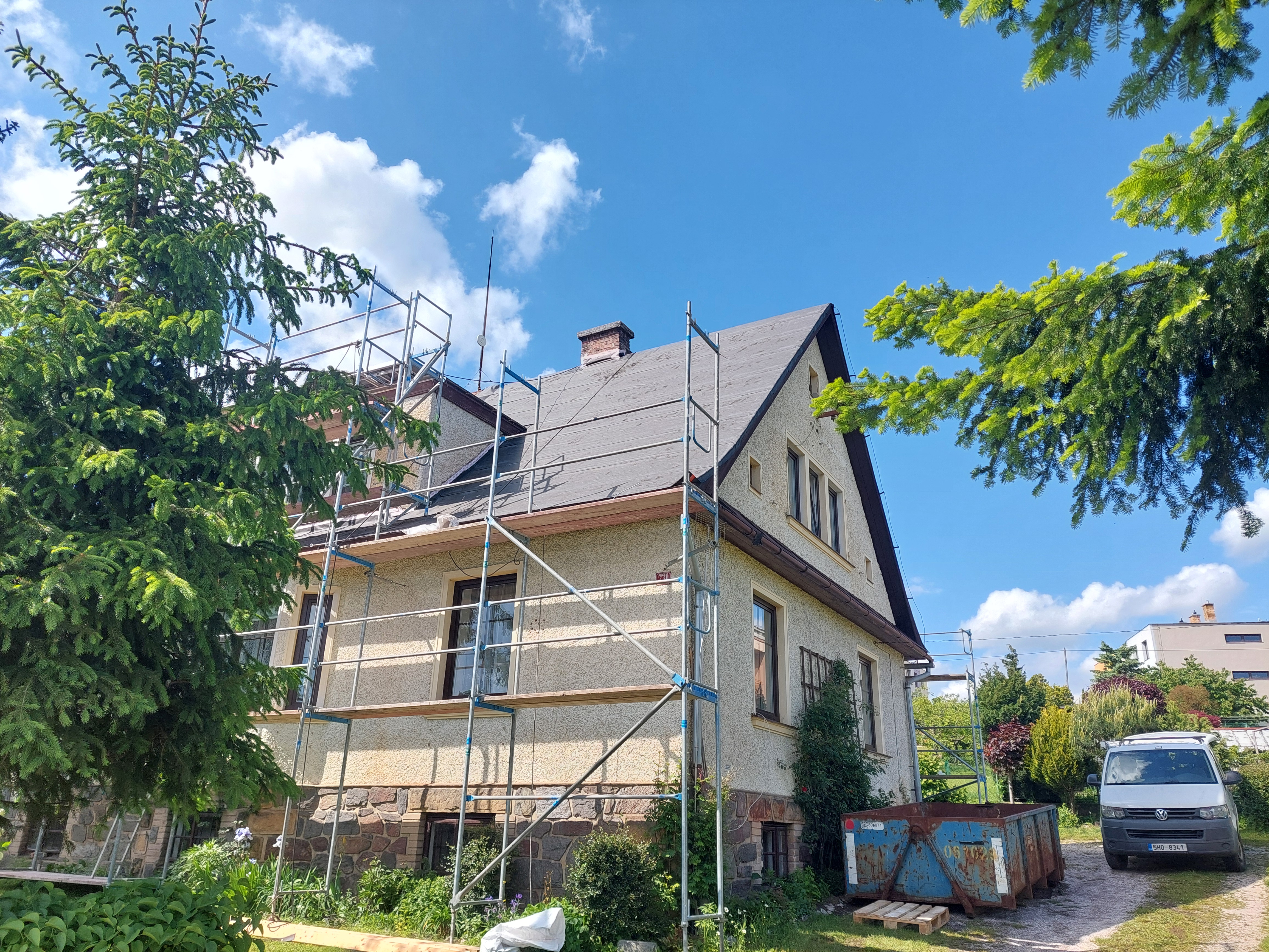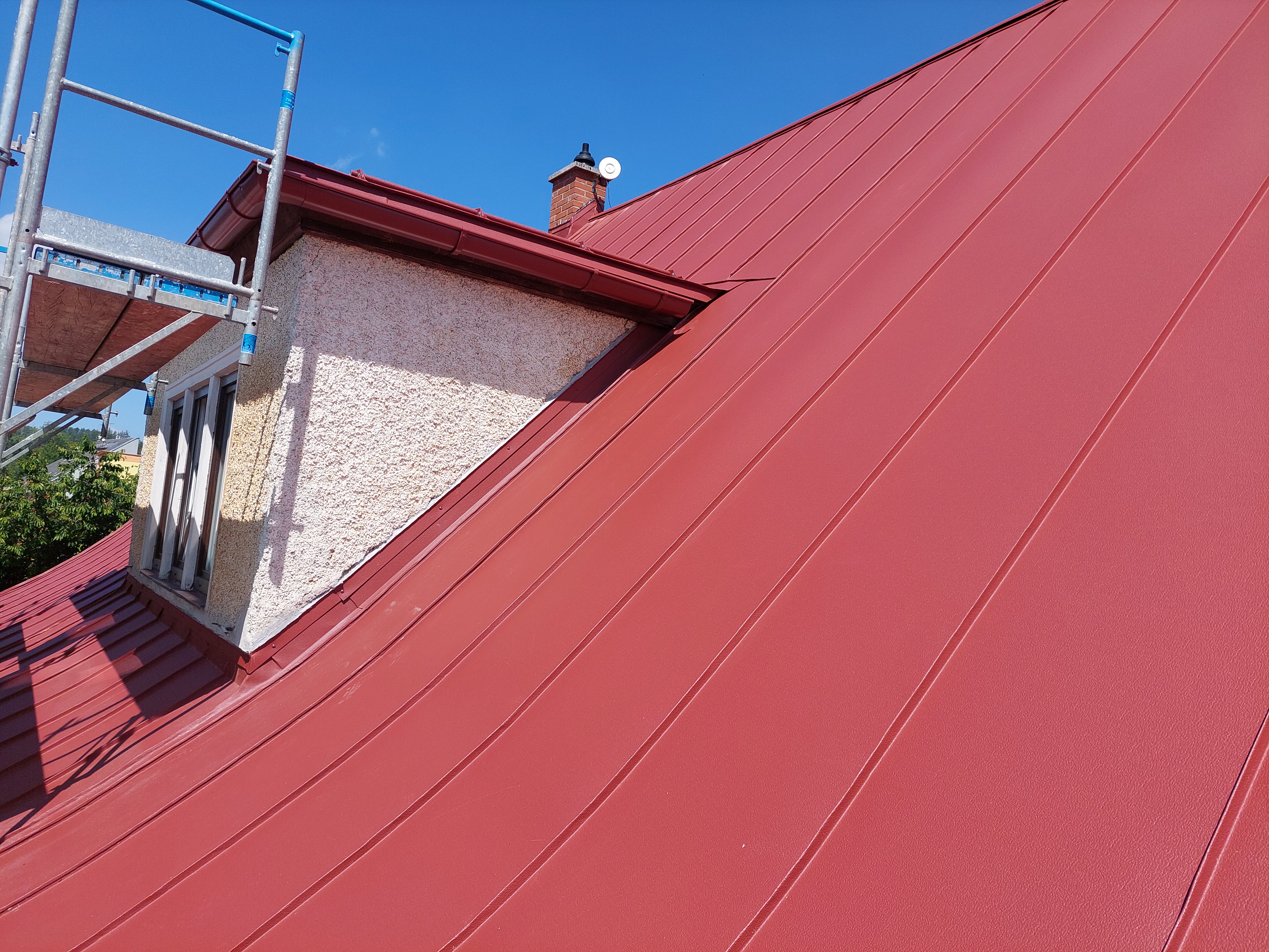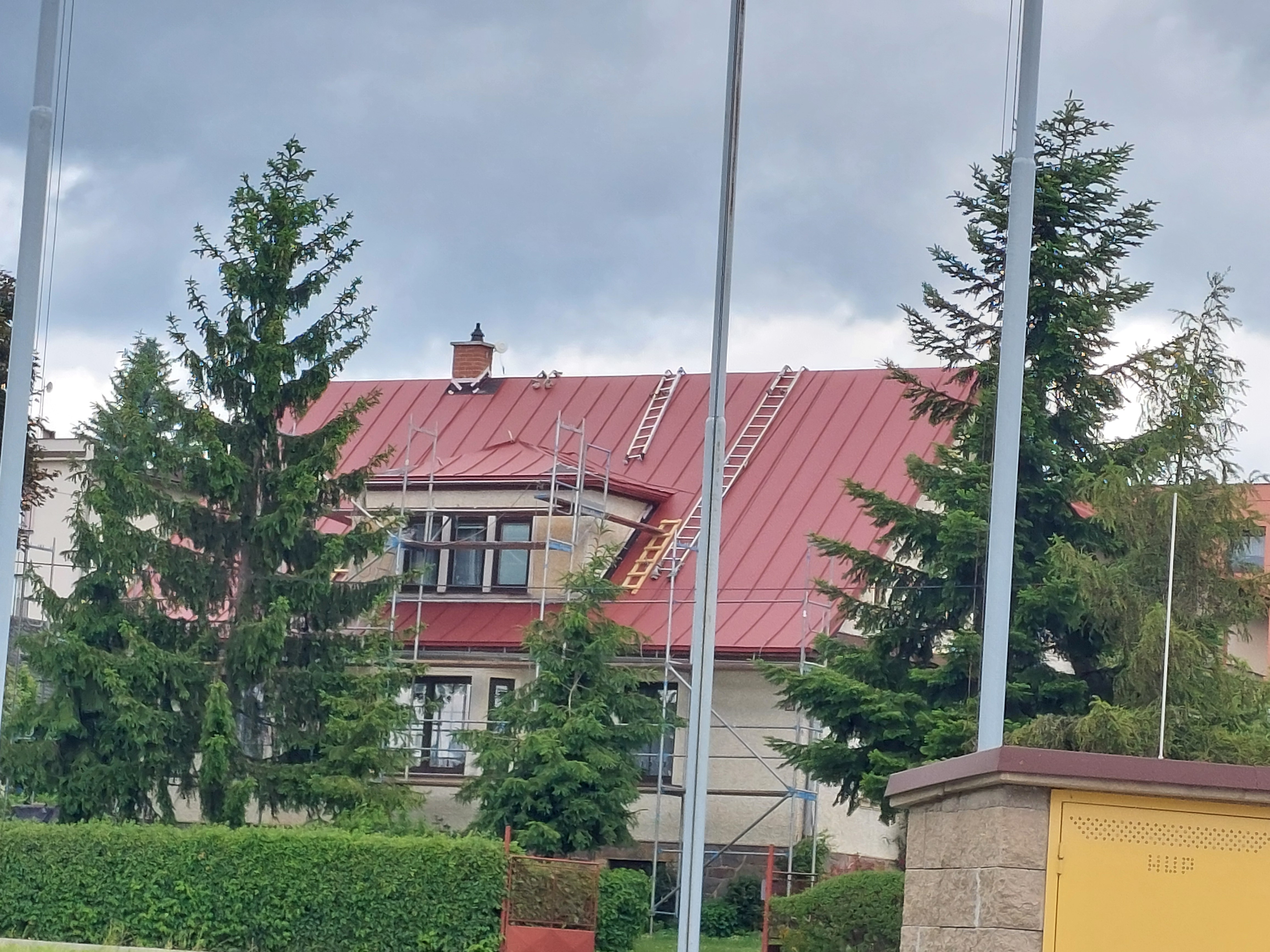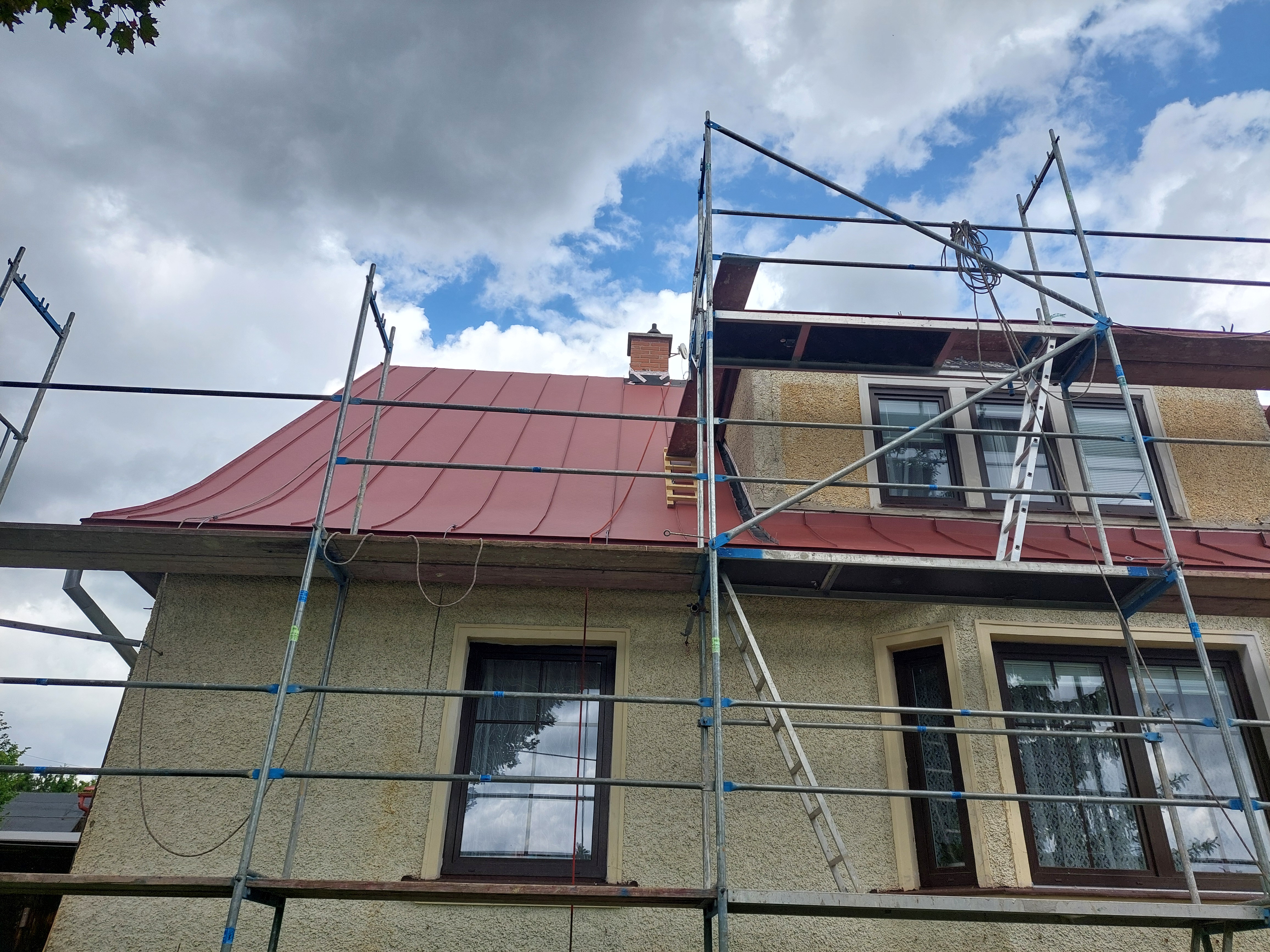 Realizovali jsme rekonstrukci 50let staré střechy, došlo k výměně za lehkou hliníkovou střechu Prefalz, dále jsme odbourali nefunkční rozpadlý komín. Práce proběhli v souladu s požadavky zákazníka.