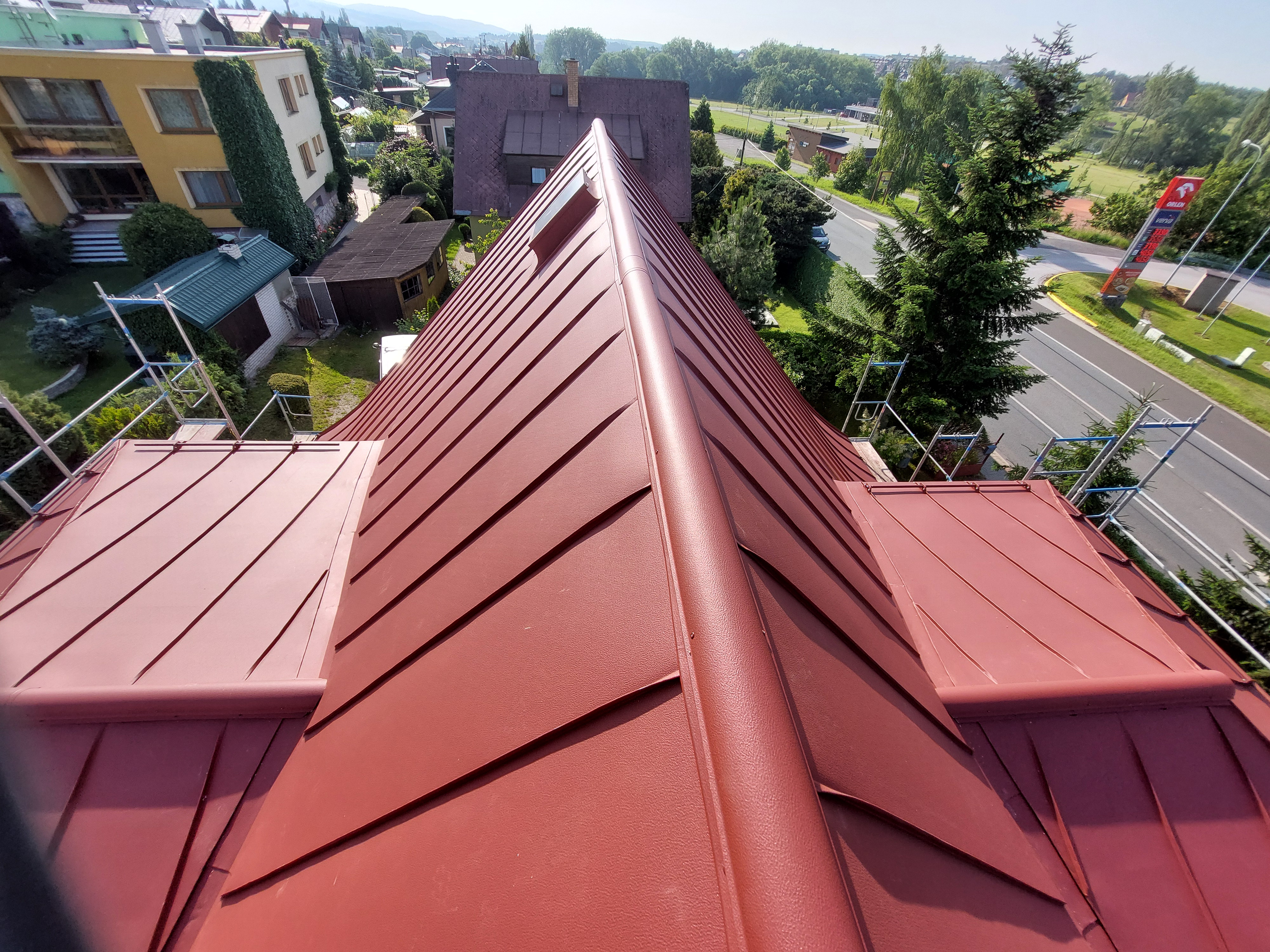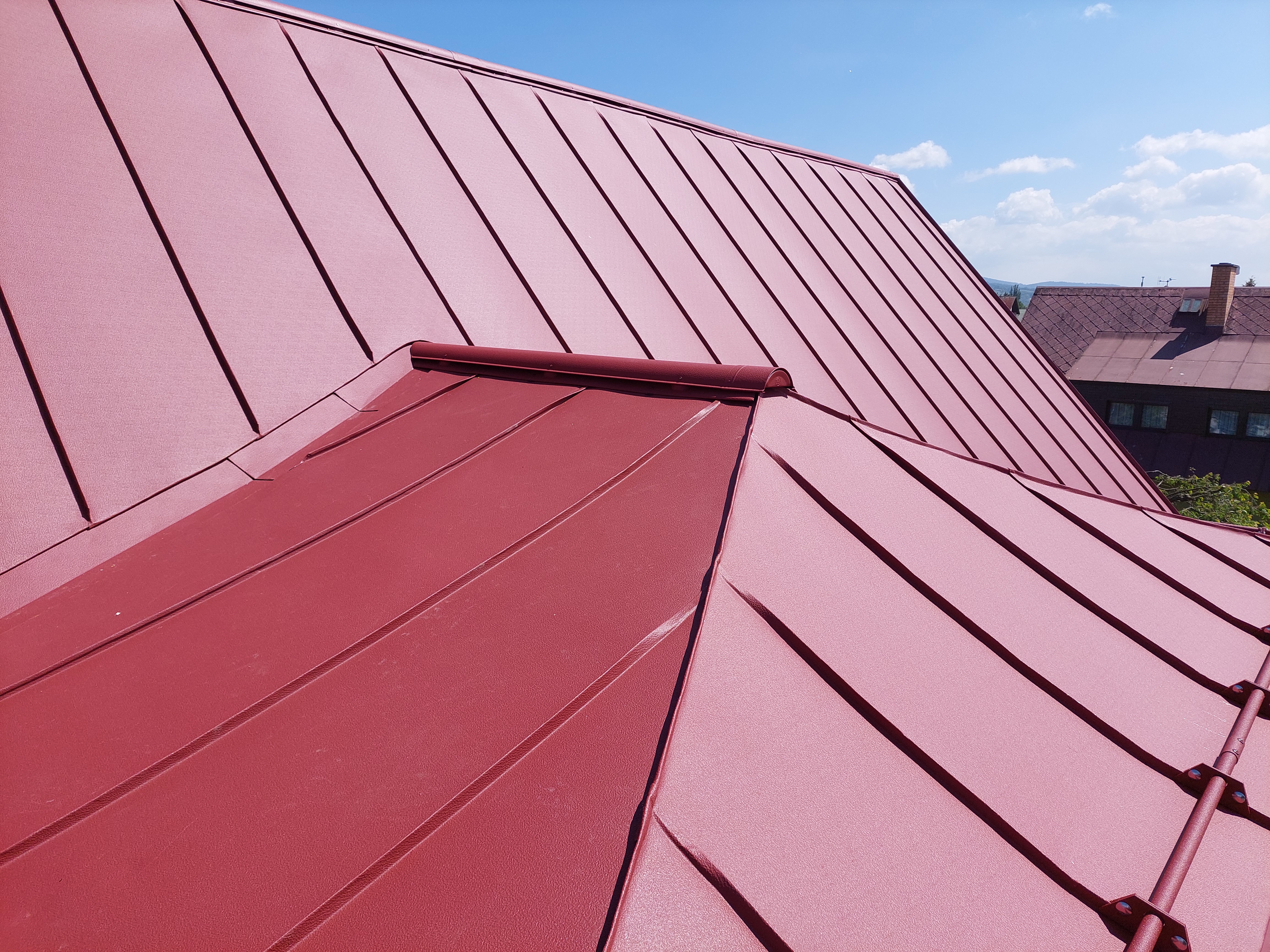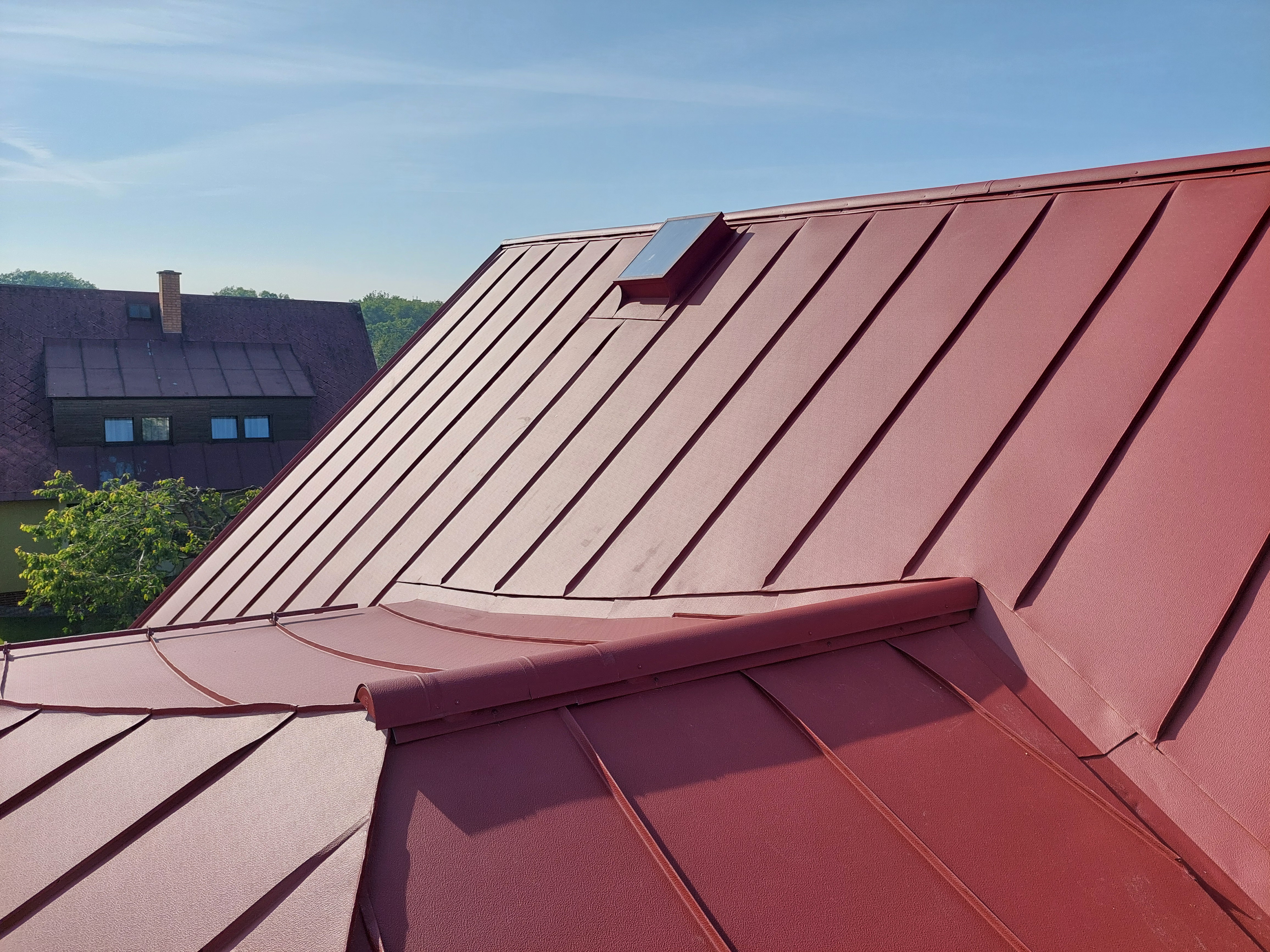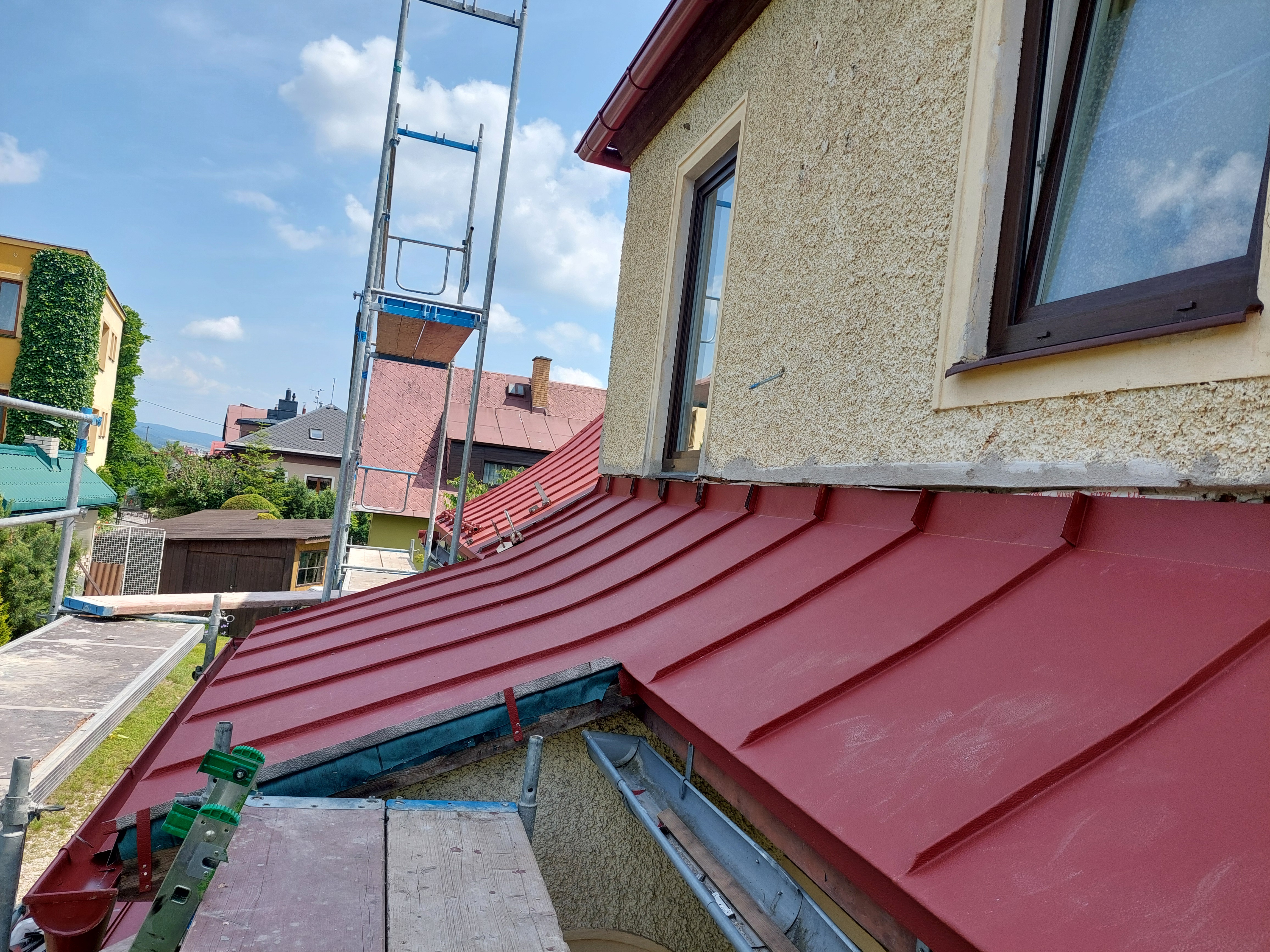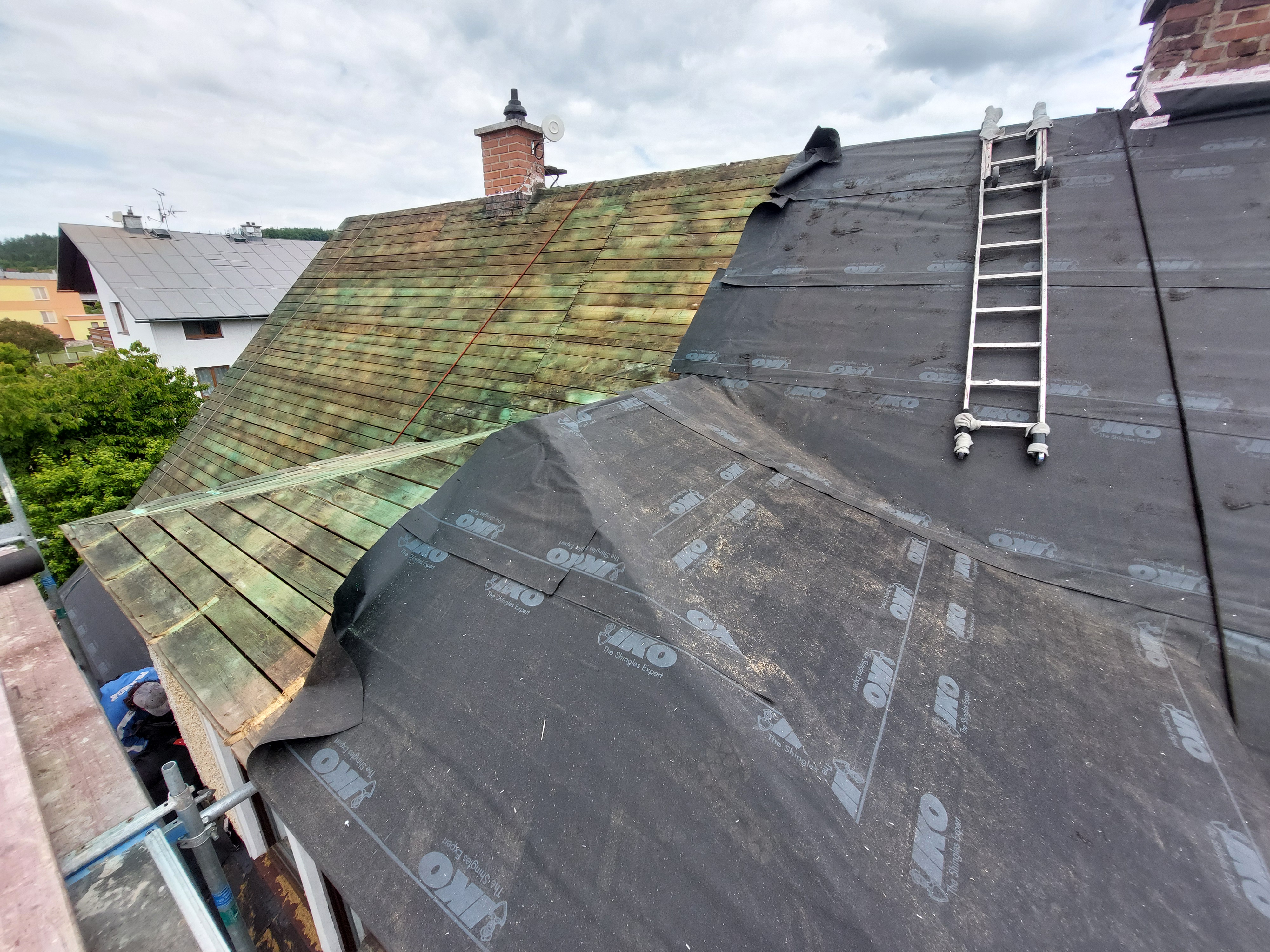 Realizovali jsme rekonstrukci 50let staré střechy, došlo k výměně za lehkou hliníkovou střechu Prefalz, dále jsme odbourali nefunkční rozpadlý komín. Práce proběhli v souladu s požadavky zákazníka.