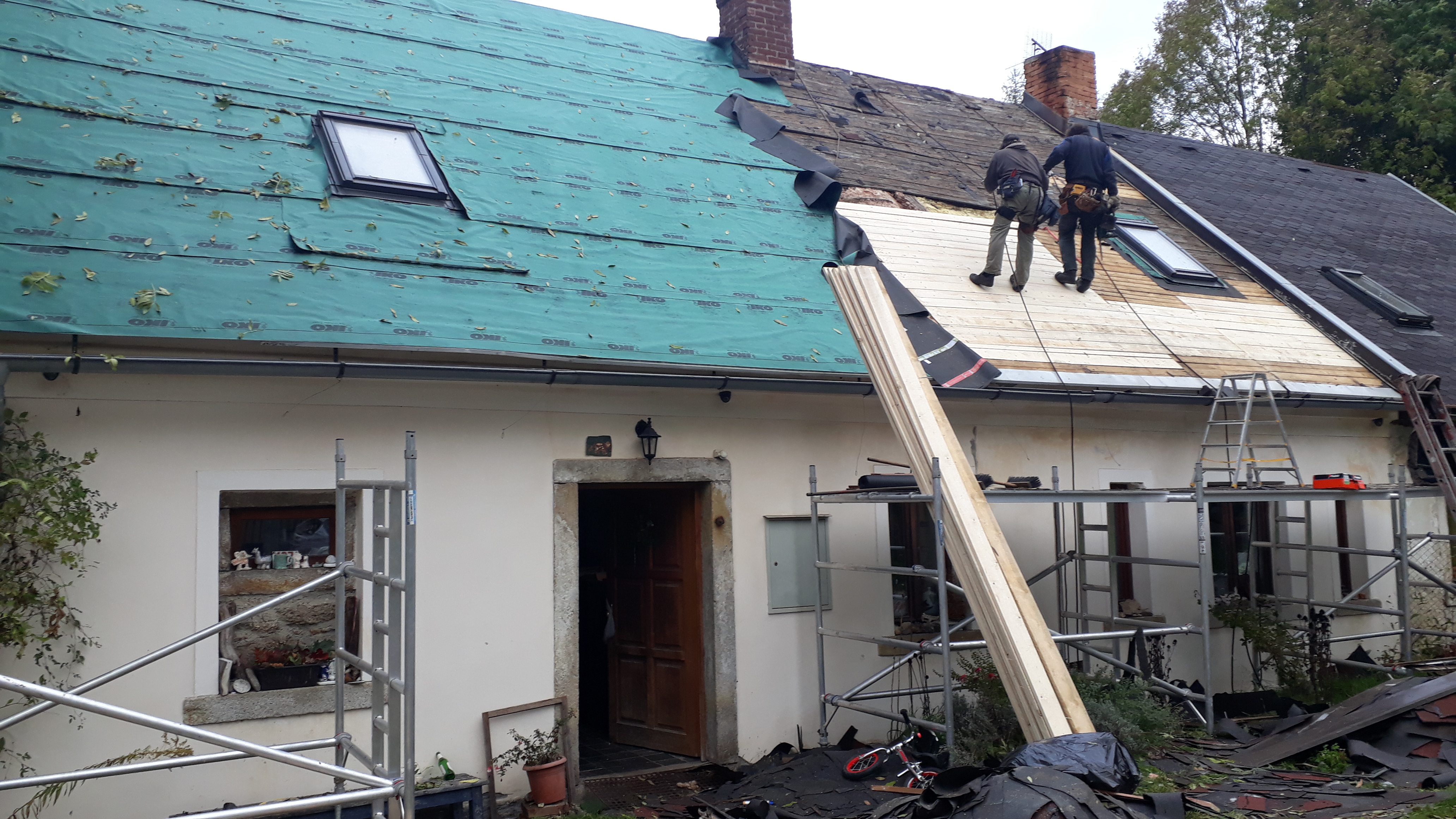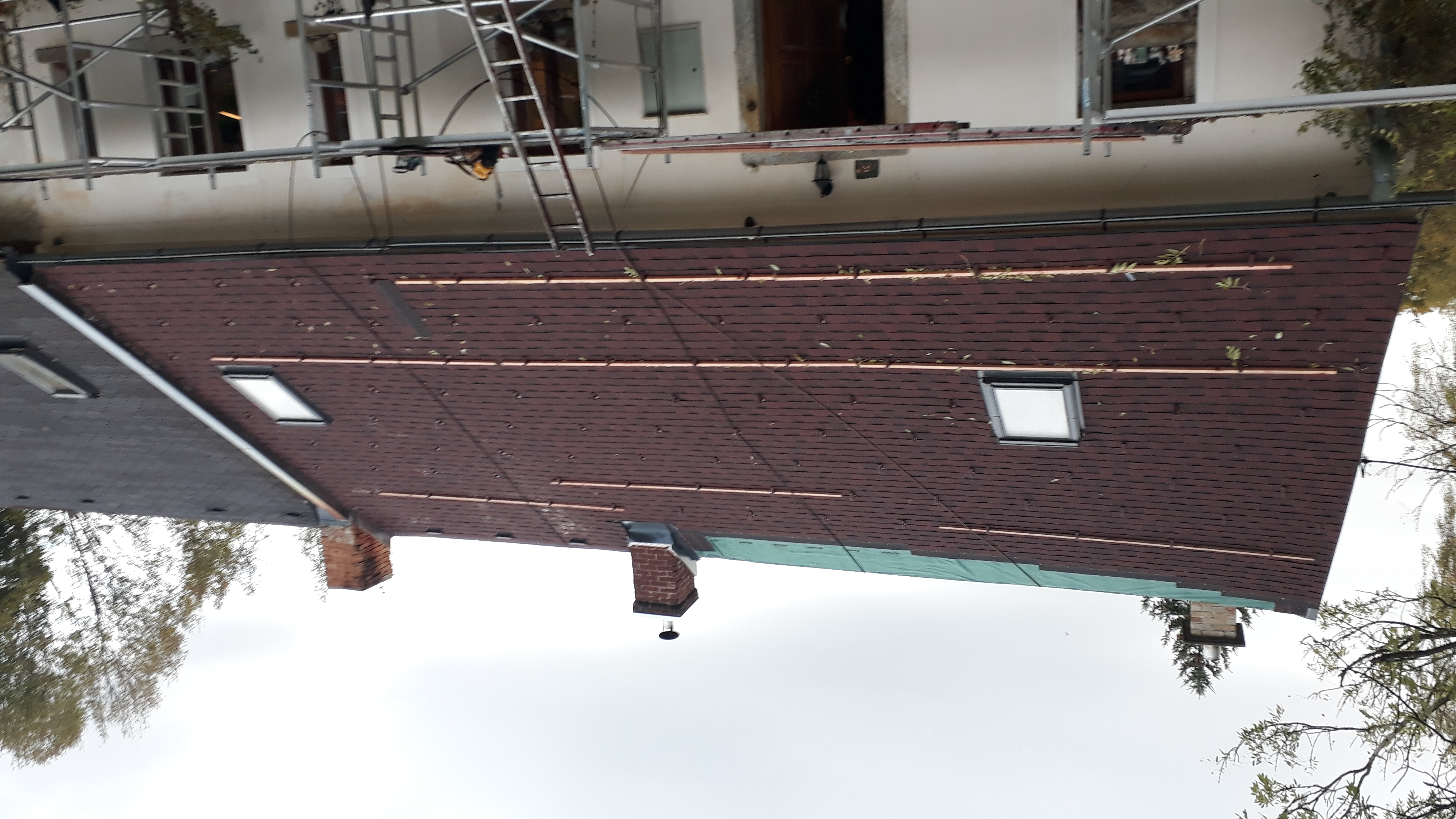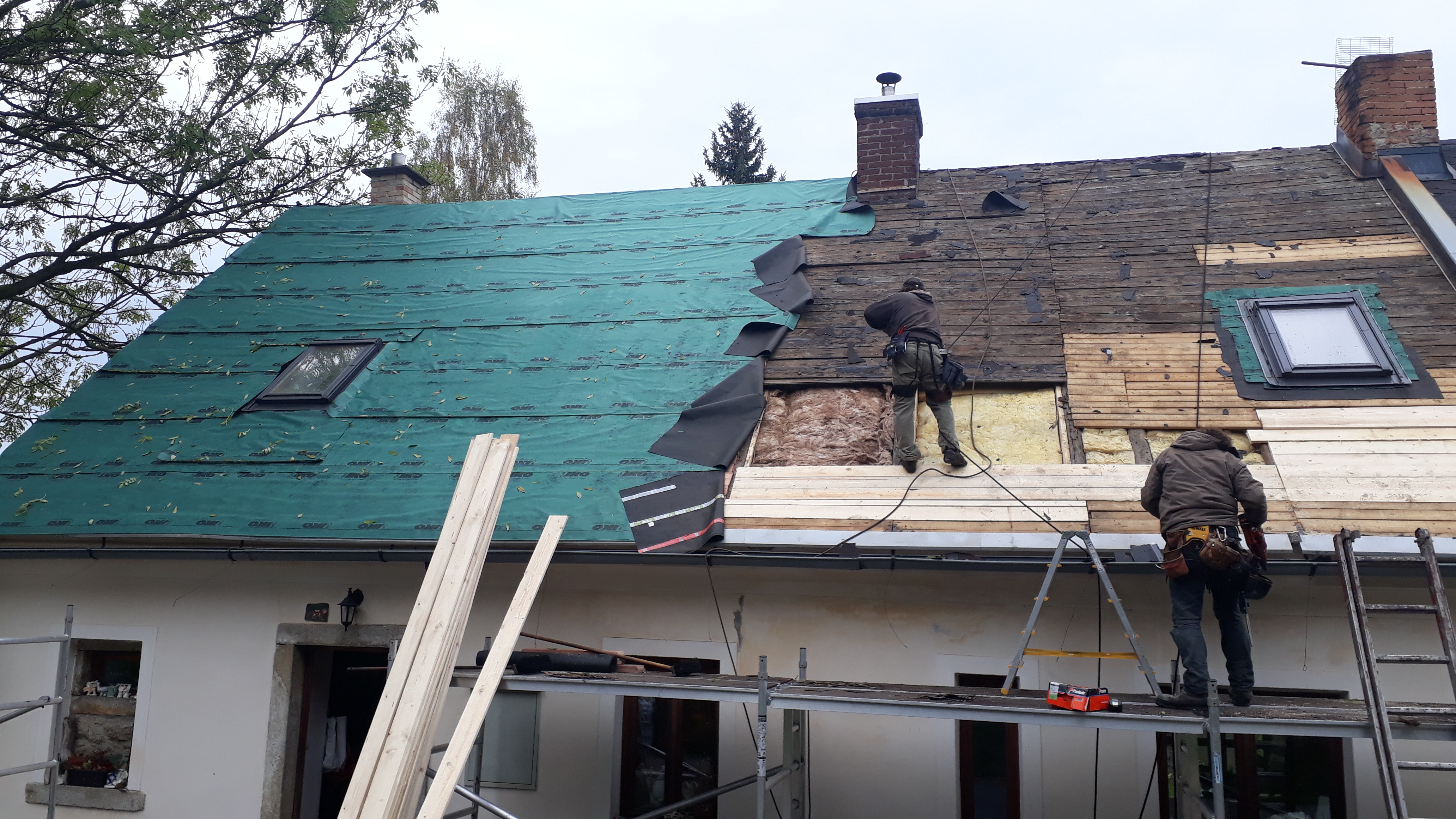 provedli jsme kompletní výměnu staré střešní krytiny, demontáž staré krytiny, výměna starého bednění, nové střešní folie, montáž nové střešní krytiny včetně protisněhových zábran.