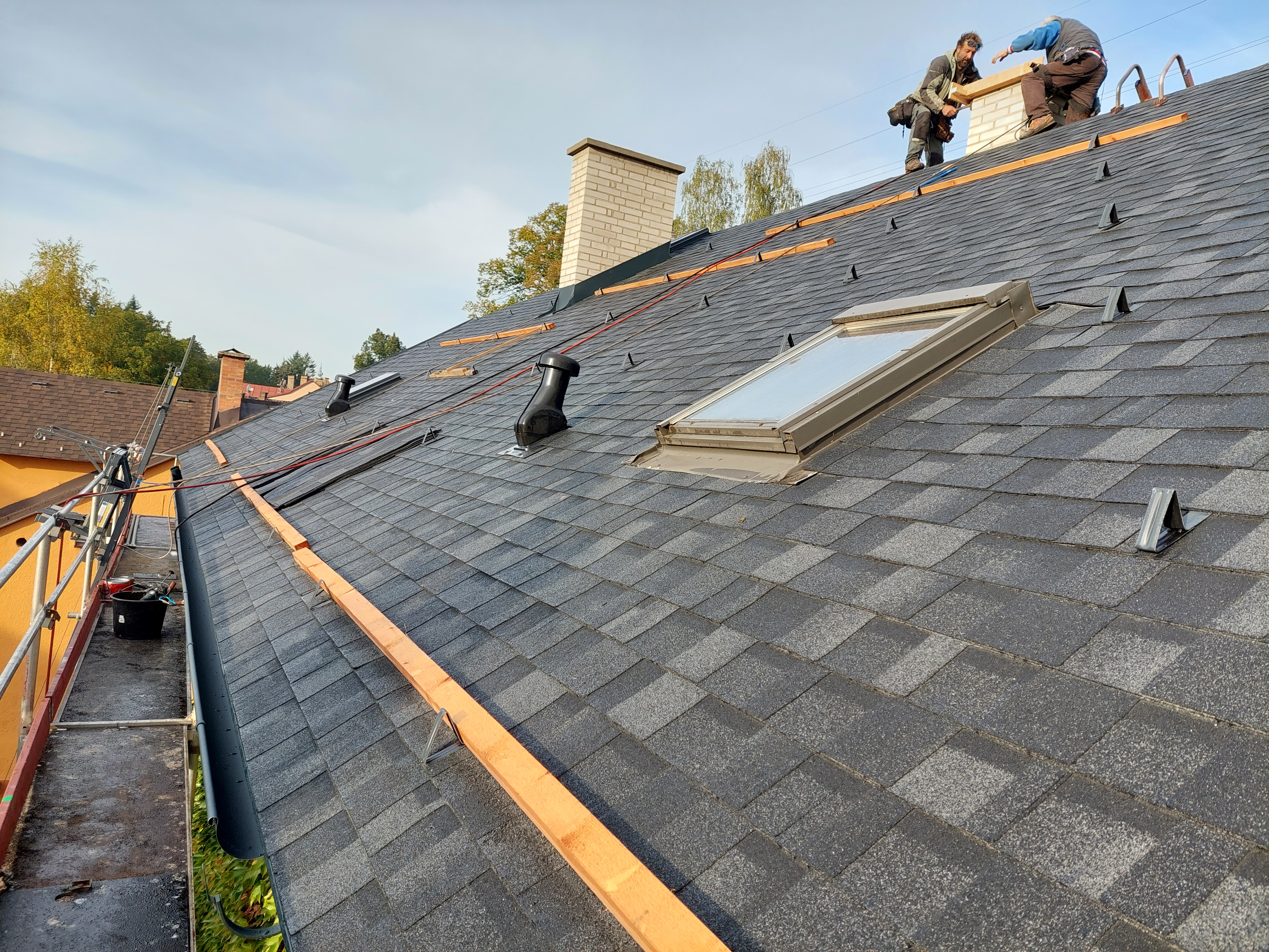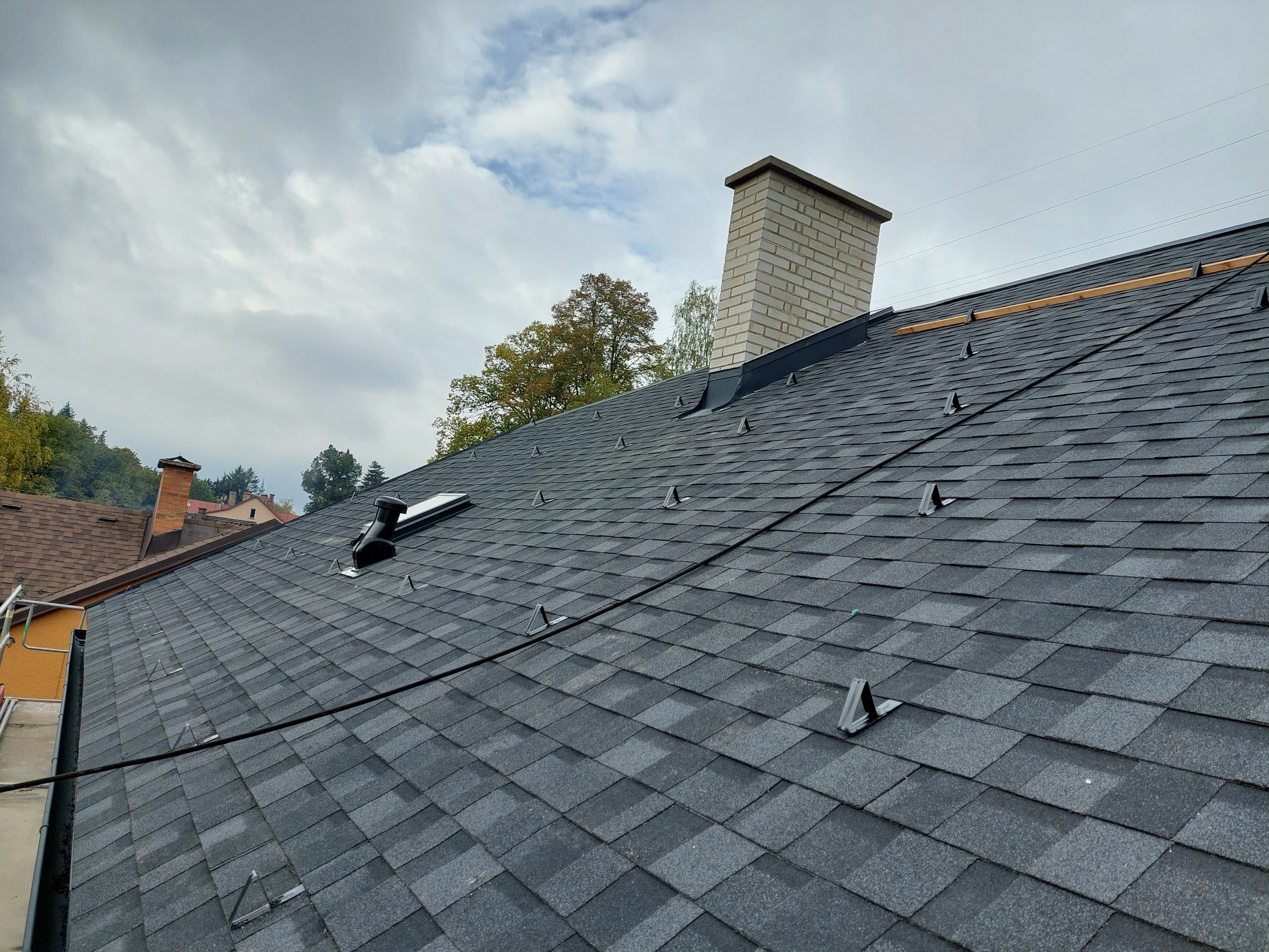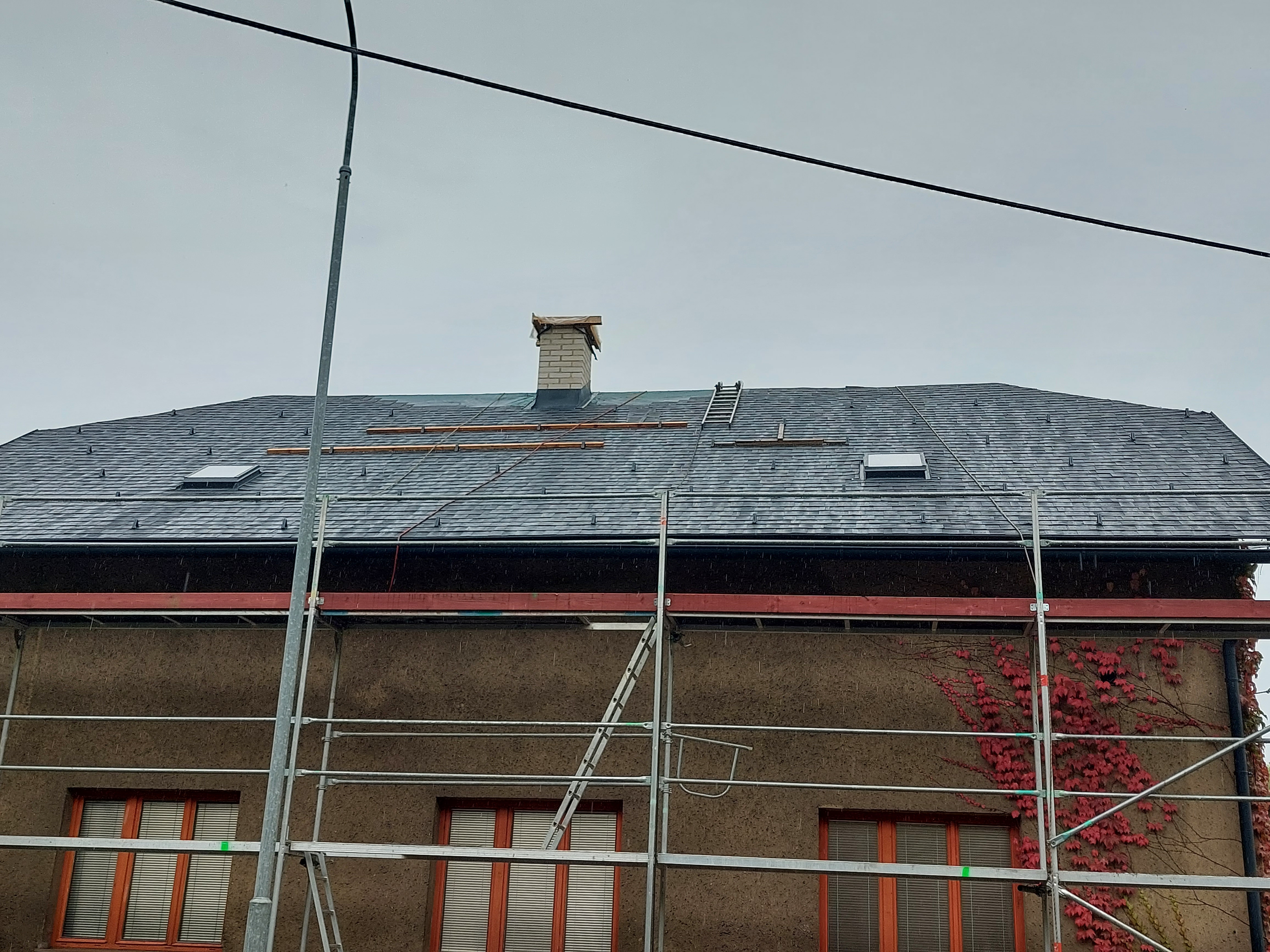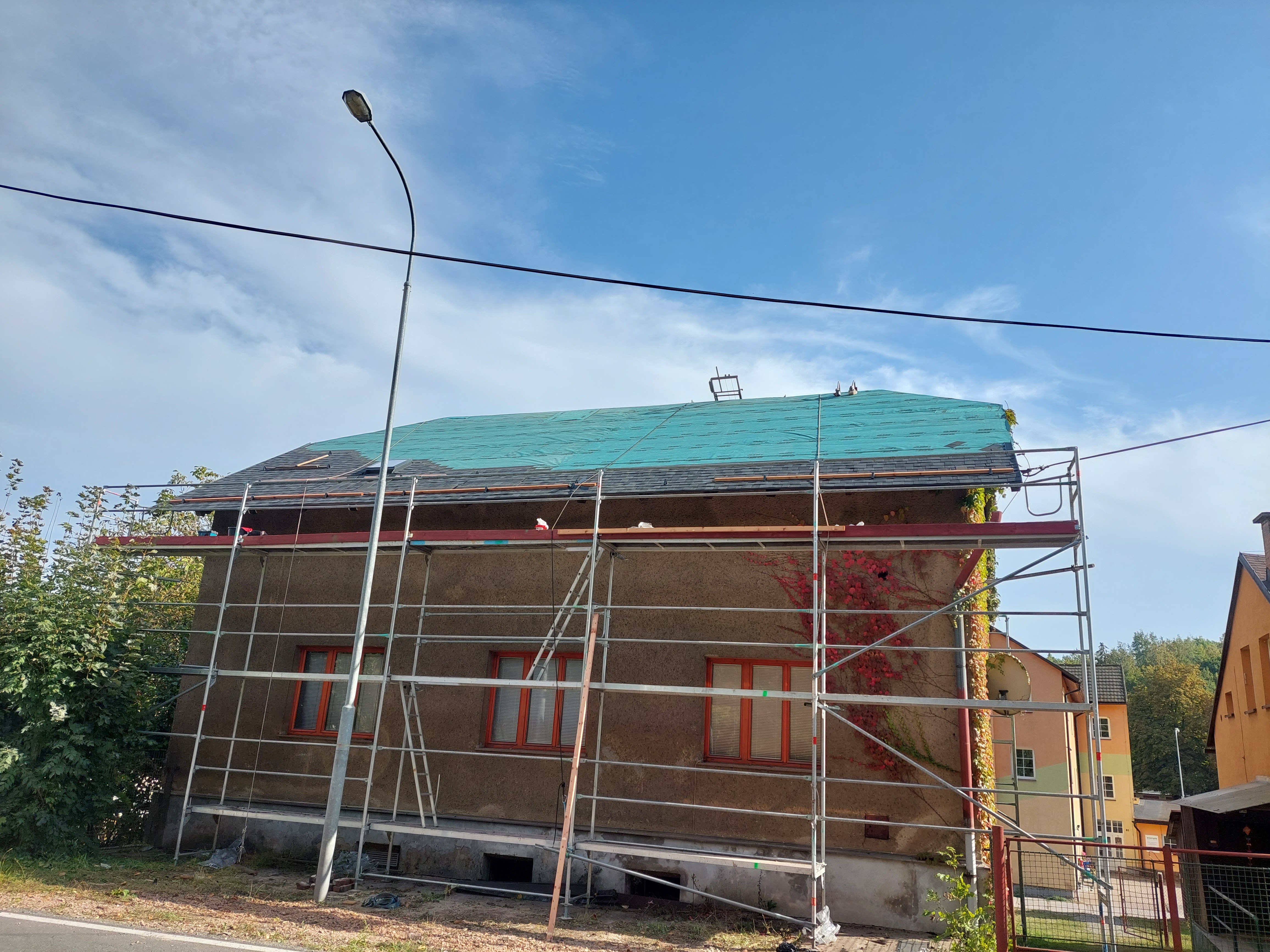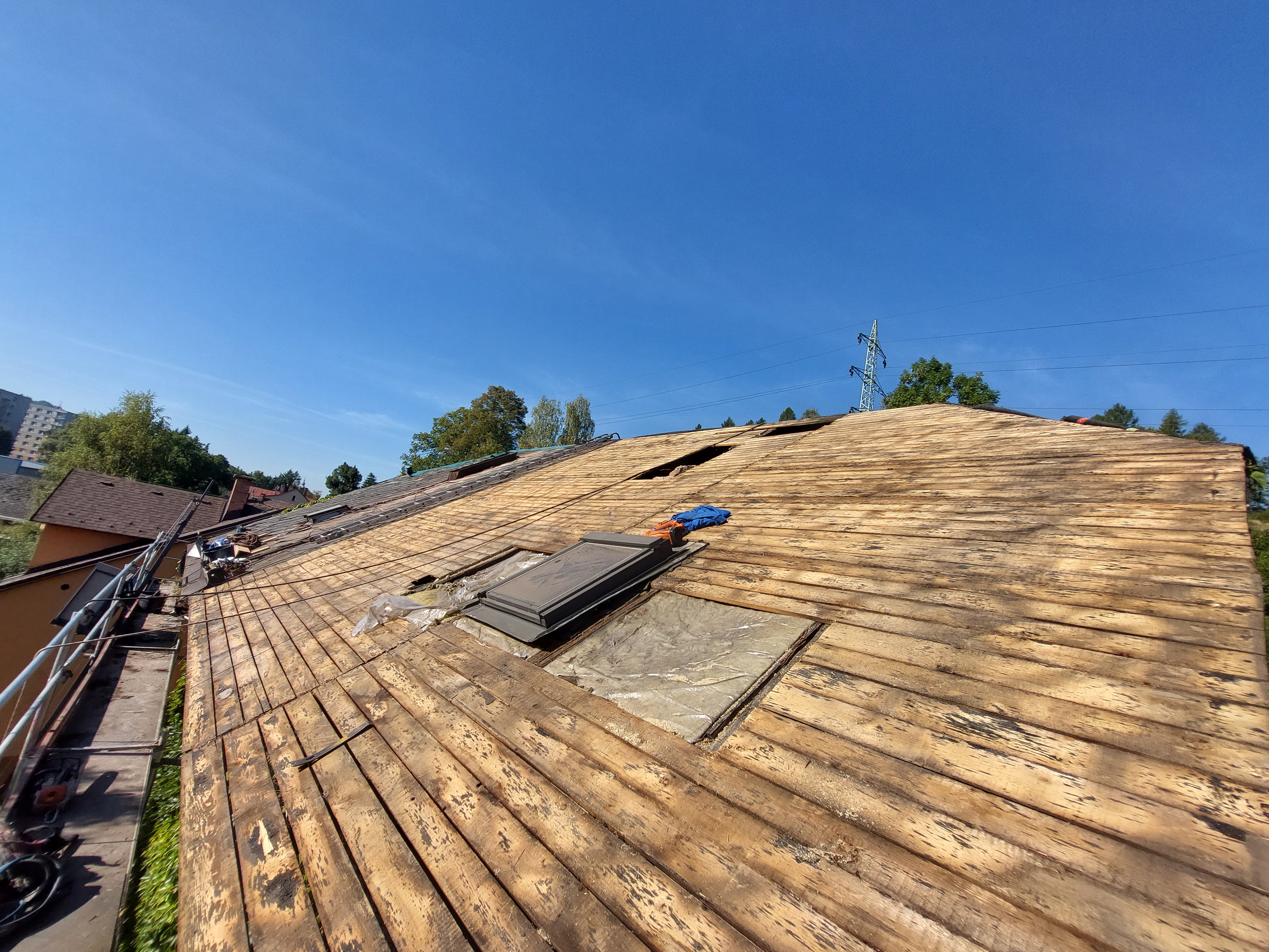 Dokončili jsme rekonstrukci staré, dožilé střechy. Součástí dodávky bylo demontáž eternitu, likvidace, výměna poškozených částí bednění, ošetření starých prken proti škůdcům nástřikem, dále jsme demontovali staré žlaby, oplechování. provedli jsme postupné odbourání komínů, výstavbu nových, včetně betonového věnce. dále byla provedena výměna výlezových vikýřů včetně odvětraného hřebene.