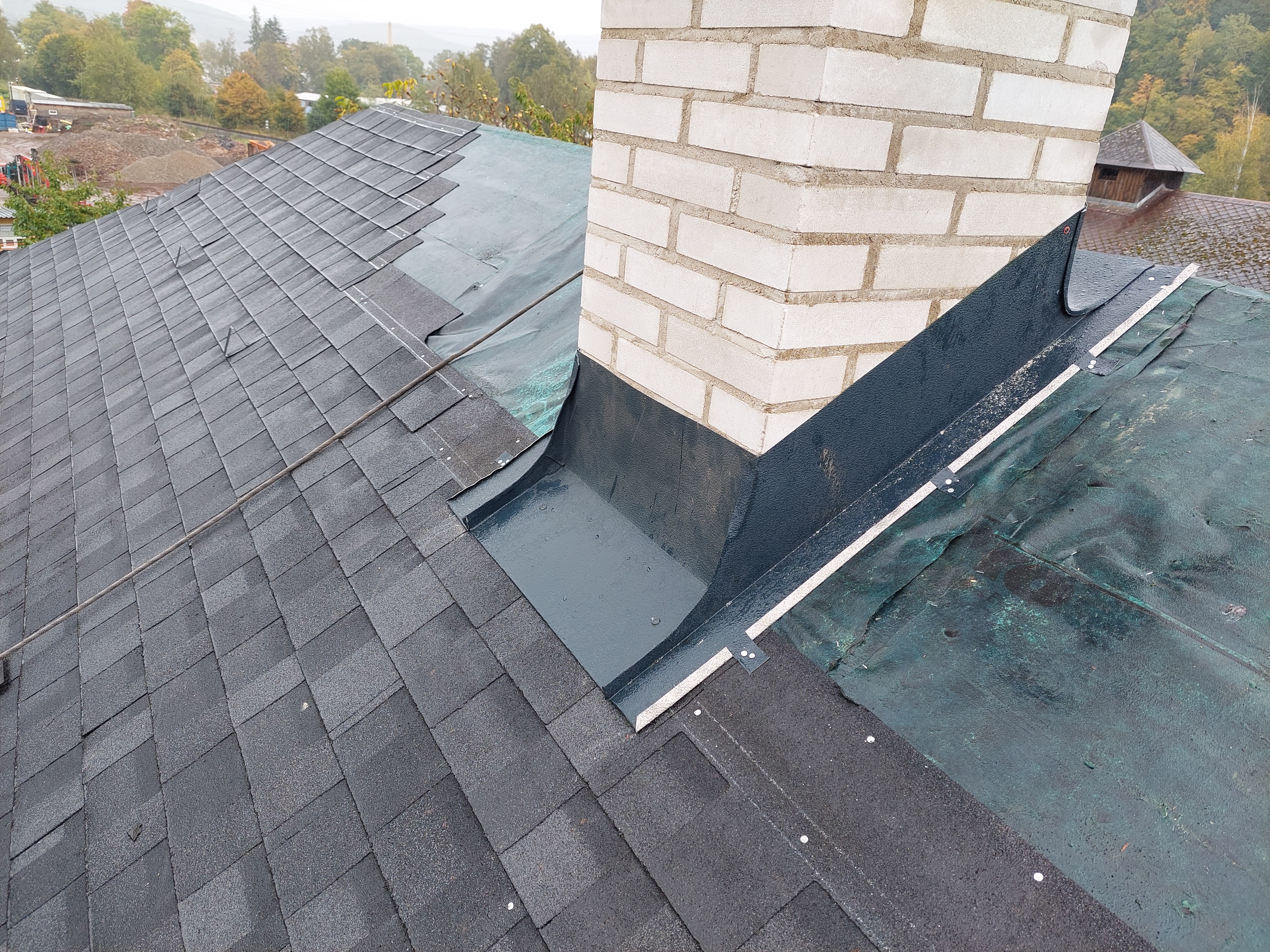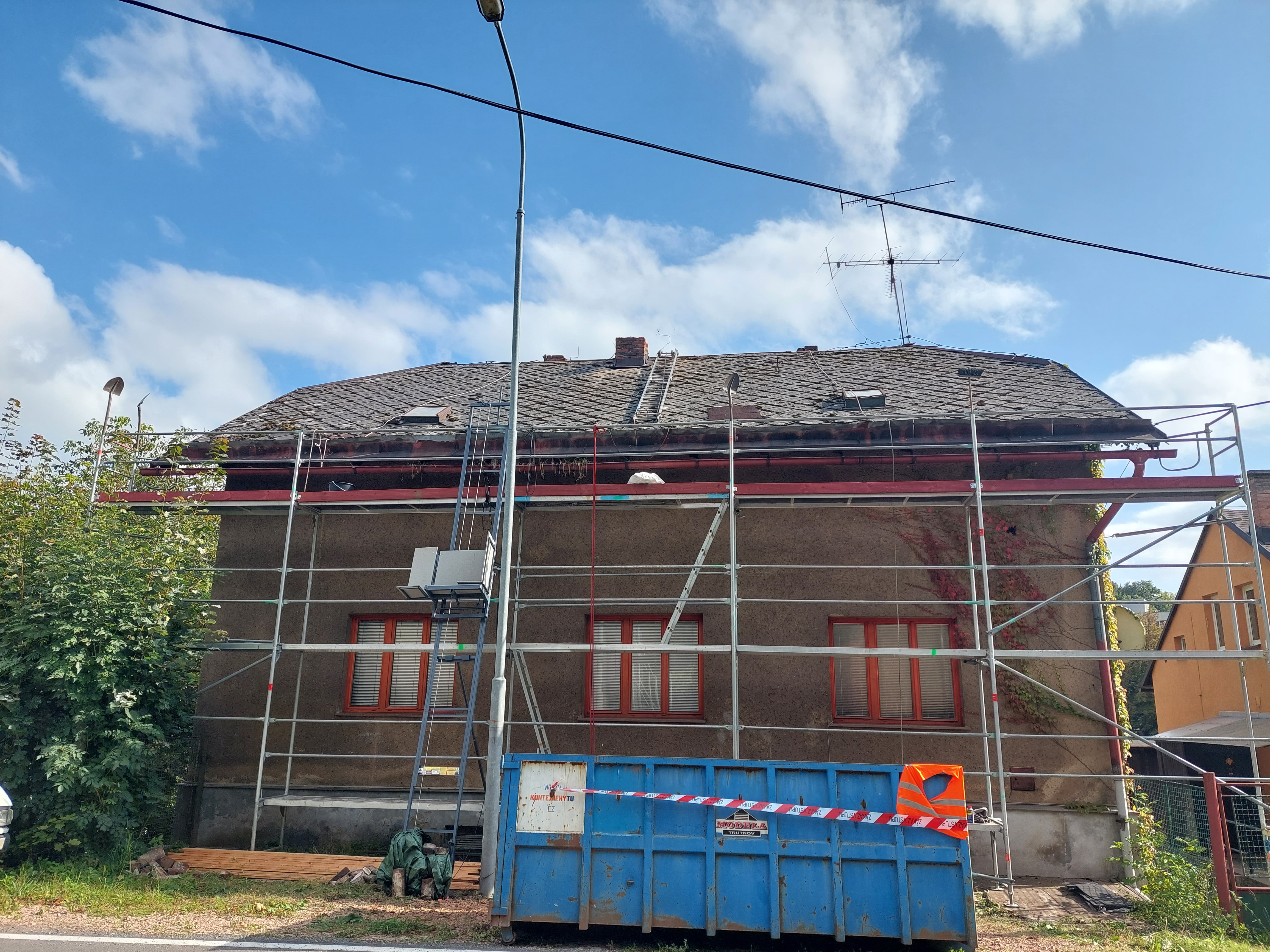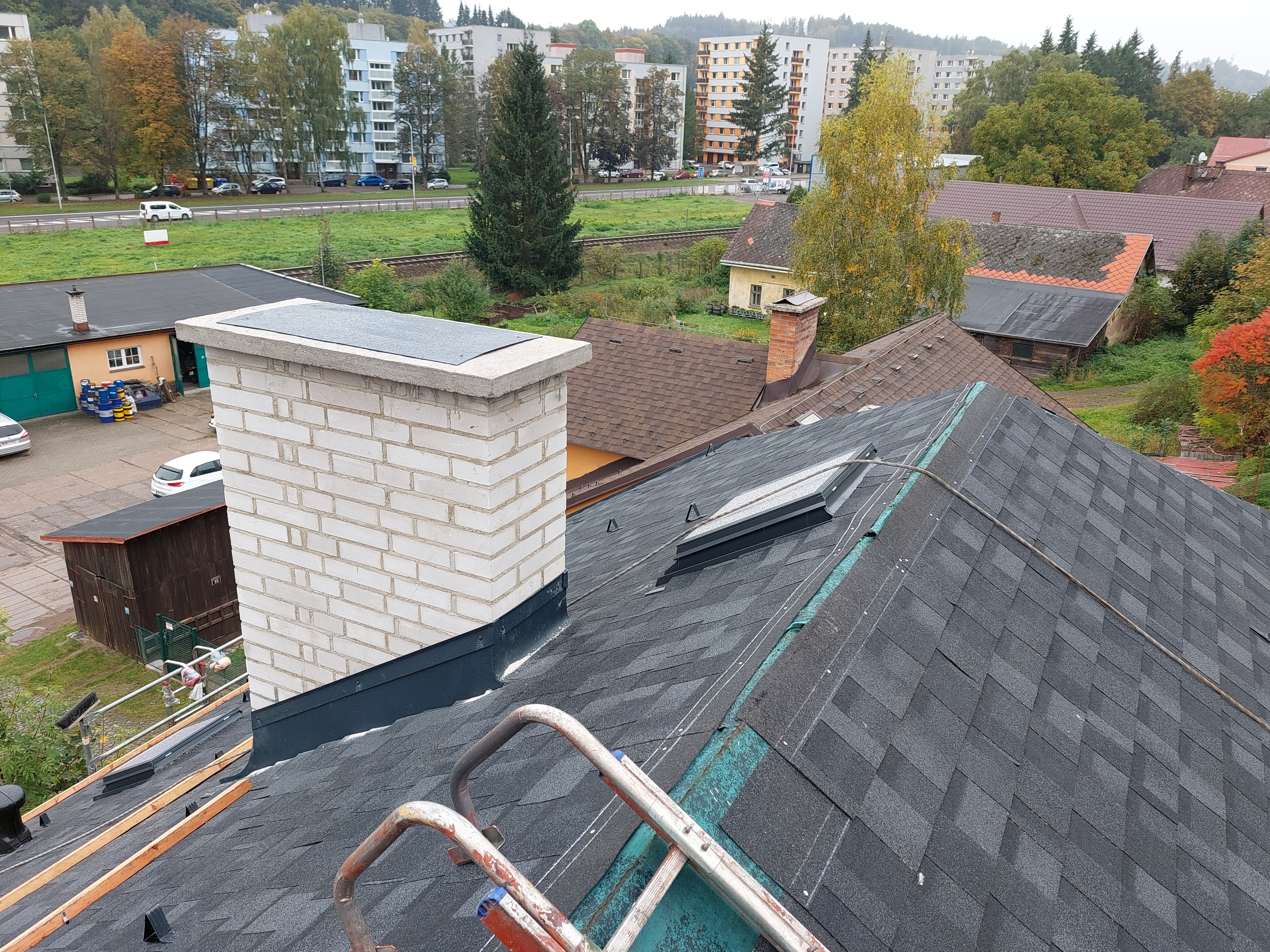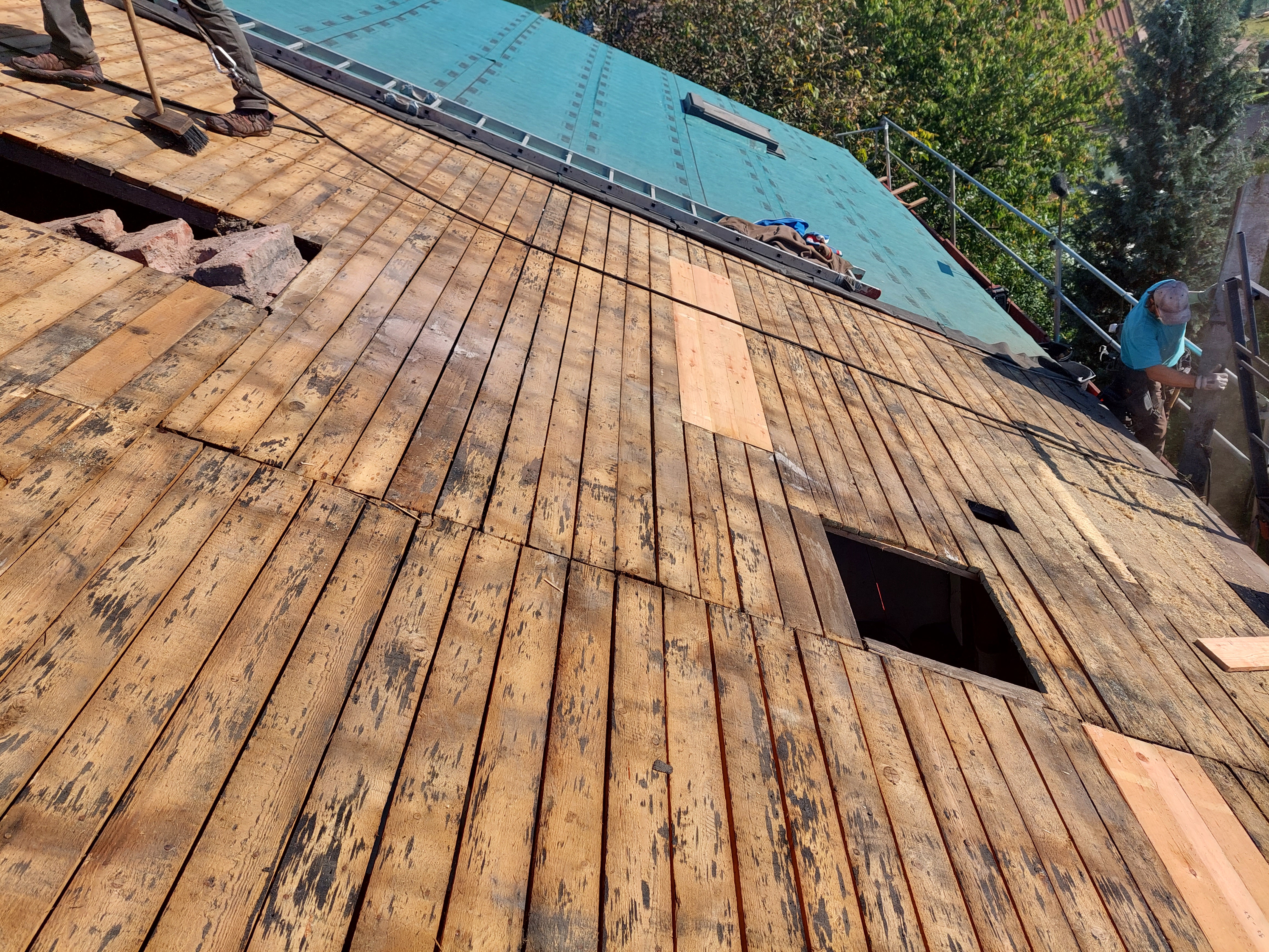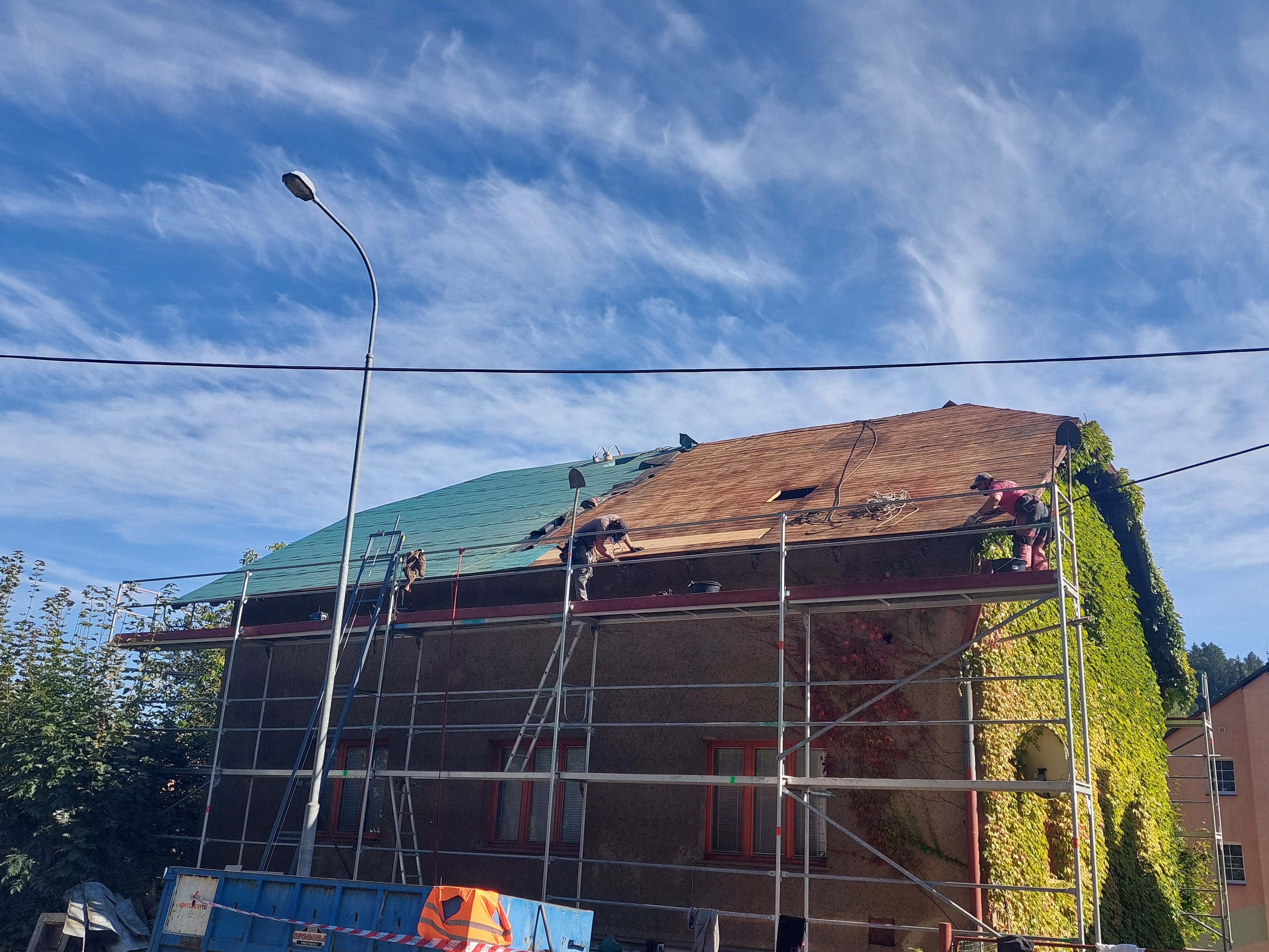 Dokončili jsme rekonstrukci staré, dožilé střechy. Součástí dodávky bylo demontáž eternitu, likvidace, výměna poškozených částí bednění, ošetření starých prken proti škůdcům nástřikem, dále jsme demontovali staré žlaby, oplechování. provedli jsme postupné odbourání komínů, výstavbu nových, včetně betonového věnce. dále byla provedena výměna výlezových vikýřů včetně odvětraného hřebene.