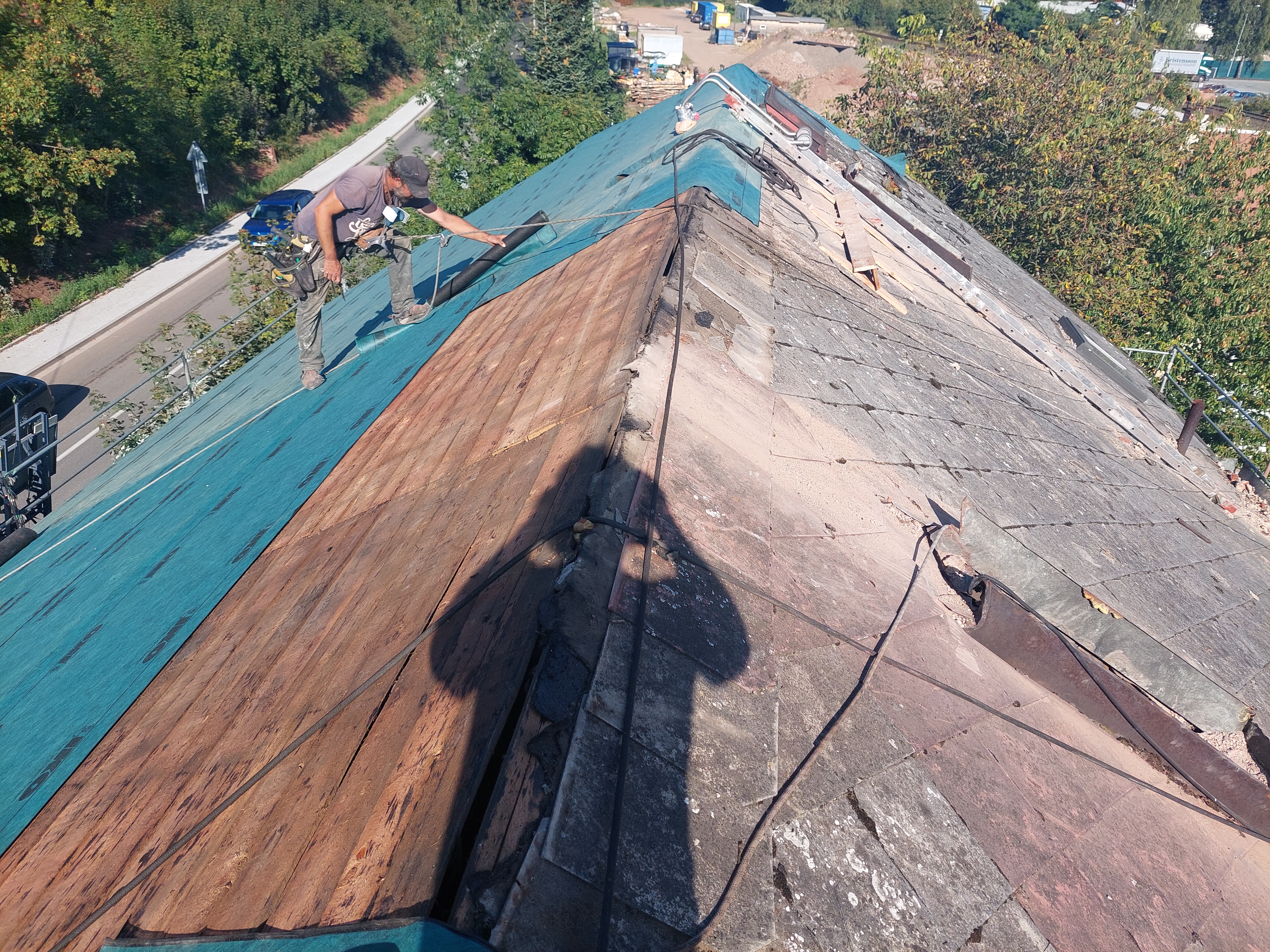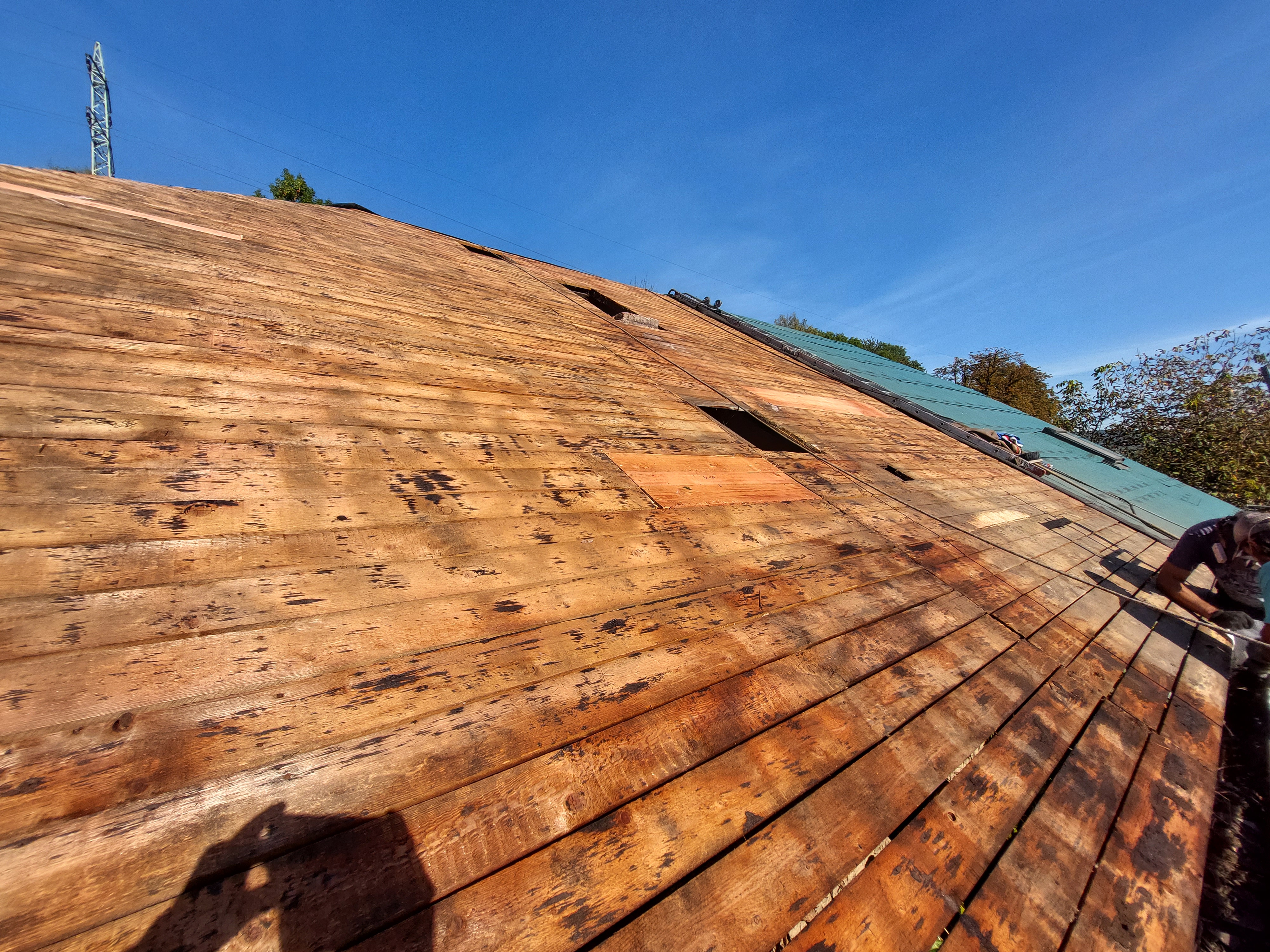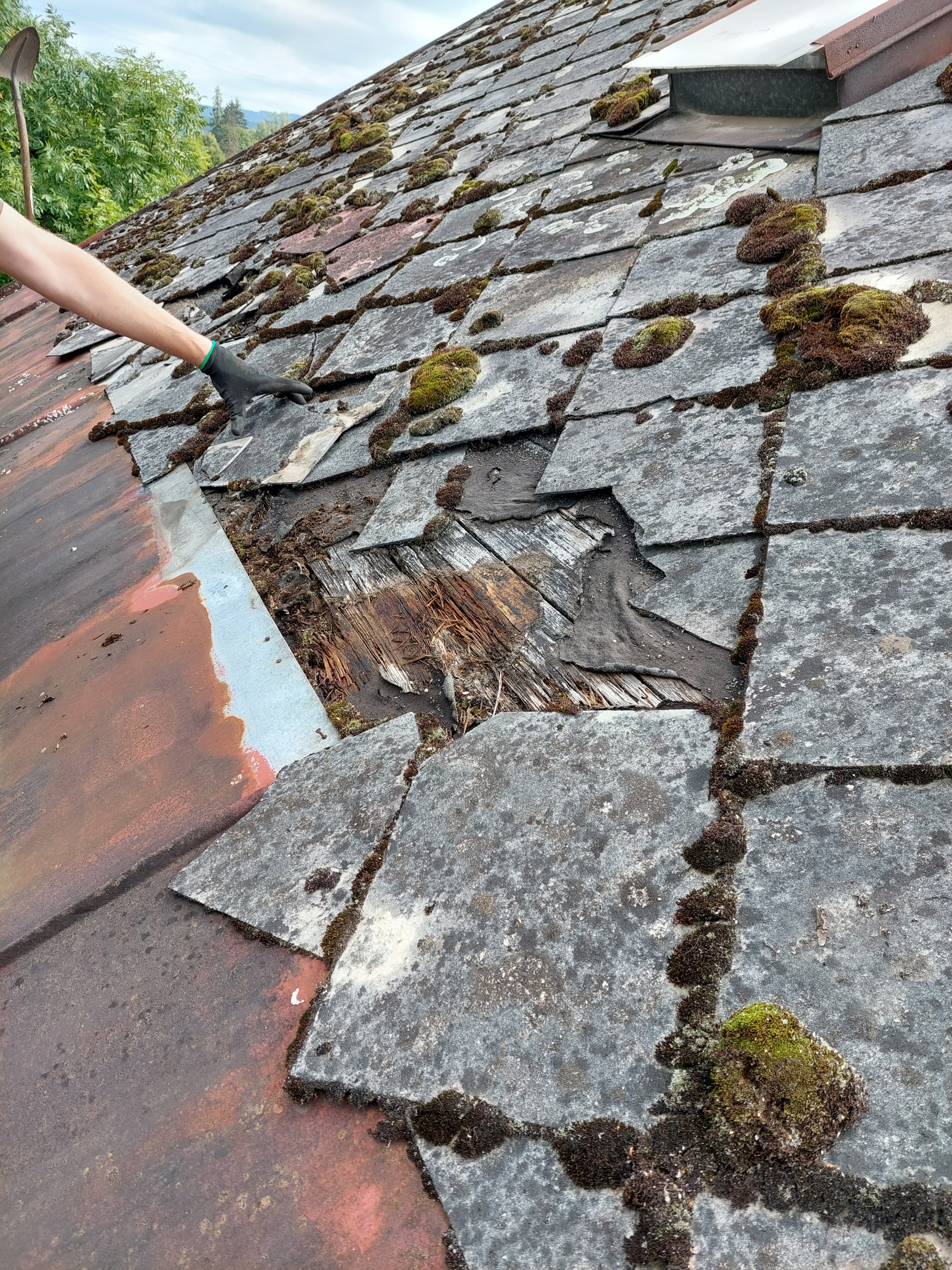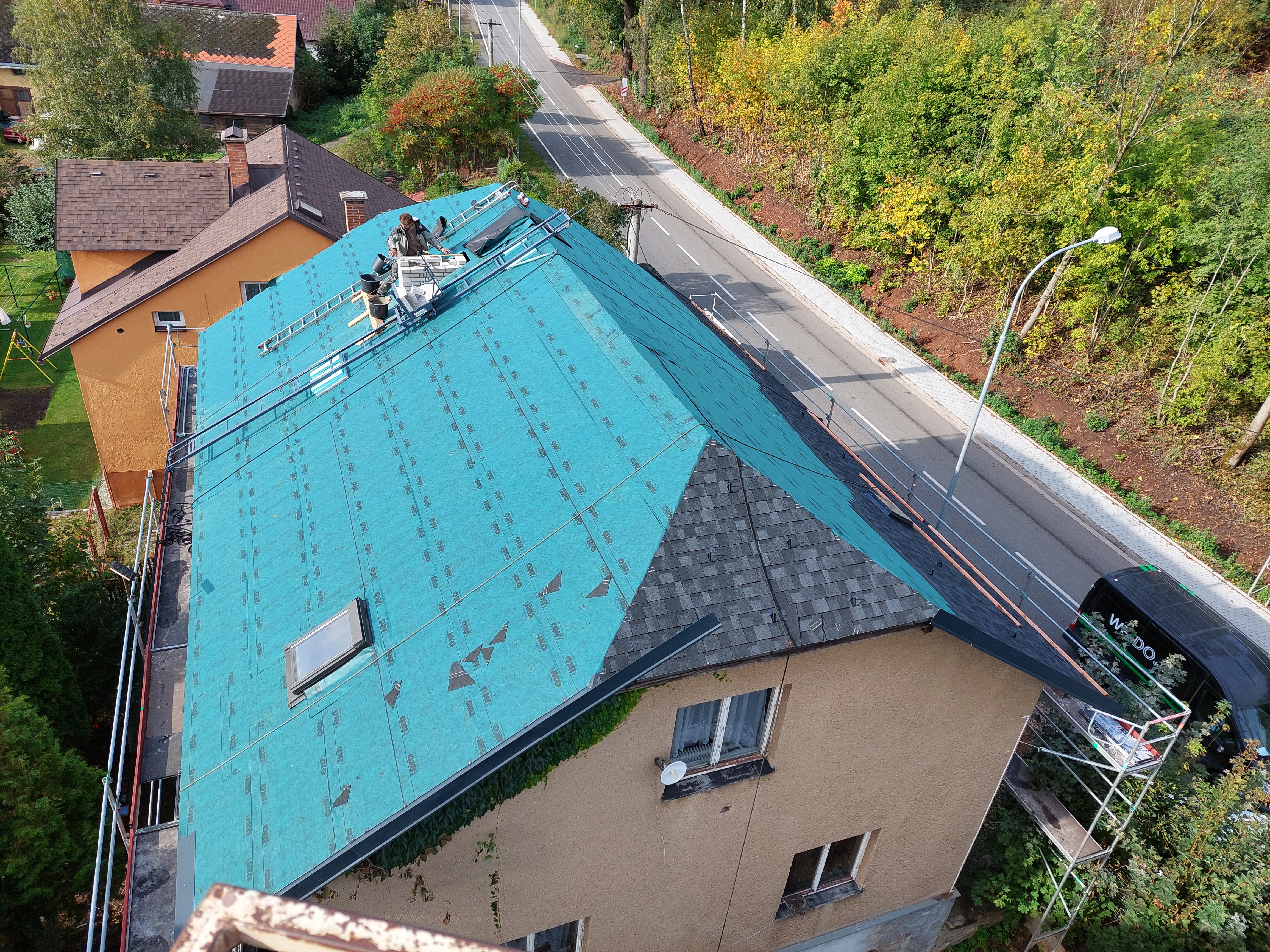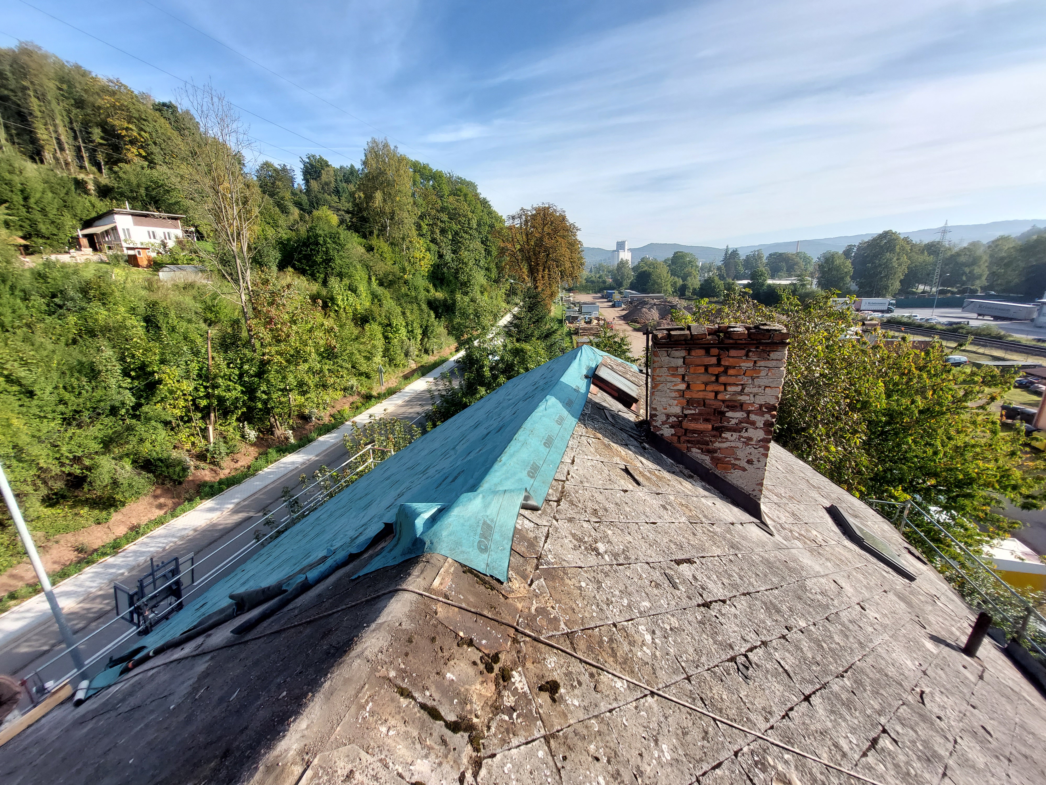 Dokončili jsme rekonstrukci staré, dožilé střechy. Součástí dodávky bylo demontáž eternitu, likvidace, výměna poškozených částí bednění, ošetření starých prken proti škůdcům nástřikem, dále jsme demontovali staré žlaby, oplechování. provedli jsme postupné odbourání komínů, výstavbu nových, včetně betonového věnce. dále byla provedena výměna výlezových vikýřů včetně odvětraného hřebene.
