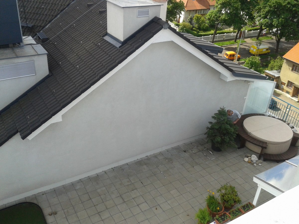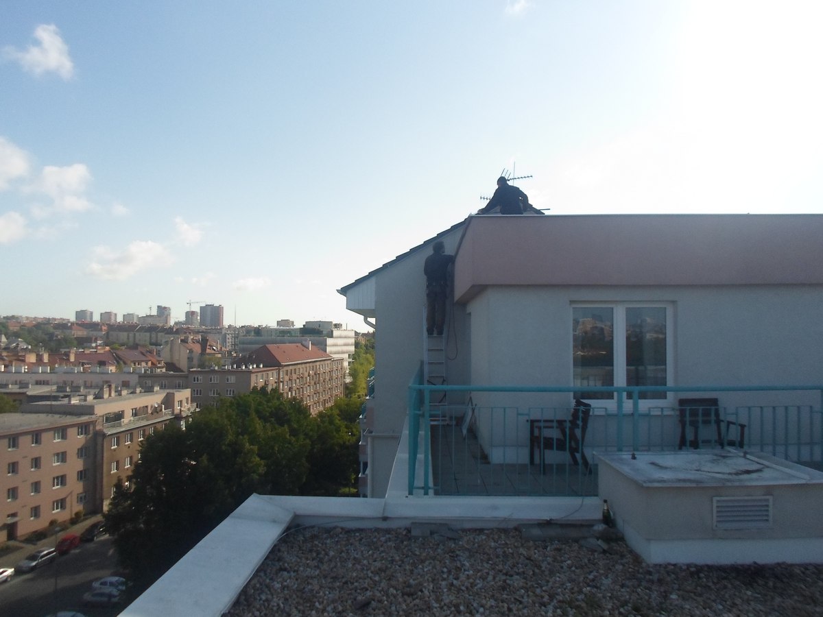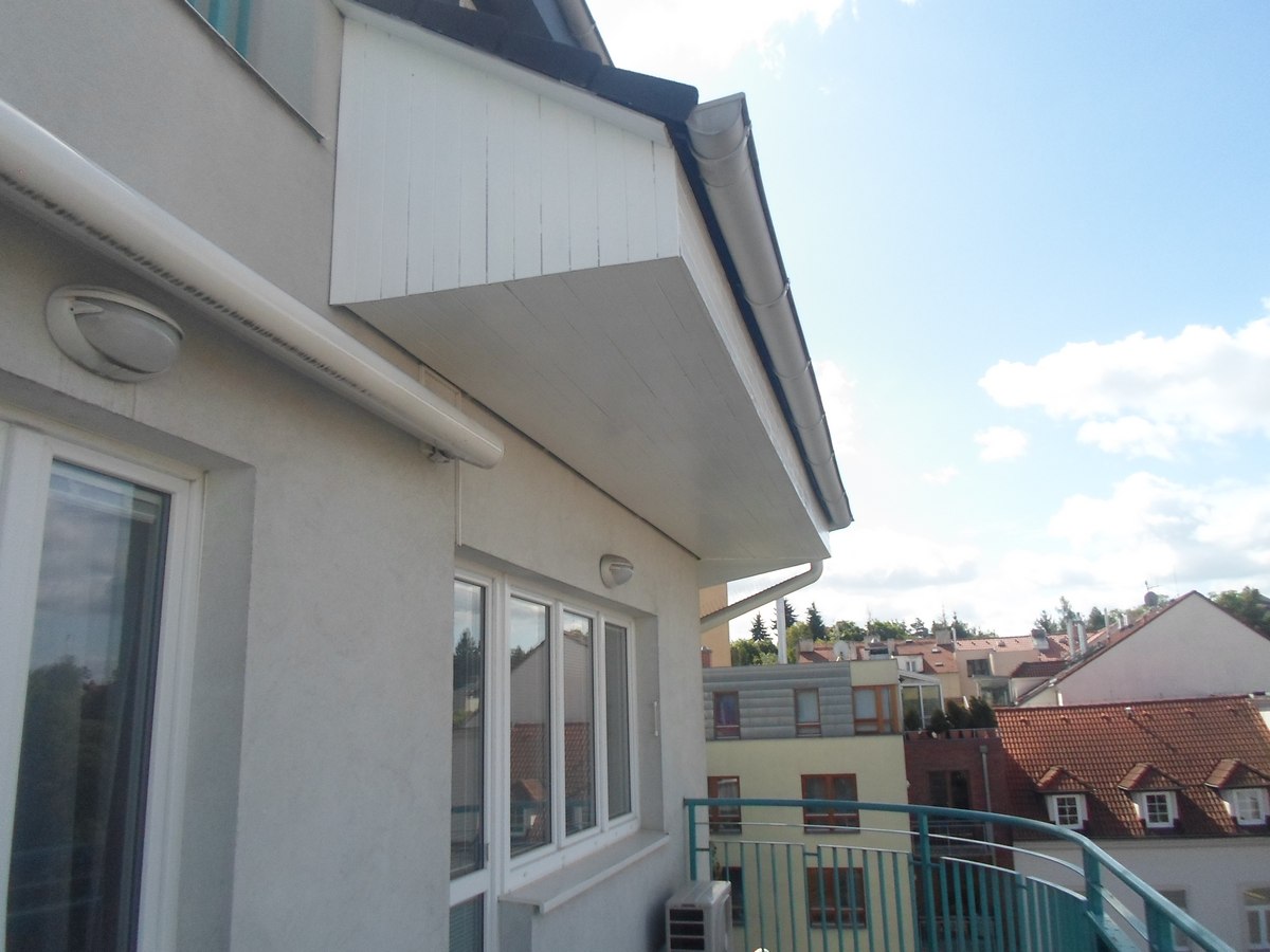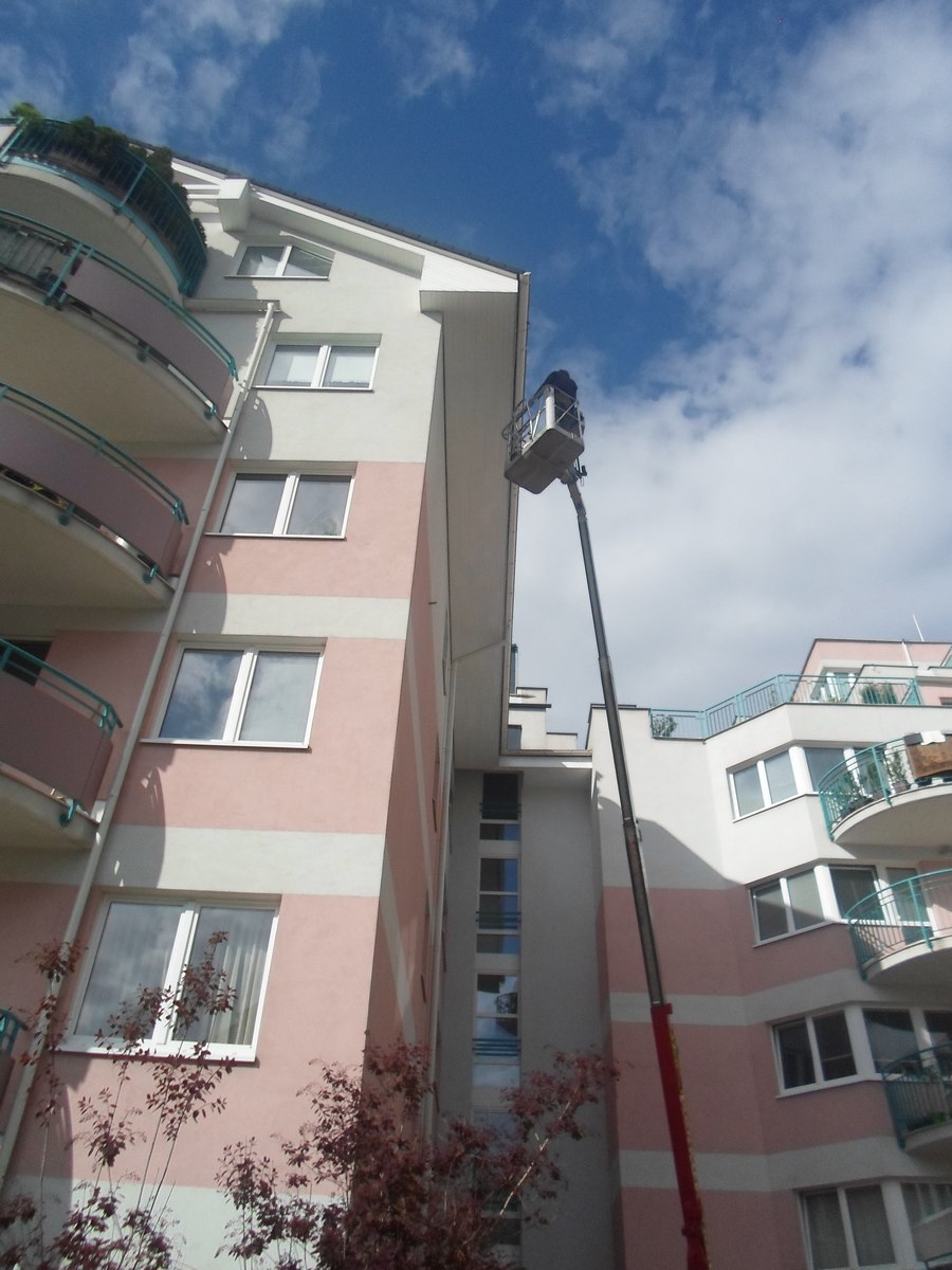Renovační nátěr alkyd akrylátovou barvou dřevěných konstrukcí střechy pomocí plošin a horolezcké techniky Praha Strašnice