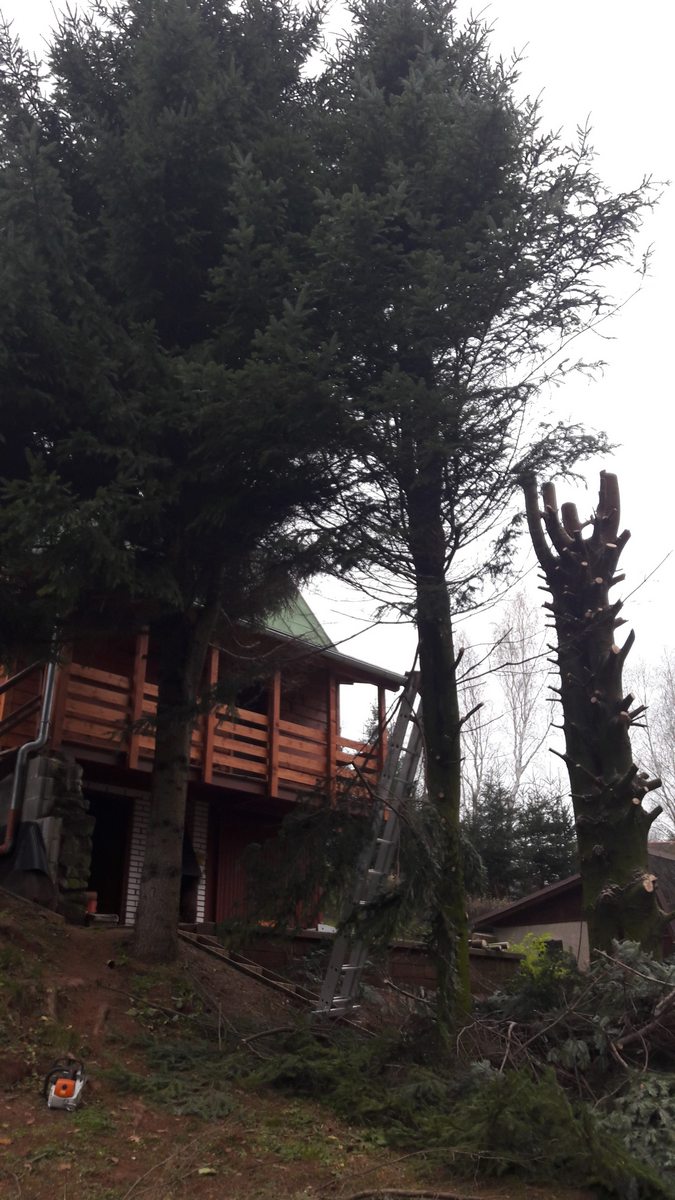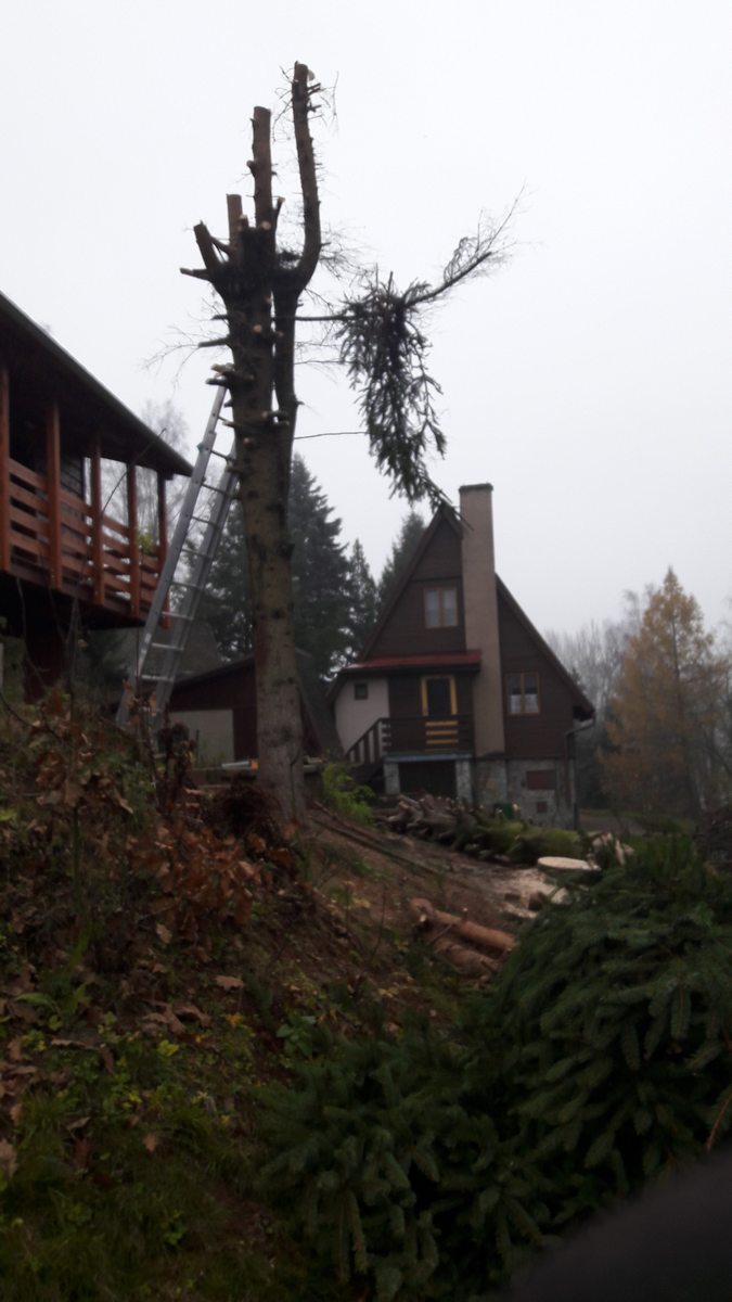 Rizikové kácení postupným odvětvením a nakrácení kmene, po té rozřezání na 1m špalky. jedle plus 2ks smrku.