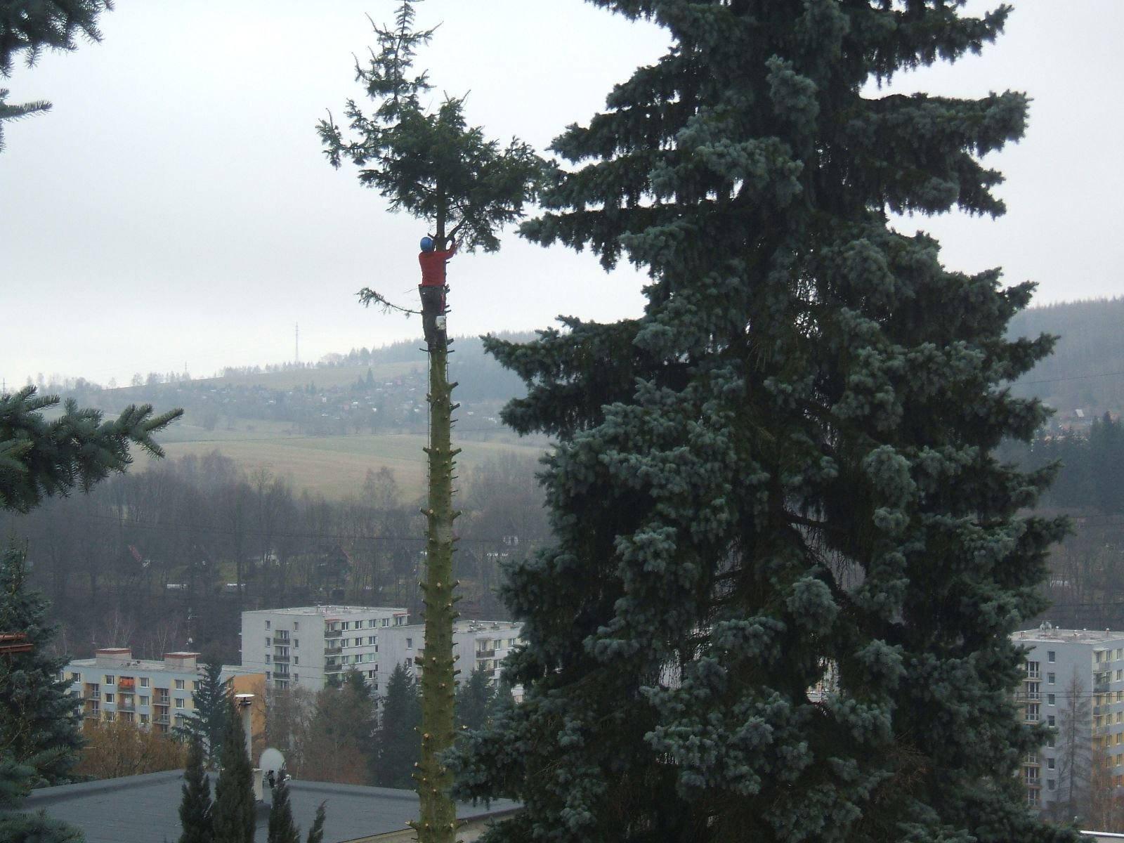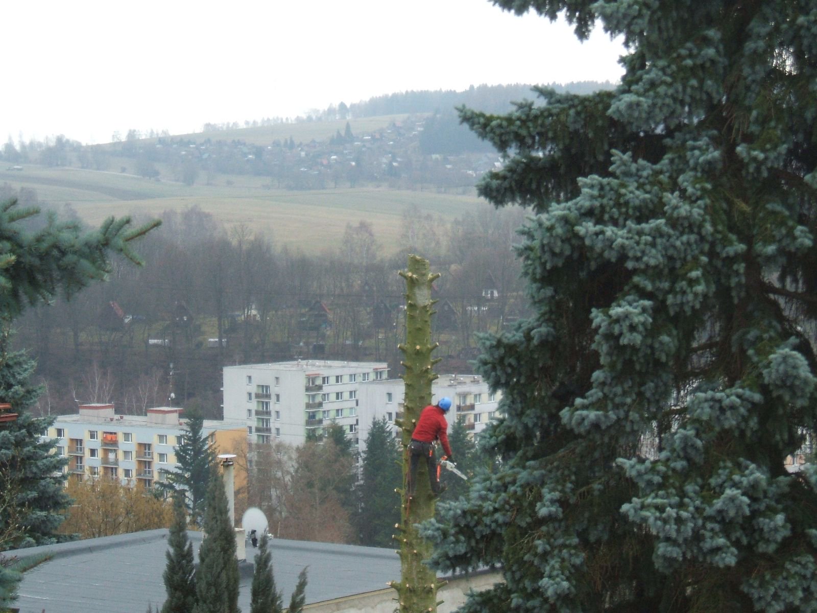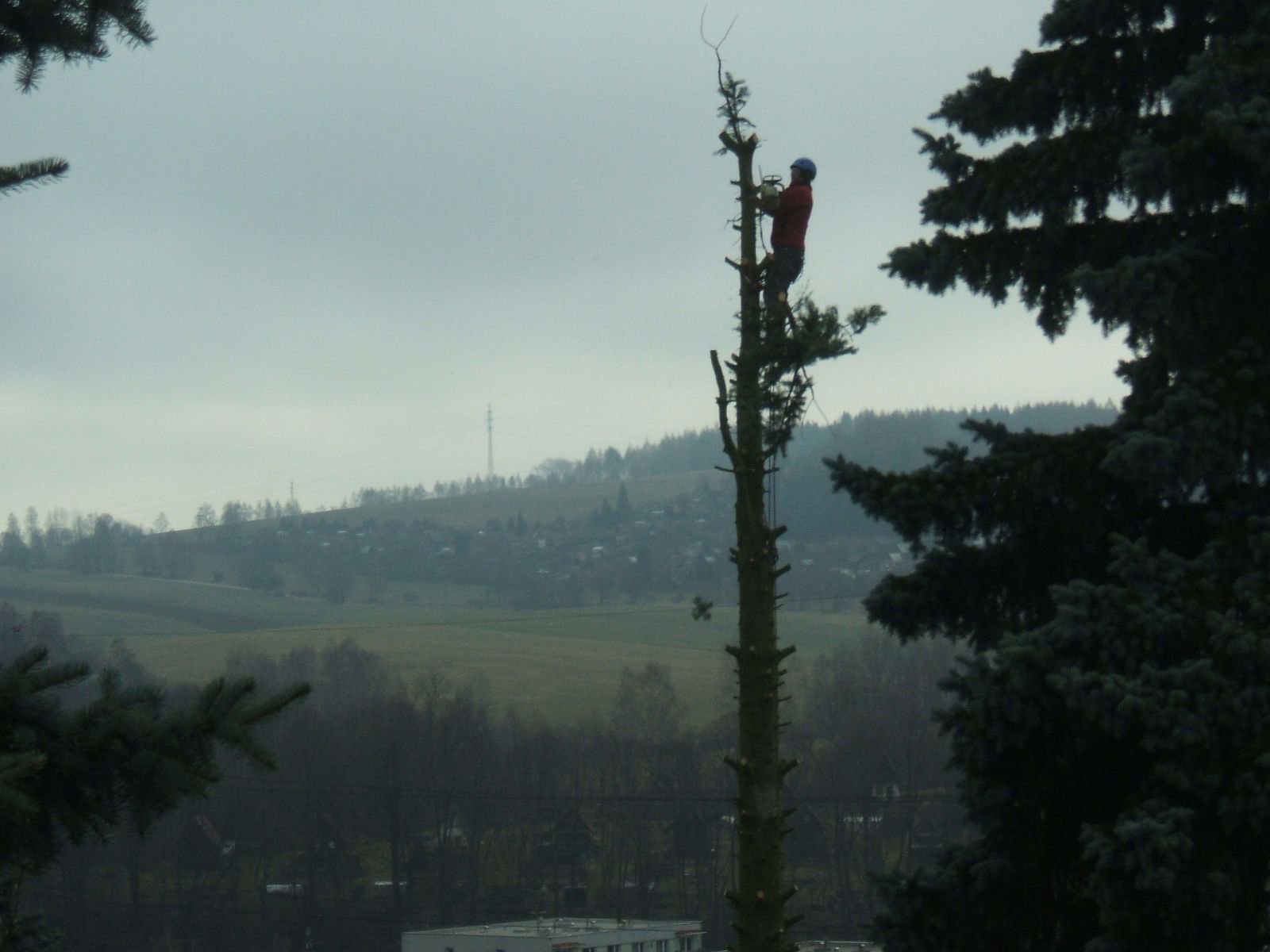 provedli jsme rizikové kácení 20m jedle, o průměru v dolní části 90cm, práce byli provedeny postupným kácením kmene