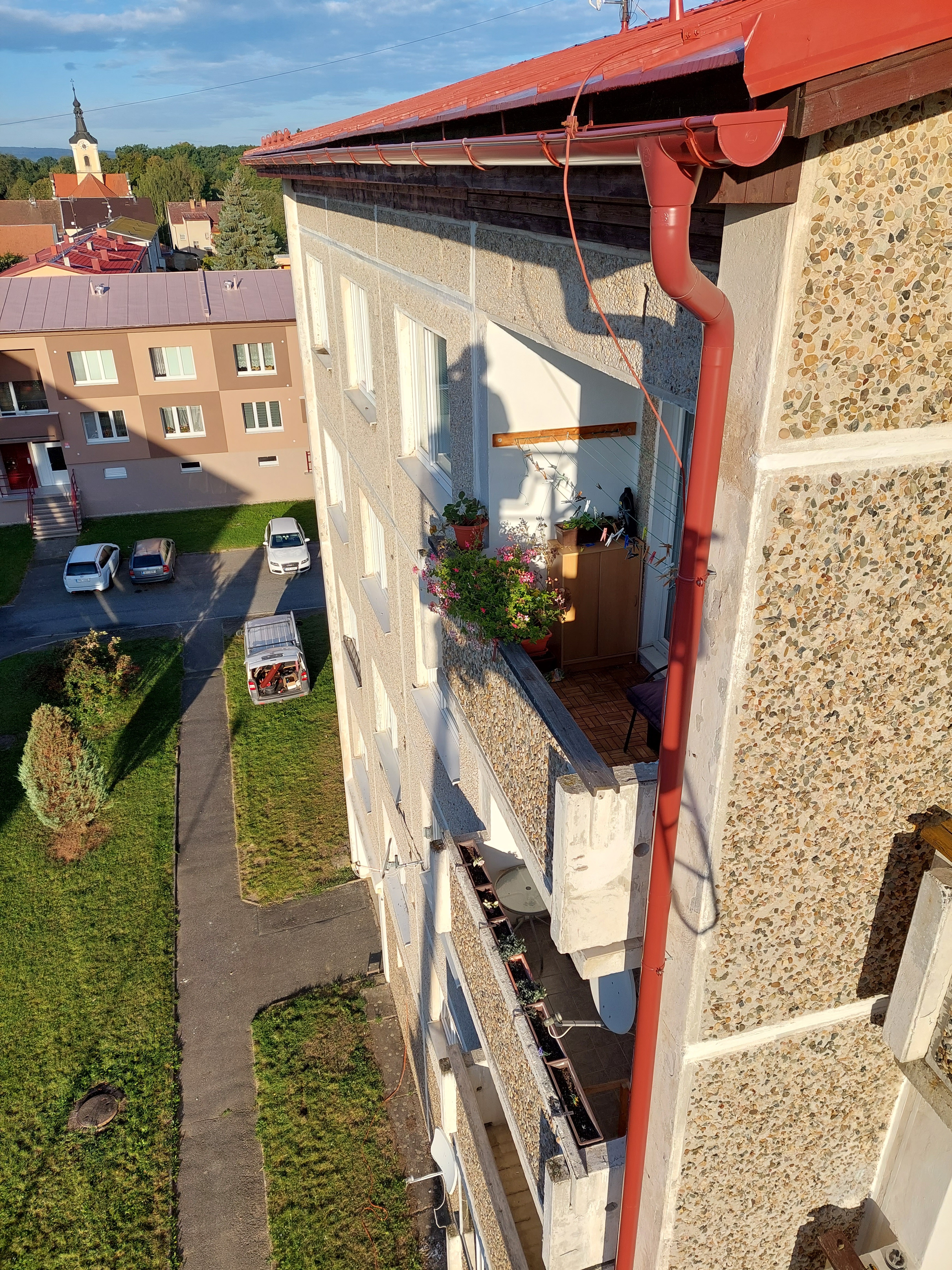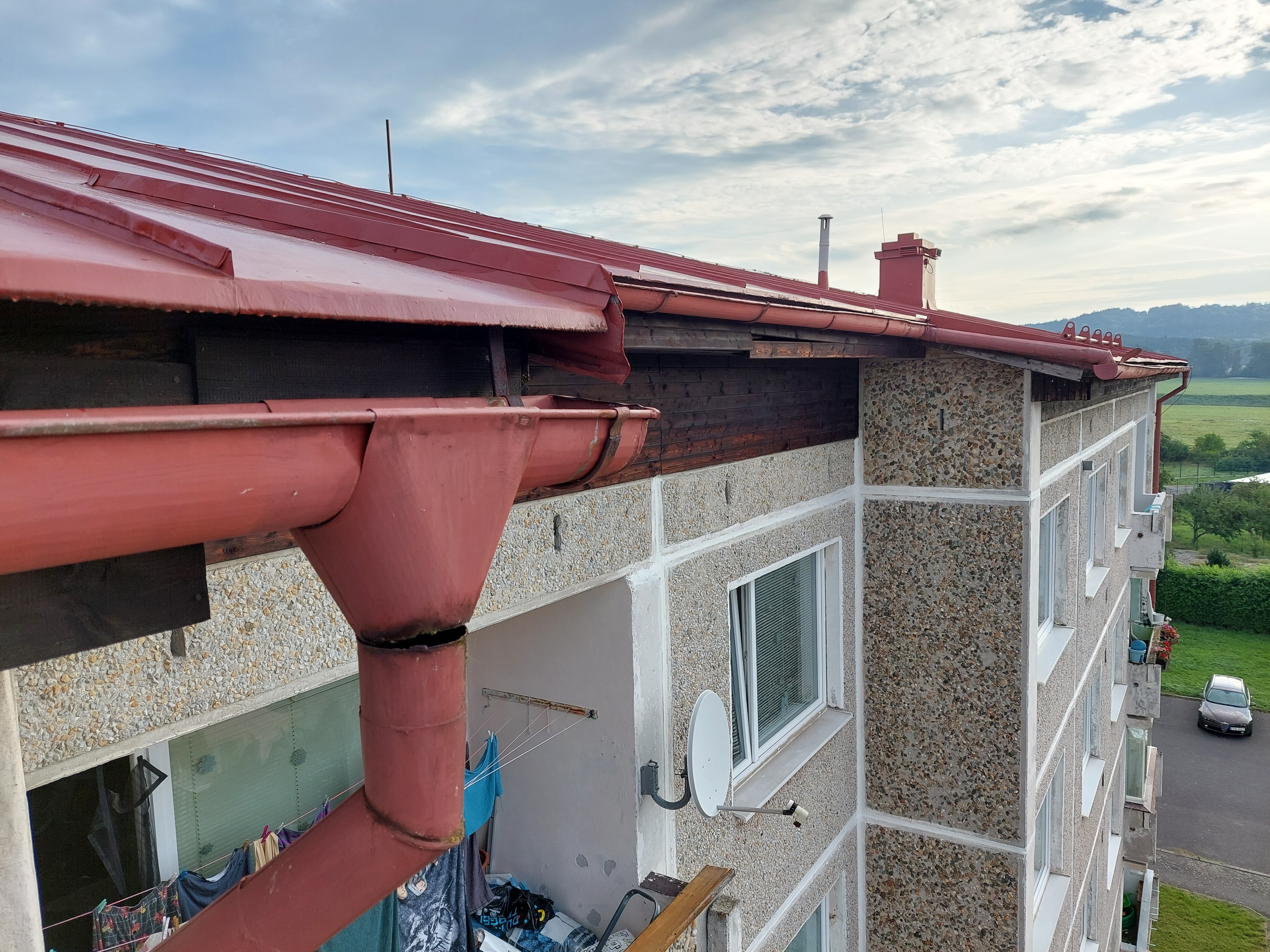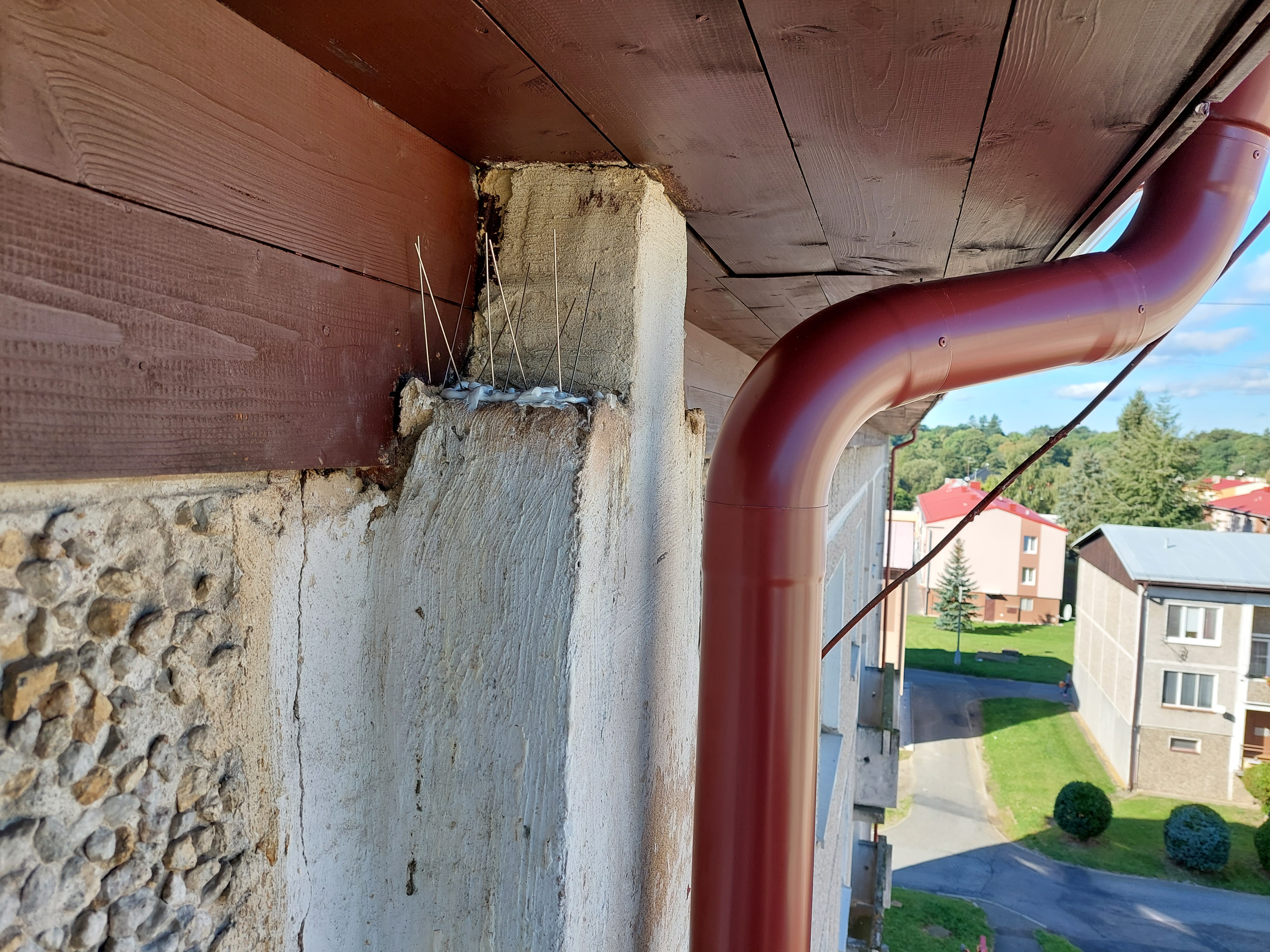 K tomu jsme vyměnily dožité zkorodované žlaby a svody, proběhla také renovace háků. Také jsme nainstalovali na 6místech hrotové zábrany proti ptactvu