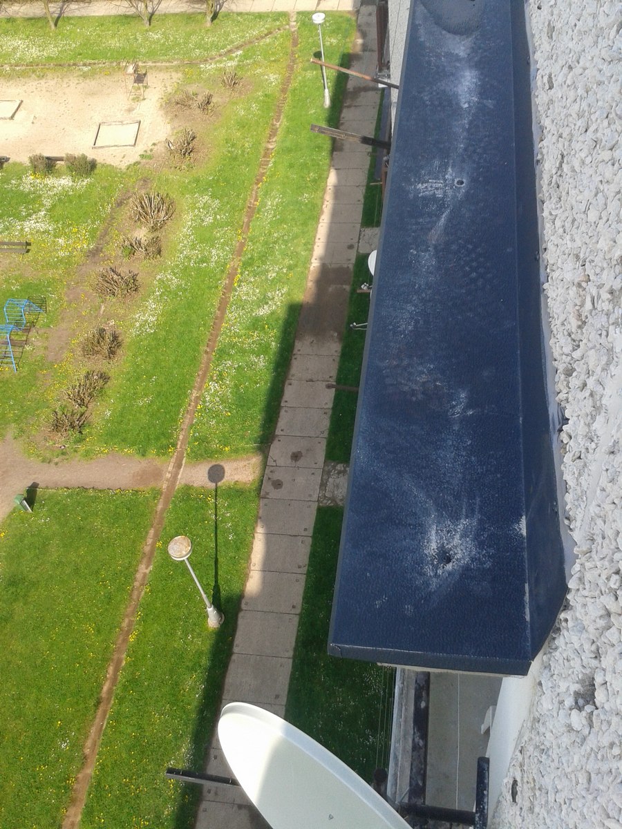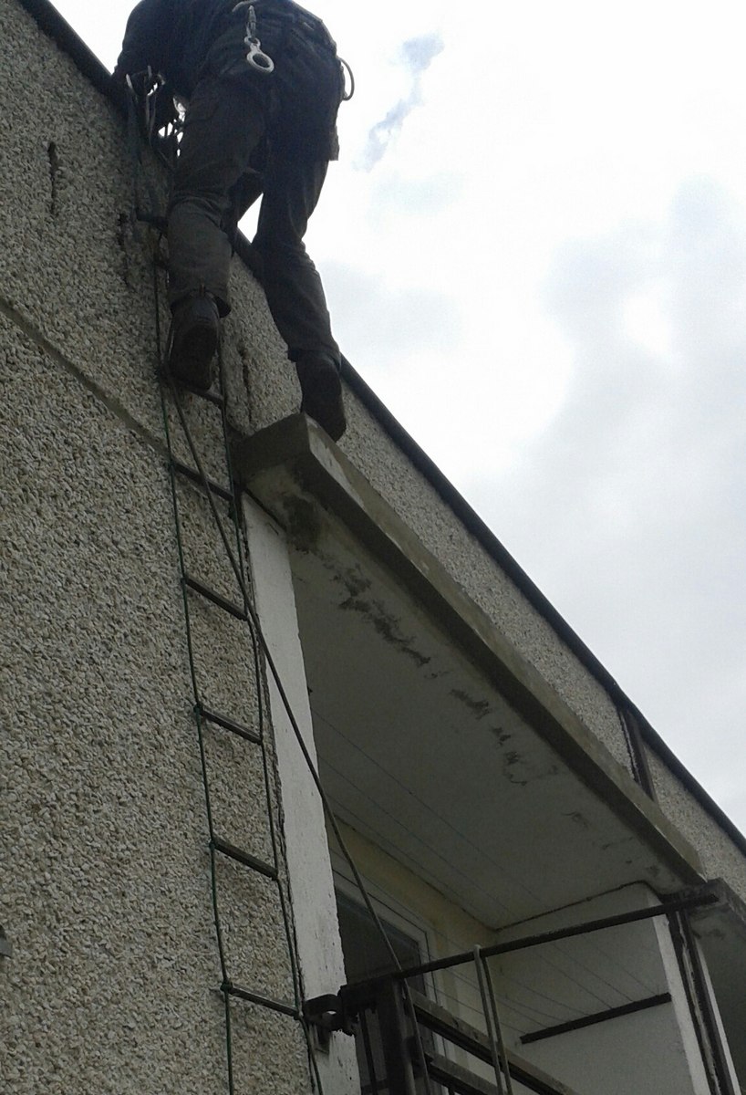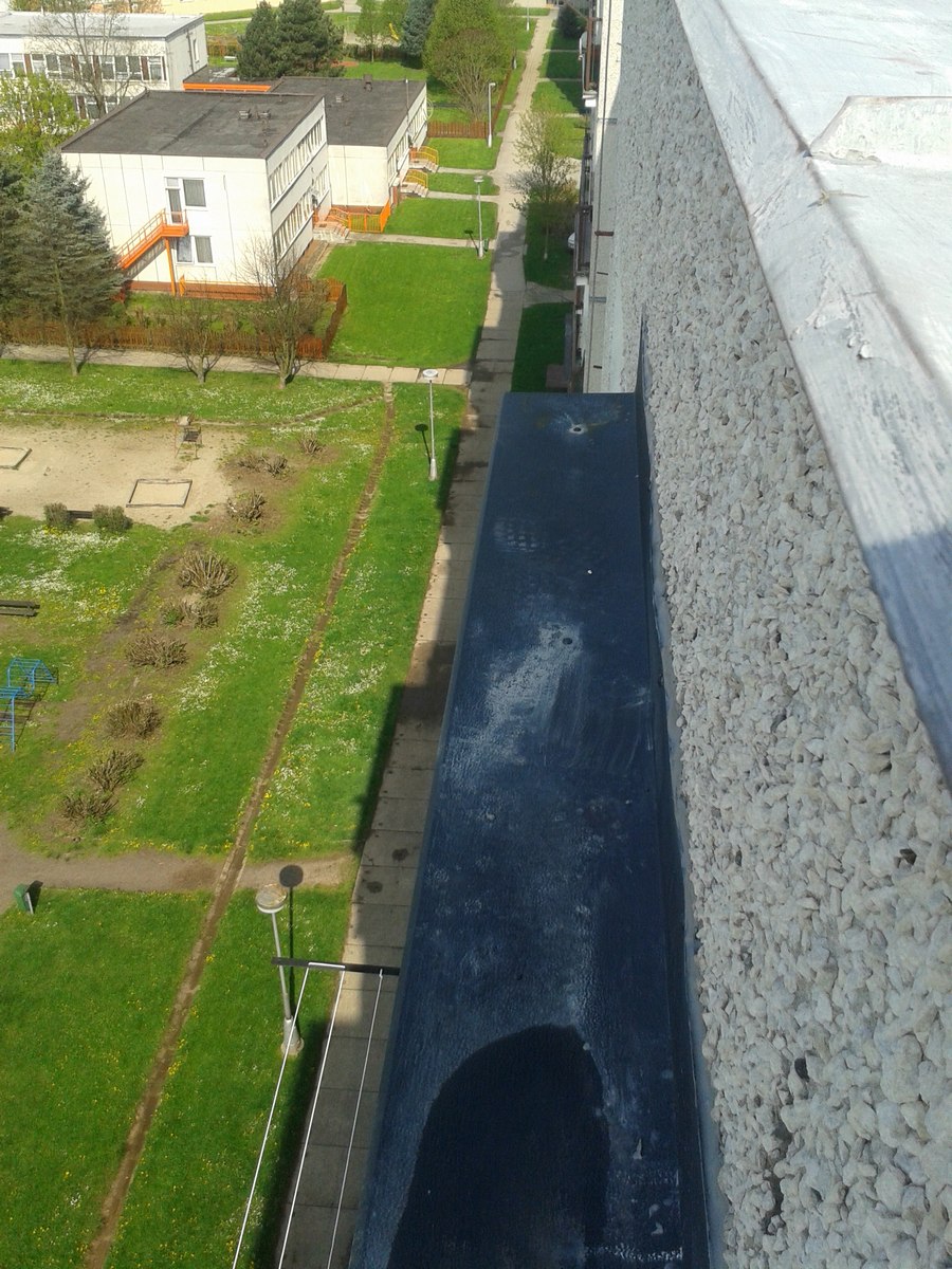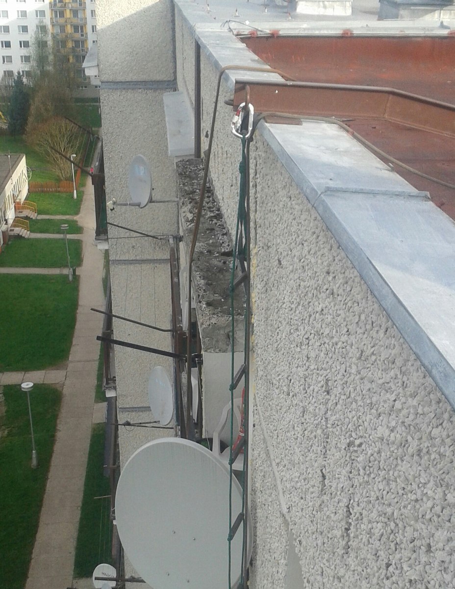 Výškové práce, oprava, oplechování stříšek panelového domu
